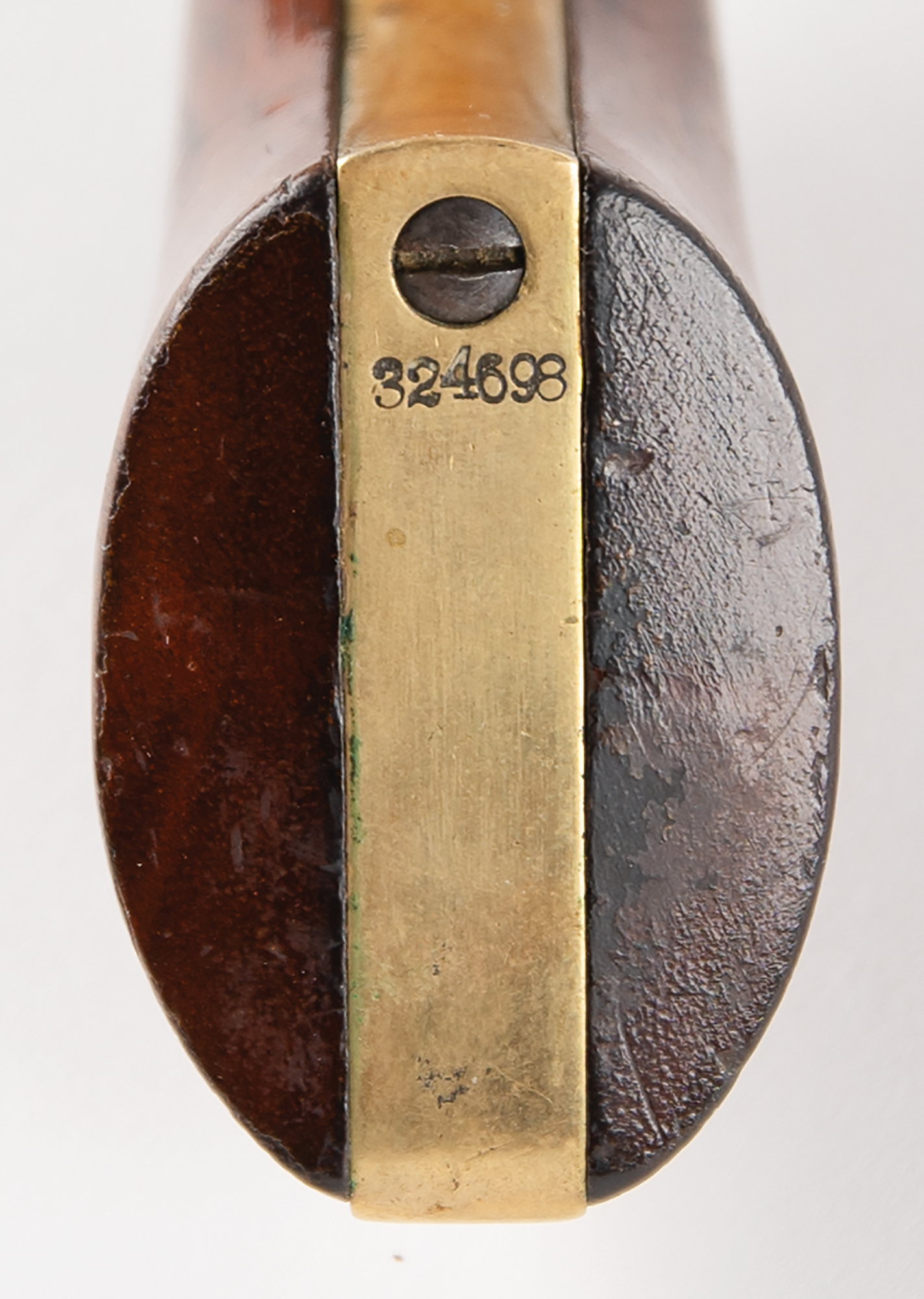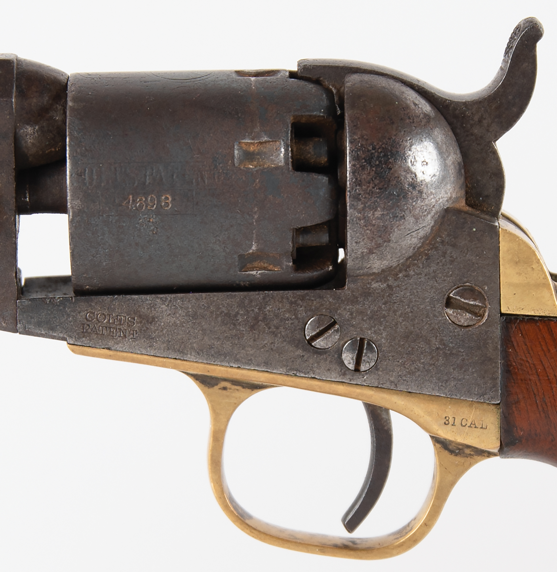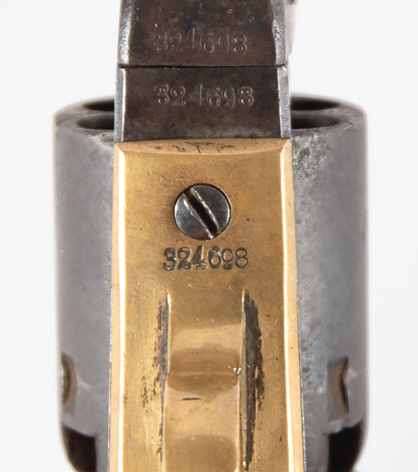 Colt Model 1849 Pocket Revolver, serial #324698, .31 caliber, 4" barrel with a good bore that has dark pitting within the grooves. This is an 1870-made, six-shot variant revolver that has matching numbers on the frame, barrel, cylinder, trigger guard, backstrap, and arbor, and no visible numbers on the wedge or loading lever. The barrel, frame, and cylinder have a dark, plum-brown patina throughout, with thin gray fading along the high edges and projections, as well as some mild pitting scattered throughout. Traces of the cylinder scene remain visible on the cylinder, and one of the nipples is no longer present. The brass trigger guard and backstrap have been cleaned to a pale yellow-ochre patina, with some dark traces of original silver remaining on protected areas of the trigger guard bow, and the walnut grip is in good shape with minor handling marks and blemishes scattered about the old varnish. The action is partially functional, with the hammer catching firmly at half and full-cock, but the cylinder no longer advances. This is a fair post-Civil War ‘49 Pocket overall.