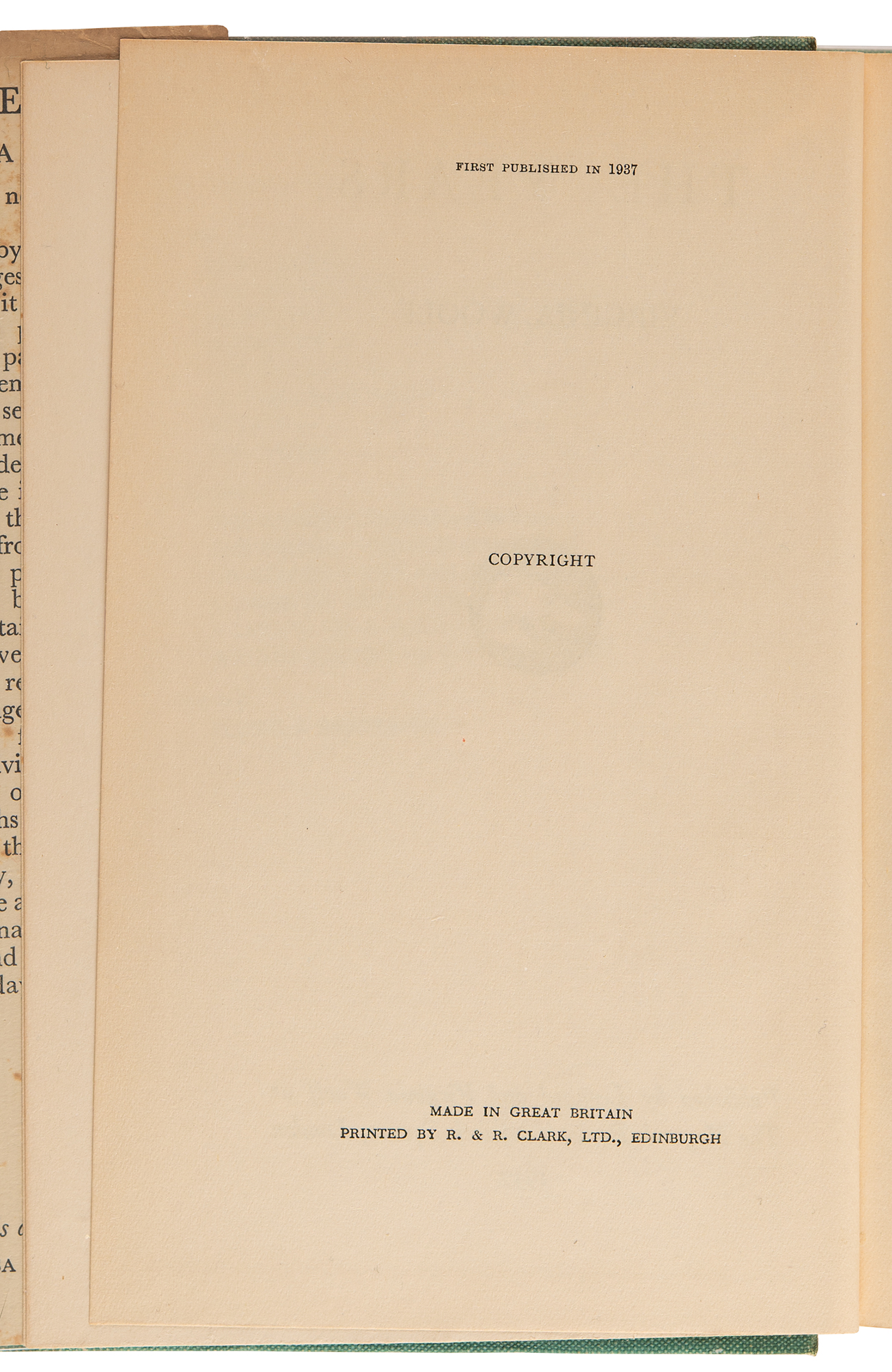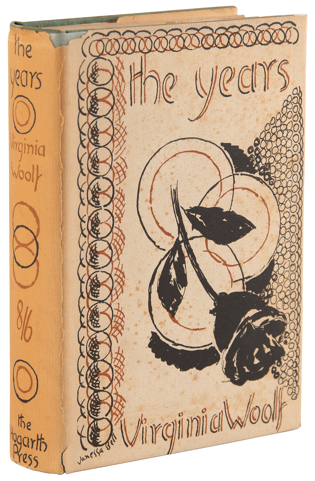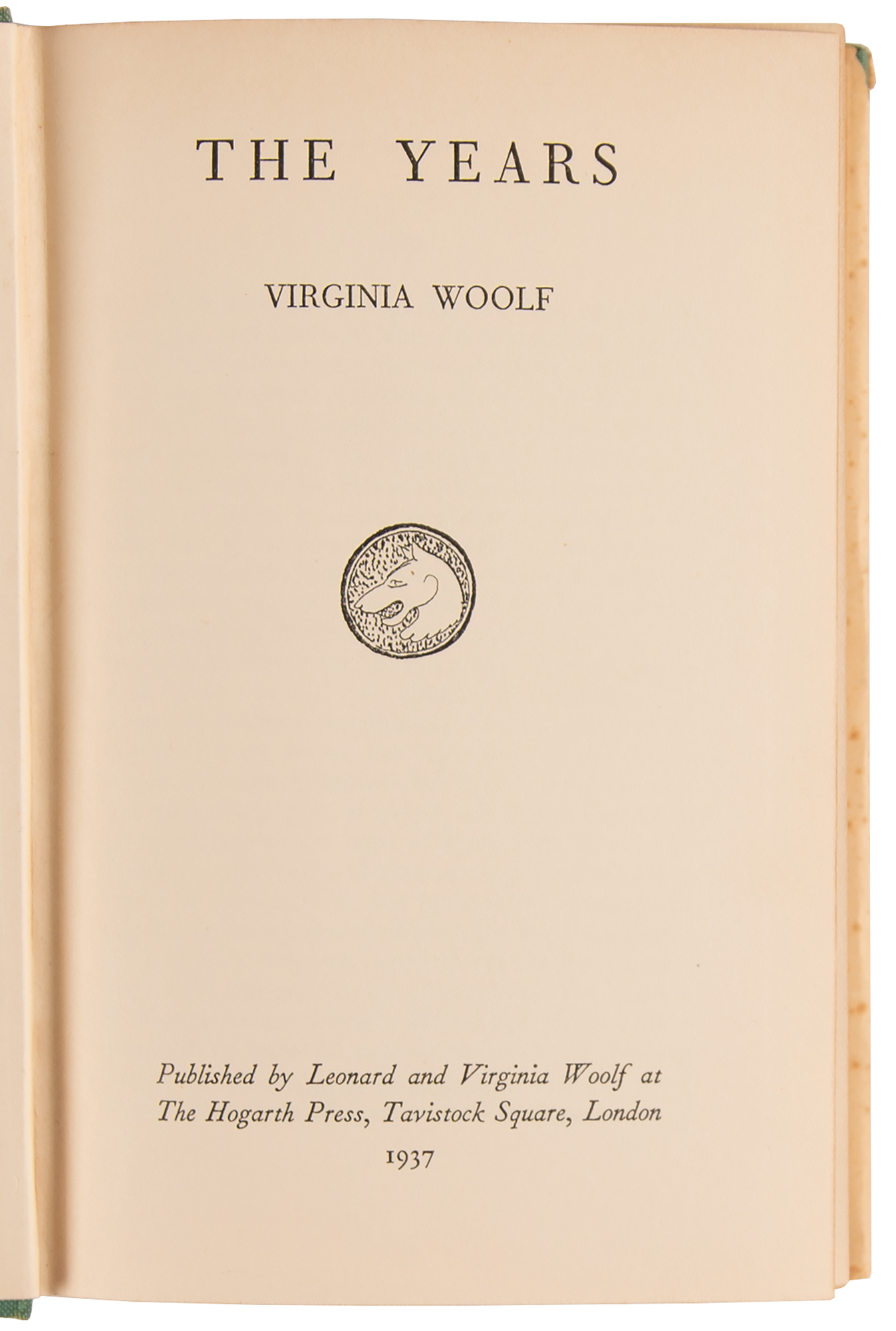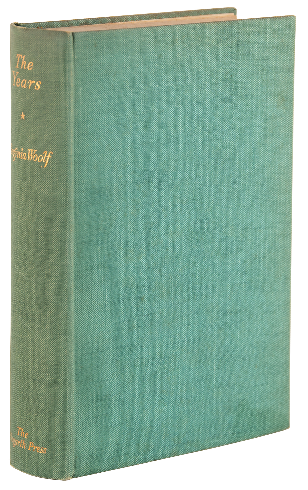 First edition book: The Years by Virginia Woolf. First edition, first printing. London: The Hogarth Press, 1937. Hardcover bound in the publisher's green cloth with gilt-titled spine, with first-issue dust jacket, 5 x 7.5, 469 pages. Book condition: VG/G+, with light foxing to endpapers, overall foxing to the jacket, and archival tape repair to chips at head of jacket's spine.