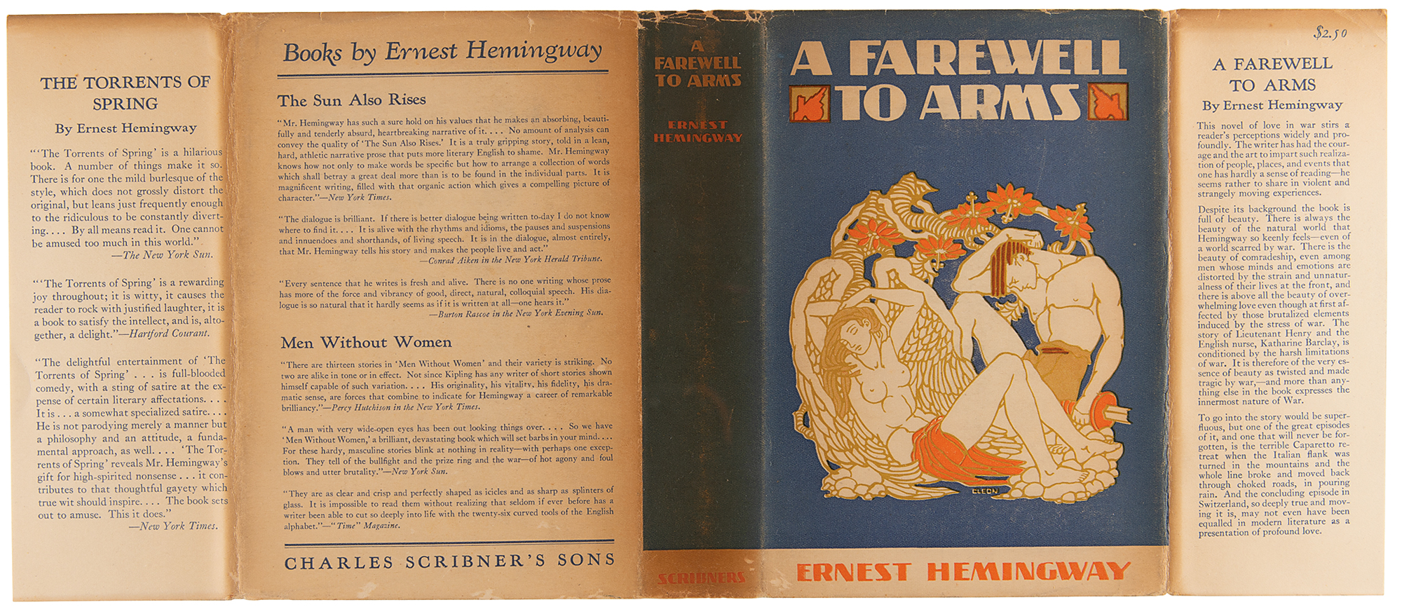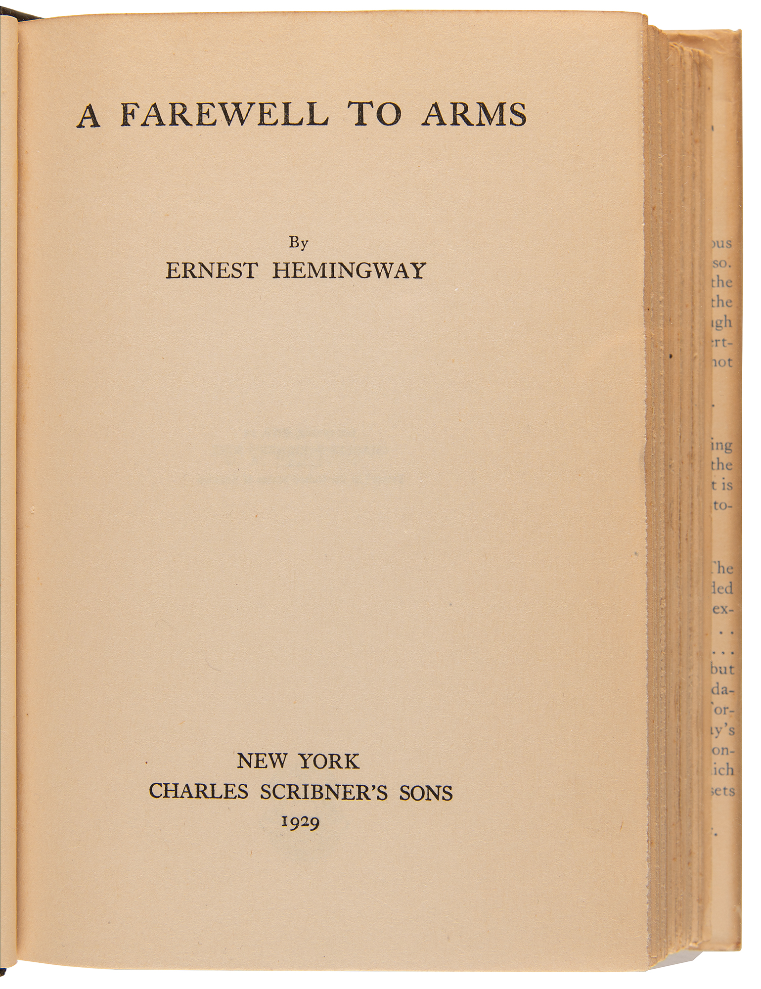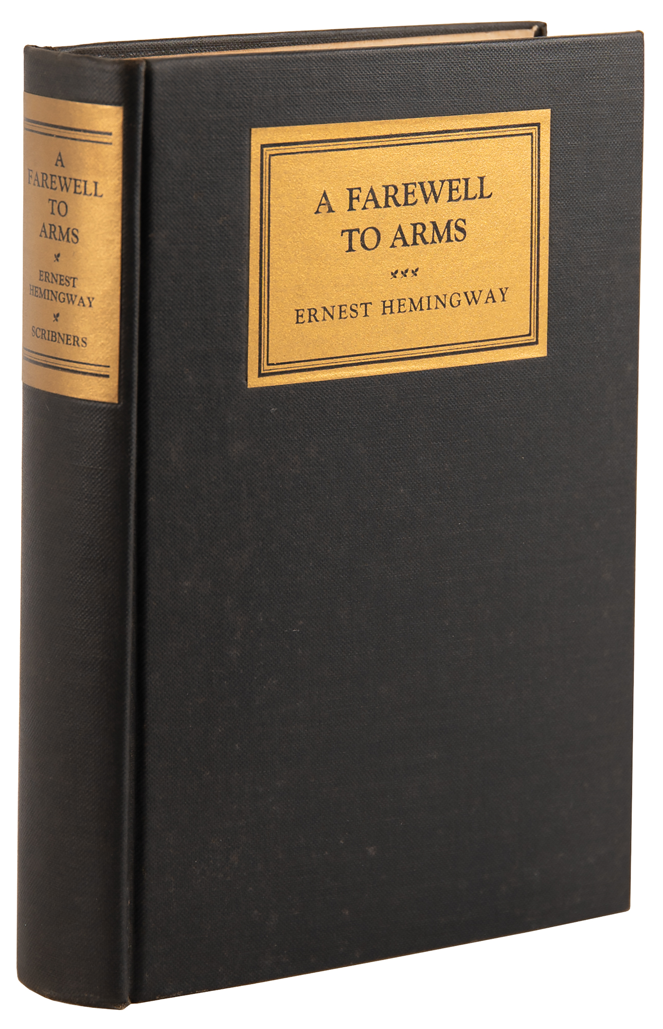 First edition book: A Farewell to Arms by Ernest Hemingway. First edition, first printing. NY: Charles Scribner's Sons, 1929. Hardcover bound in the publisher's black cloth with gilt paper printed labels, with first-issue dust jacket (with "$2.50" price on front flap and misspelled "Katharine" in flap text), 5.5 x 7.75, 355 pages. Book condition: VG/VG, with light toning to the bright jacket, spine darkened, and minor creasing at the head and foot of the jacket's spine.