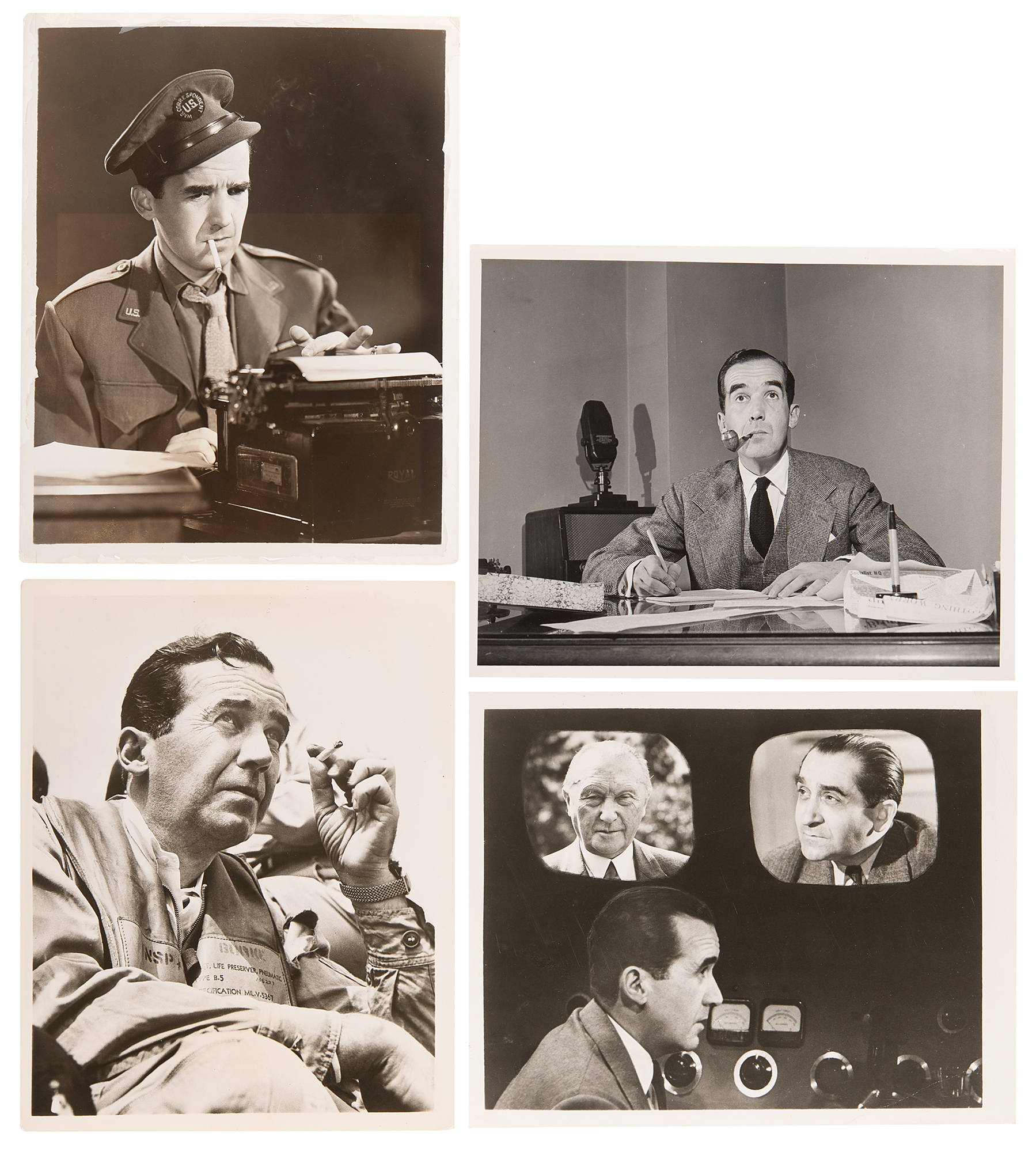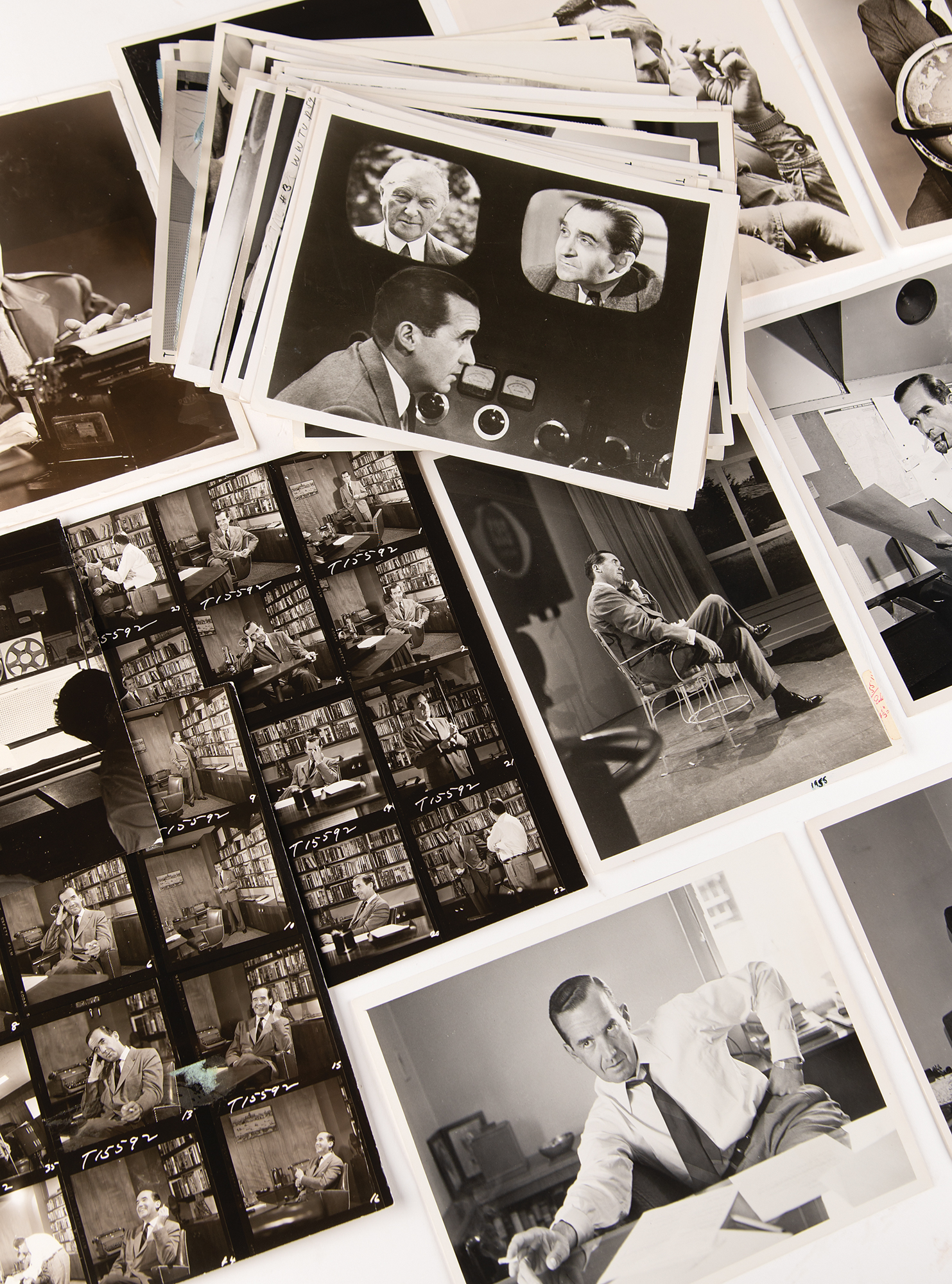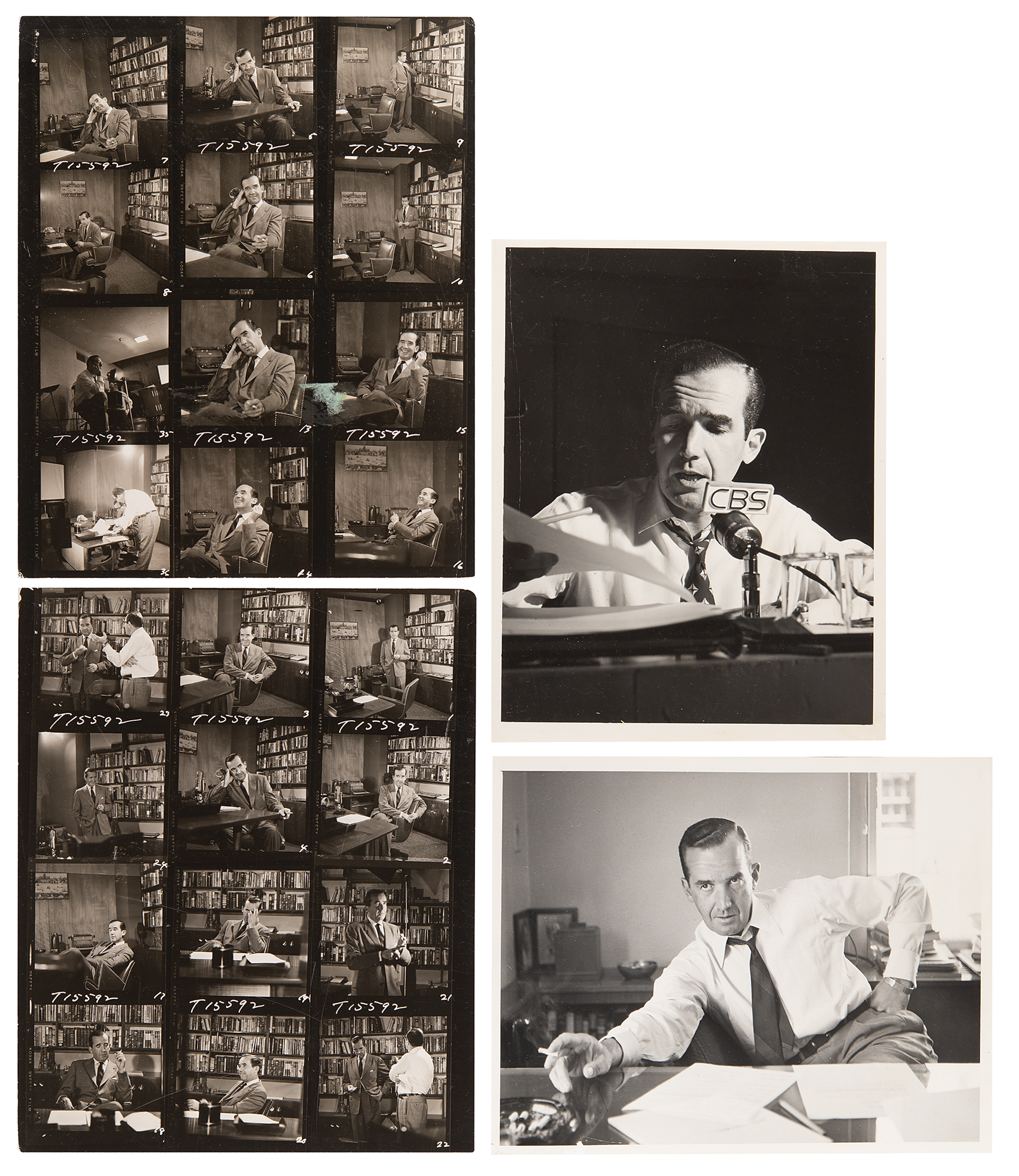 Archive of 98 original vintage press photographs of Edward R. Murrow, ranging in size from 5.5 x 6.5 to 8 x 10, featuring many great images from throughout his celebrated career in journalism. Includes a variety of photos of Murrow in front of CBS microphones, shots on TV sets and in behind-the-scenes newsrooms, a great series of four contact sheets with numerous portraits, and a few of him at home with his family. Many bear stamps and captions on the reverse. In overall very good to fine condition.