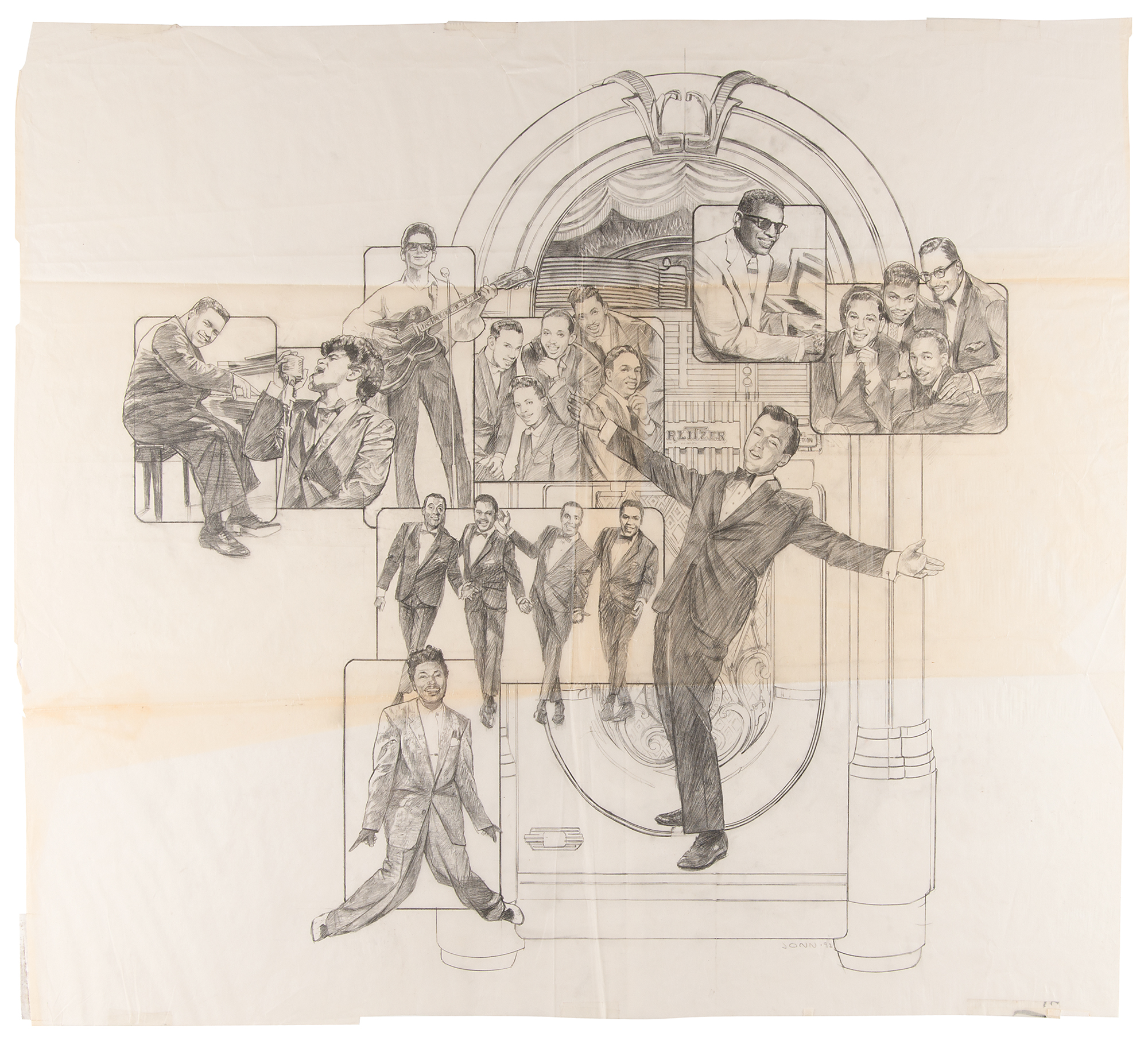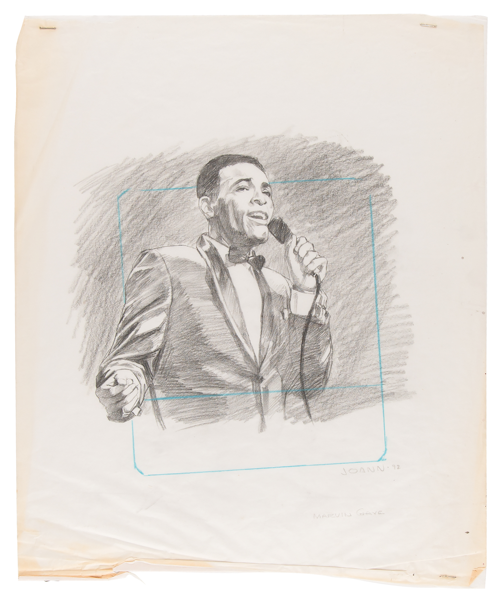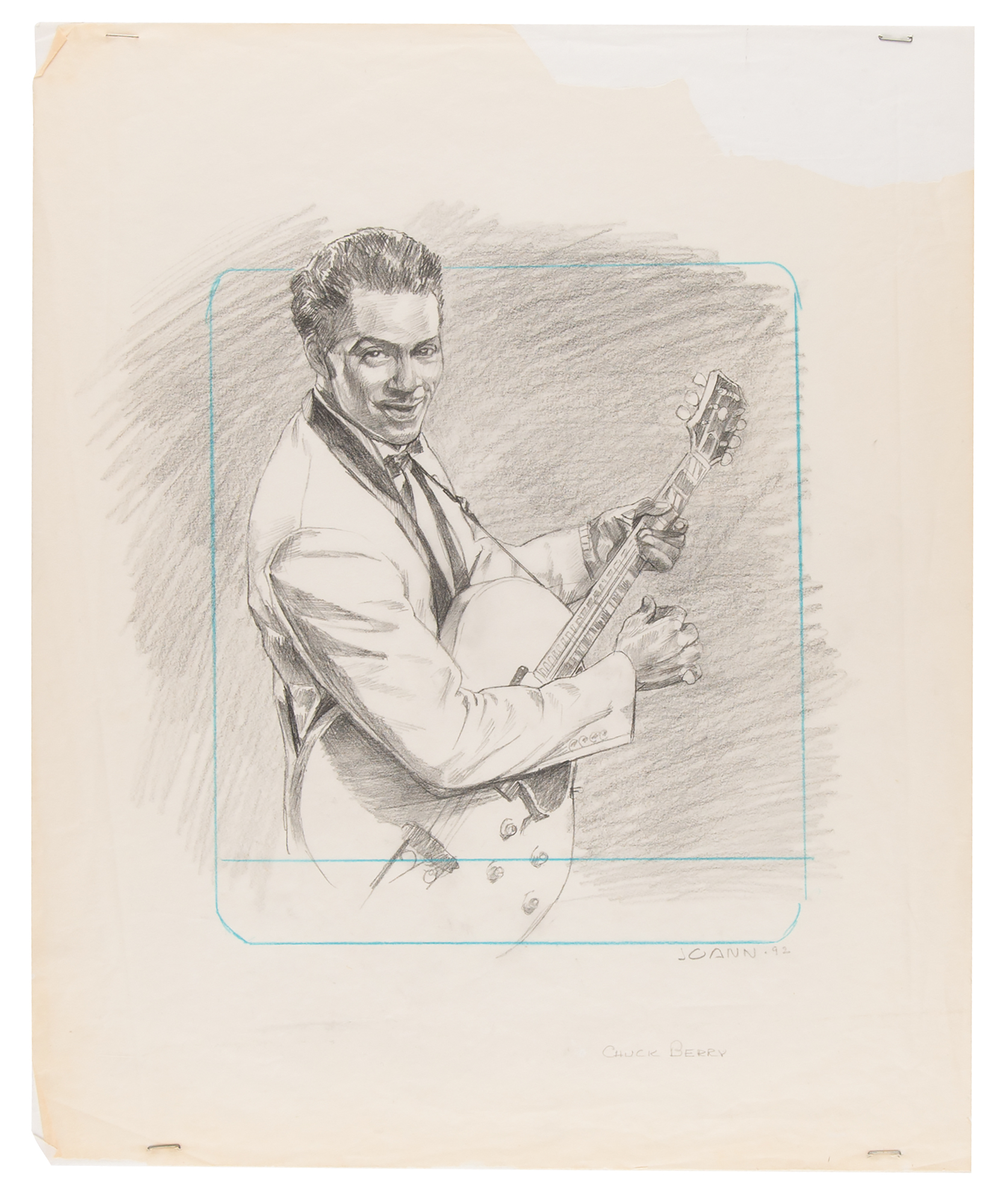 Set of three original sketches of famous musicians from the 1950s and 1960s by artist Joann Daley, accomplished in graphite on sheets of drawing paper ranging in size from 14 x 17 to 29.5 x 27, which includes individual portraits of Marvin Gaye and Chuck Berry, and a marvelous group drawing of musicians like Bobby Darin, James Brown, Little Richard, Roy Orbison, and others. Daley has signed all three drawings in pencil. In overall very good to fine condition, with various creases and folds, and some paper loss.