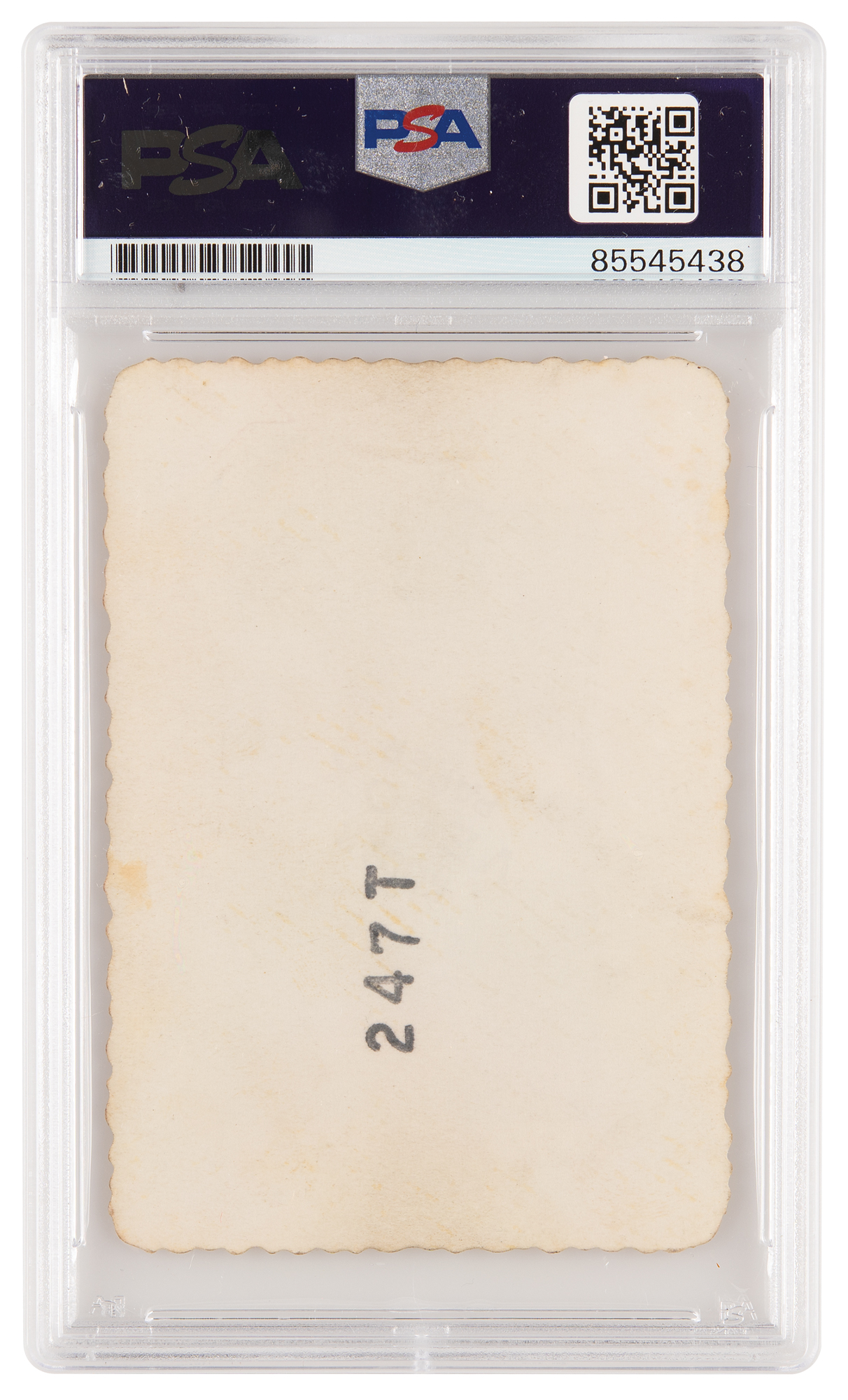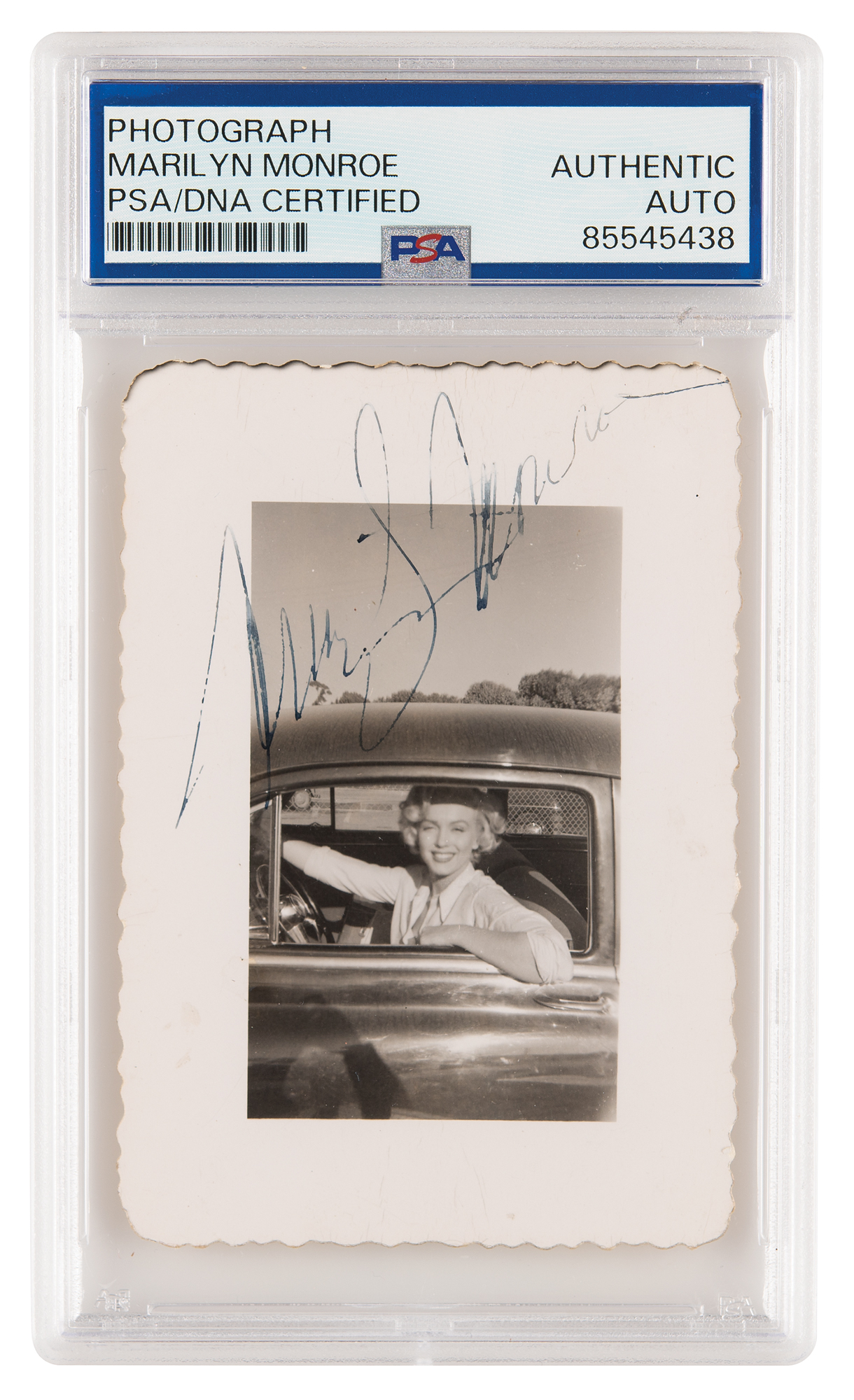Wonderful mid-1950s vintage glossy 2.5 x 3.5 deckle-edge photo of Marilyn Monroe smiling from the driver’s side of an automobile, her right hand on the steering wheel and her left elbow hanging out of the open window, signed in black ink. The reverse is stamped “247T.” In fine condition, with some minor crazing to the emulsion. The consignor notes that the autograph was obtained by Frieda Hull, one of the ‘Monroe Six,’ a group of legendary fans with whom Monroe became friendly. Encapsulated in a PSA/DNA authentication holder.