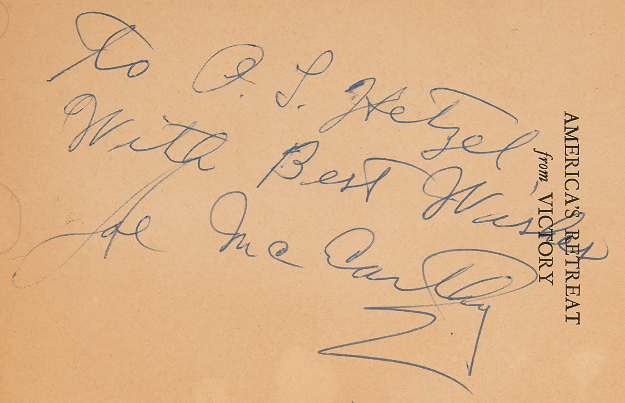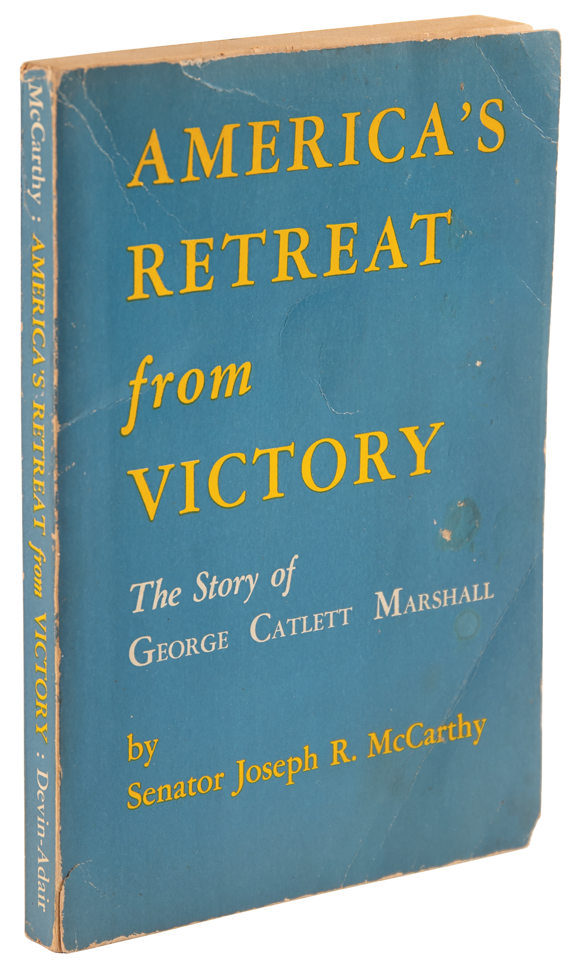 Signed book: America's Retreat from Victory: The Story of George Catlett Marshall. Later printing. NY: The Devin-Adair Company, 1951. Paperback, 5 x 7.25, 187 pages. Signed and inscribed on the half-title page in blue ballpoint, "To A. S. Hetzel, With Best Wishes, Joe McCarthy." In very good condition, with creasing the front cover, light stains to the signed page, small chips and tears to top edge of textblock, and moderately heavy toning to all interior pages.