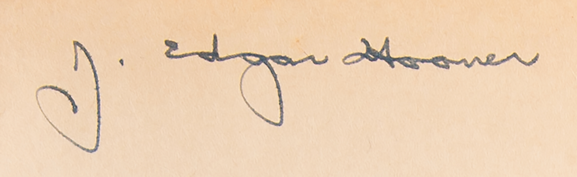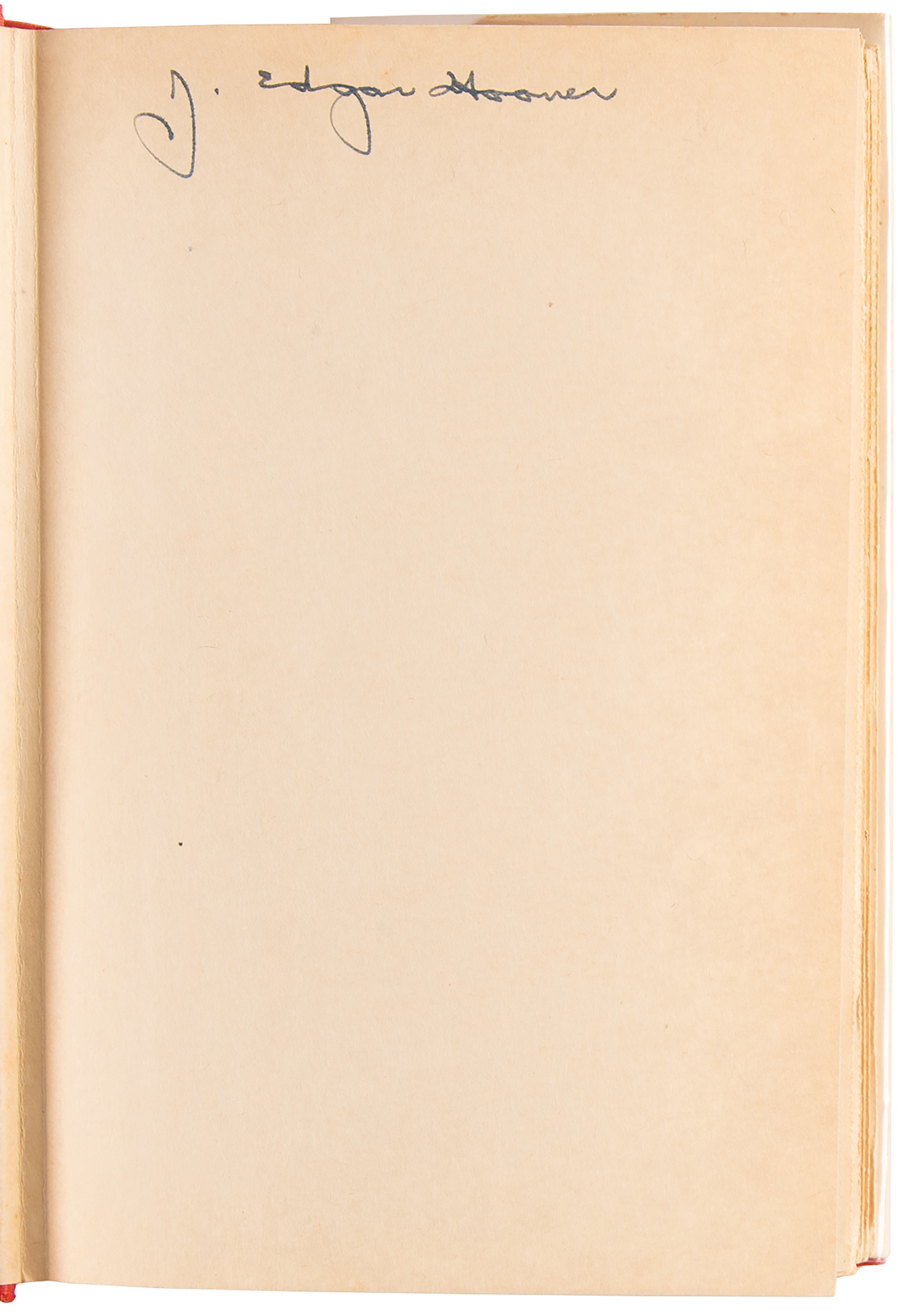 Signed book: The FBI in Peace and War. Later printing. NY: Books, Inc., 1943. Hardcover with dust jacket, 6 x 8.75, 297 pages. Signed on the first free end page in fountain pen, "J. Edgar Hoover." In fine condition, with light wear to the dust jacket.