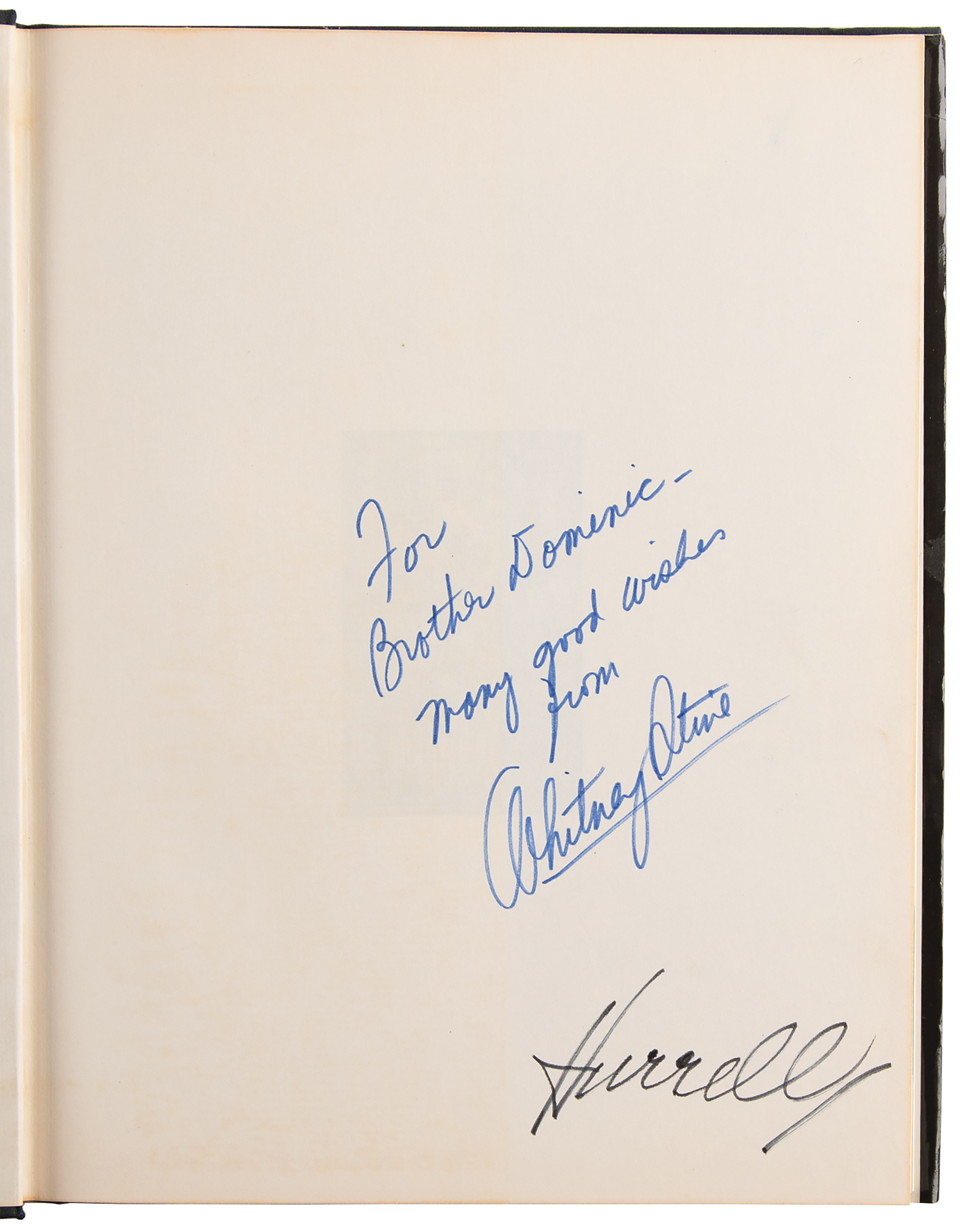Signed book: The Hurrell Style. First edition. NY: The John Day Company, 1976. Hardcover with slipcase, 8.75 x 11.25, 218 pages. Signed on the first free end page in black felt tip by the photographer, "Hurrell," and signed and inscribed in blue felt tip by the author, "For Brother Dominic—Many good wishes from Whitney Stine." In fine condition.