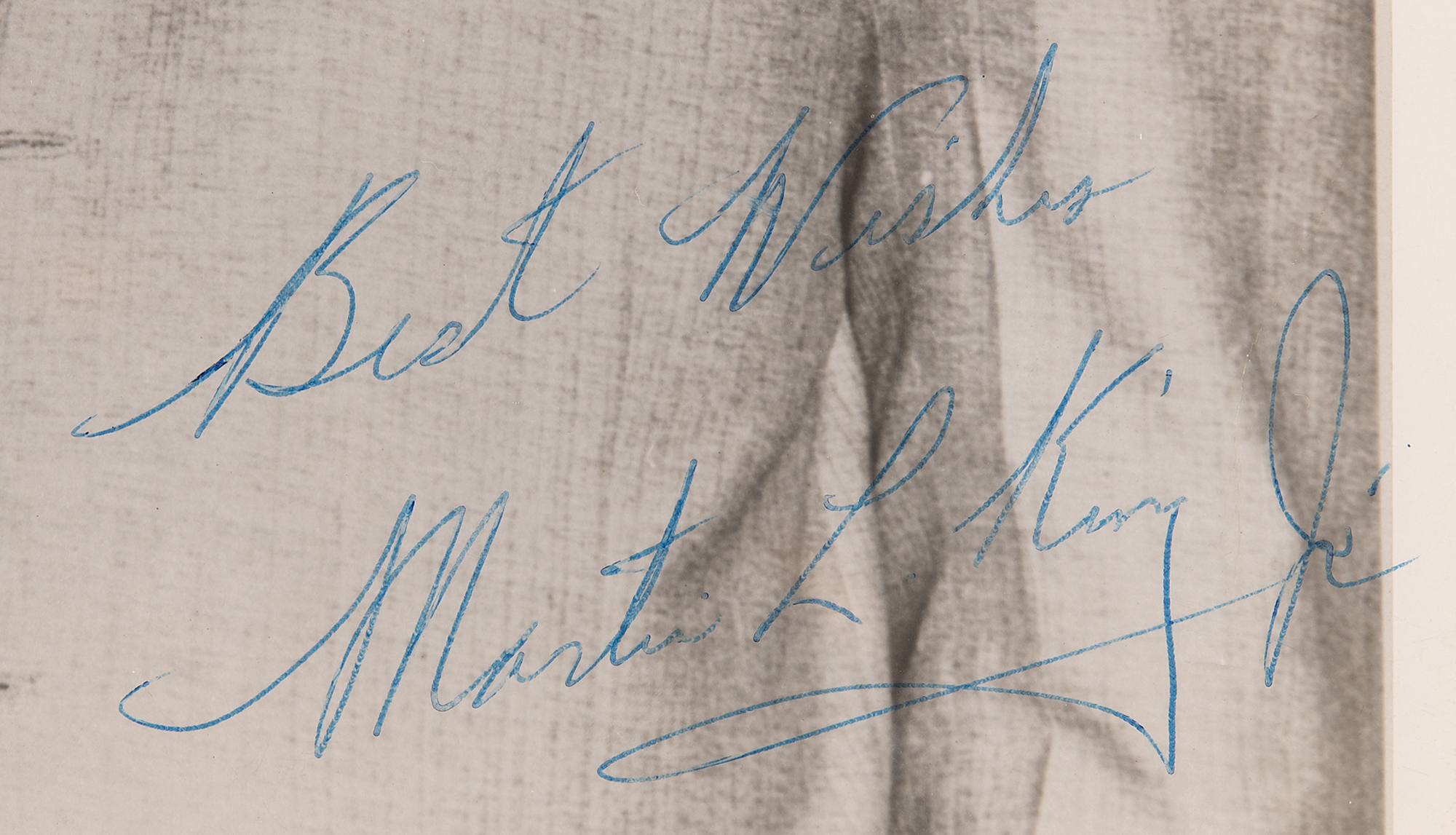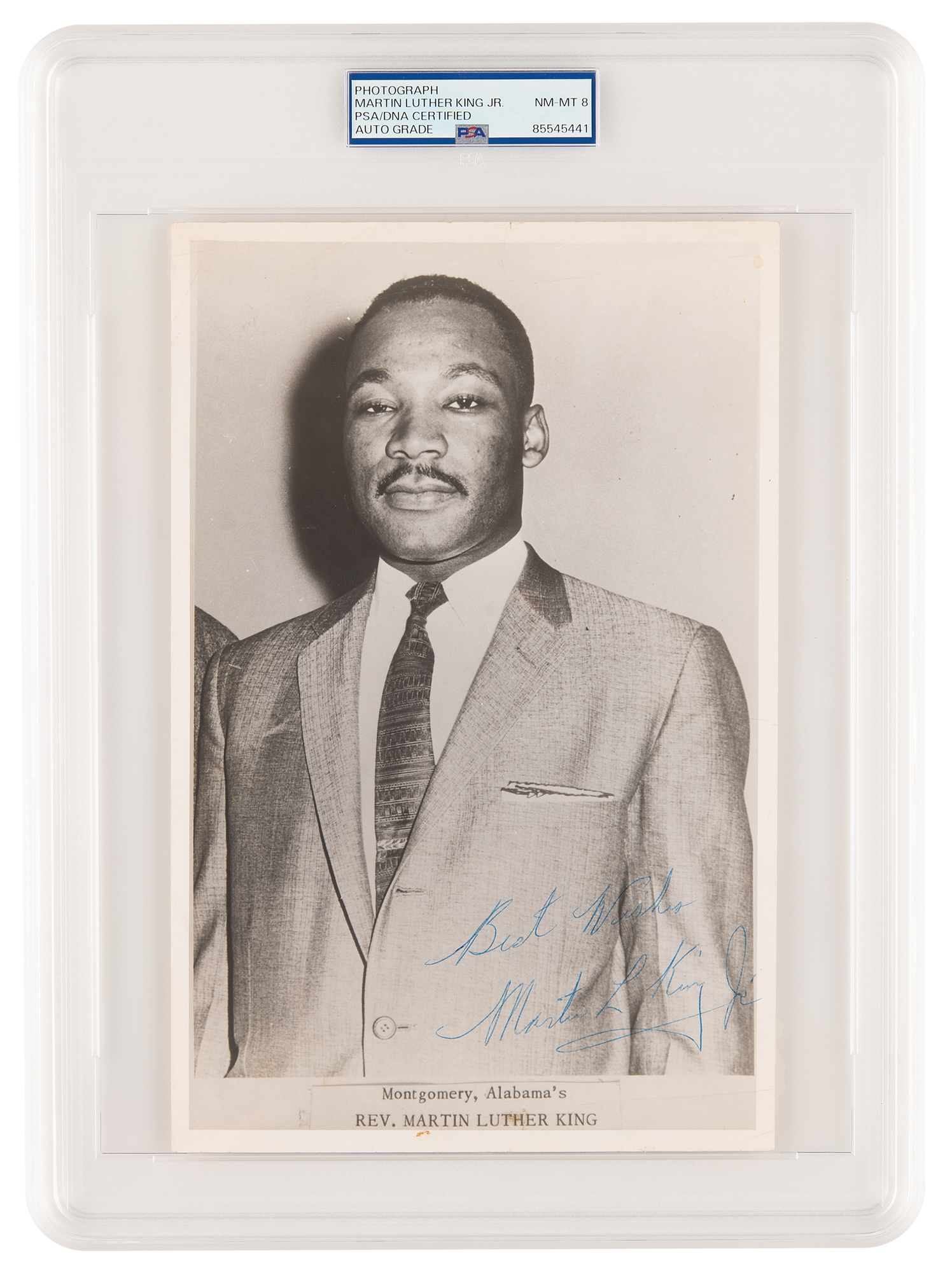 Exceptional vintage glossy 6.5 x 10 publicity photo of Martin Luther King, Jr. wearing a suit and tie in a handsome half-length pose, signed in blue ballpoint, “Best wishes, Martin Luther King, Jr.” Text to the lower border reads: “Montgomery, Alabama’s Rev. Martin Luther King.” In very good to fine condition, with scattered light creasing. Encapsulated and graded by PSA/DNA as "NM-MT 8."