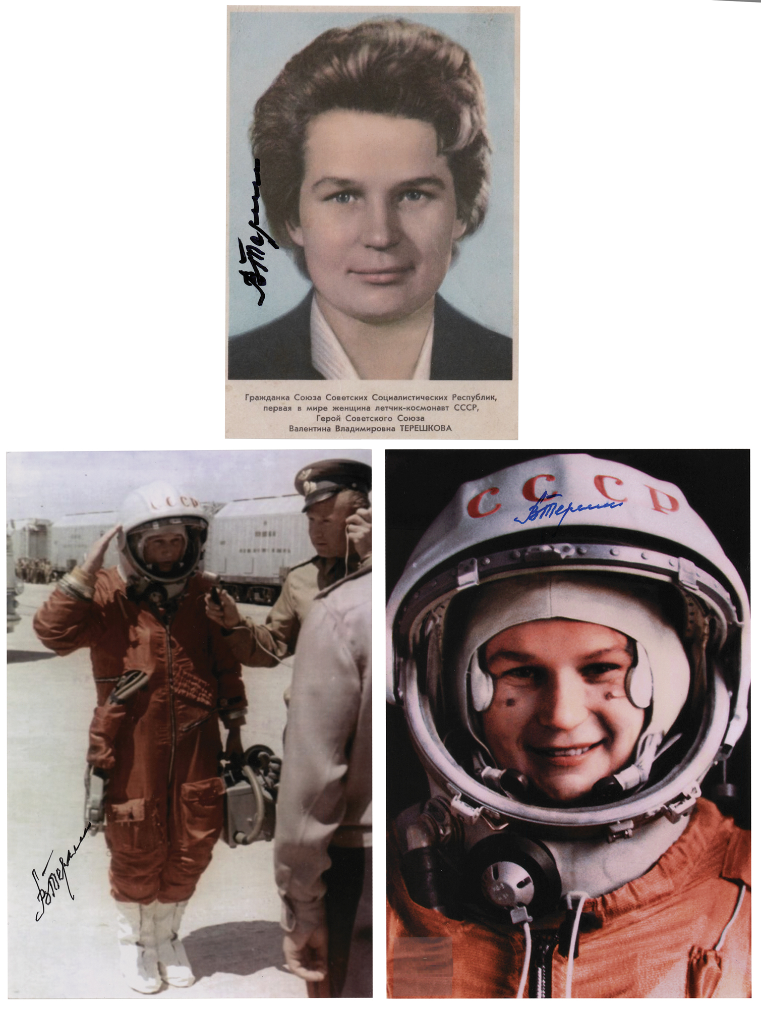 Three different color glossy photos of Valentina Tereshkova, ranging in size from 4 x 6 to 5 x 7.5, each signed in felt tip by the first woman in space. In very fine condition.