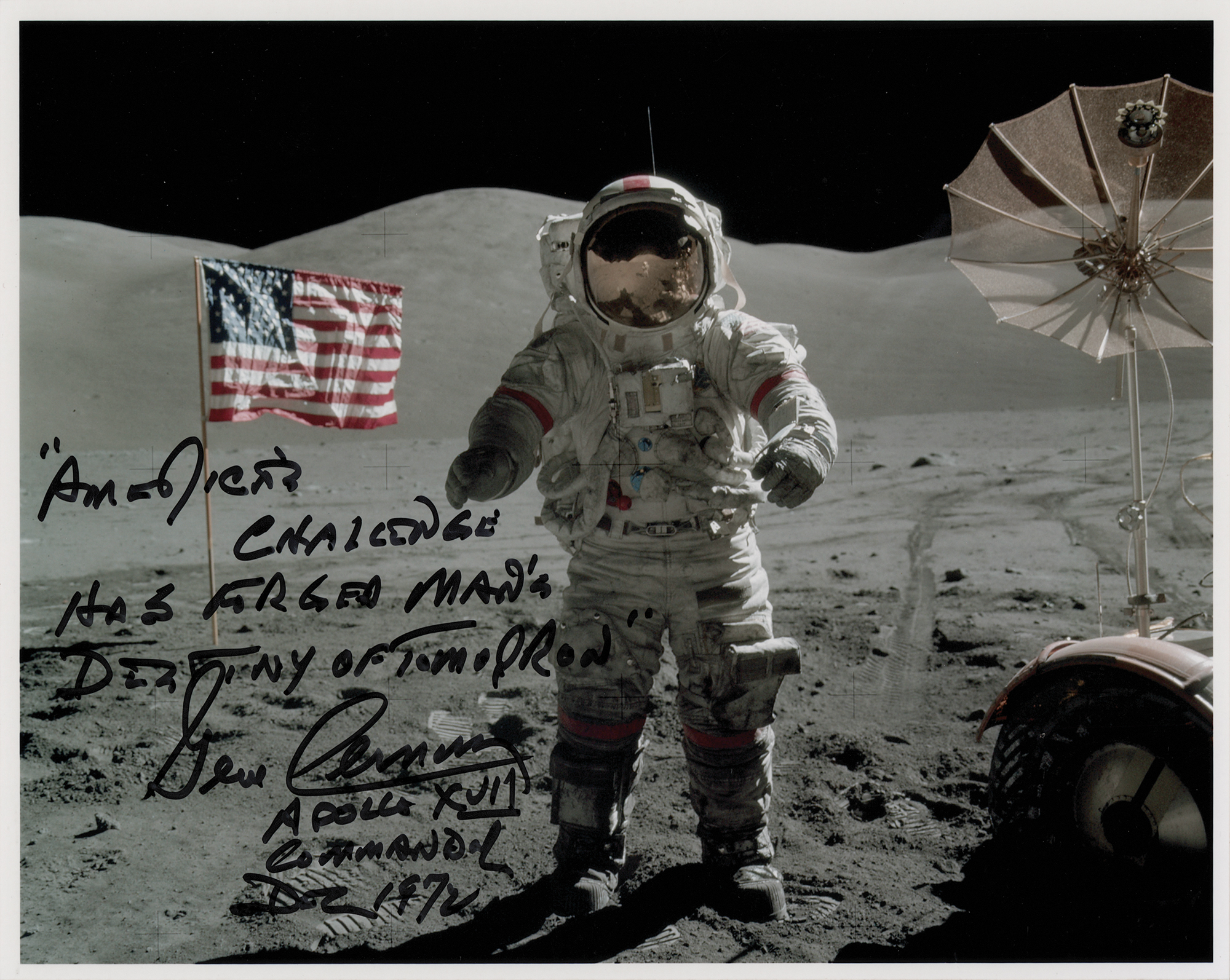 Color satin-finish 10 x 8 full-length photo of Cernan standing on the lunar surface between the American flag and the lunar rover, with the rolling terrain of the moon rising in the background, signed in black felt tip, "'America's challenge has forged man's destiny of tomorrow,' Gene Cernan, Apollo XVII, Commander, Dec. 1972." In very fine condition.