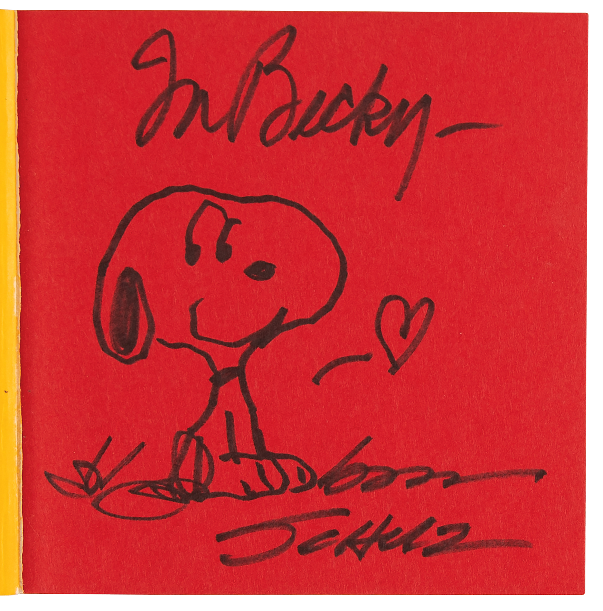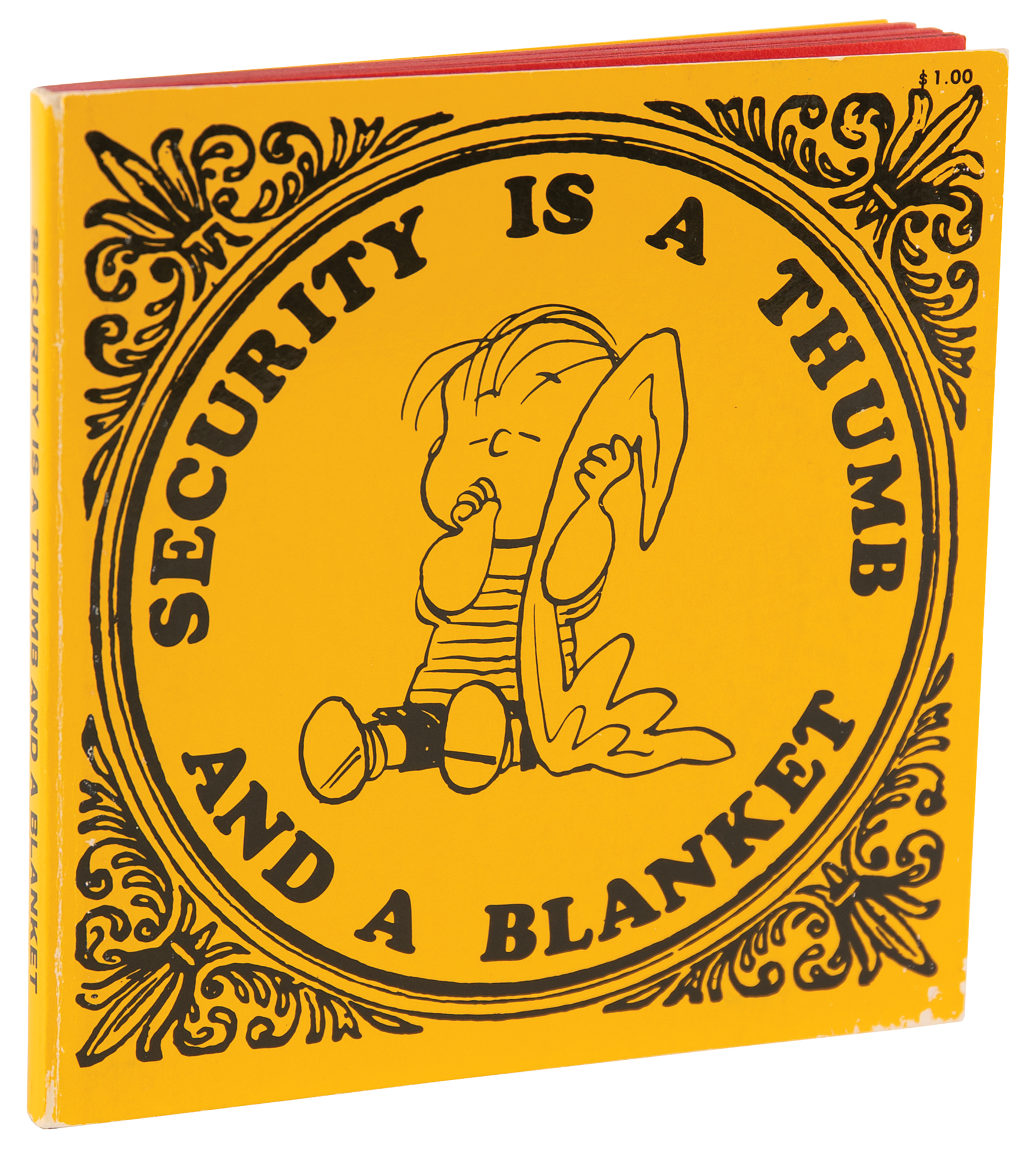 Signed book: Security is a Thumb and a Blanket. Later printing. San Francisco: Determined Productions, Inc., 1971. Softcover, 5.25 x 5.5. Signed and inscribed on the first free end page in black felt tip, "For Becky—Schulz," with the addition of a detailed, full-bodied sketch of Snoopy in a sitting pose. In fine condition. An outstanding original sketch of one of Schulz's most beloved Peanuts characters.