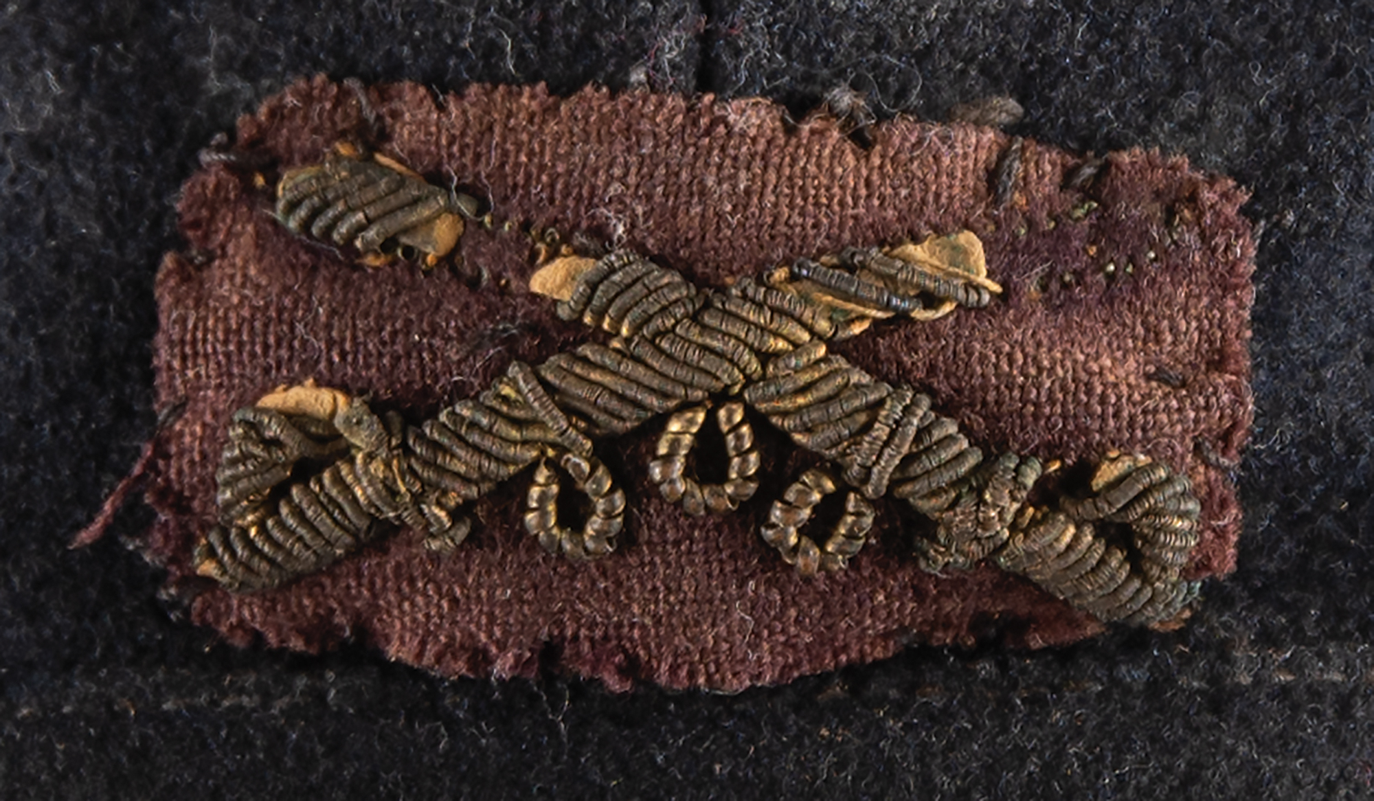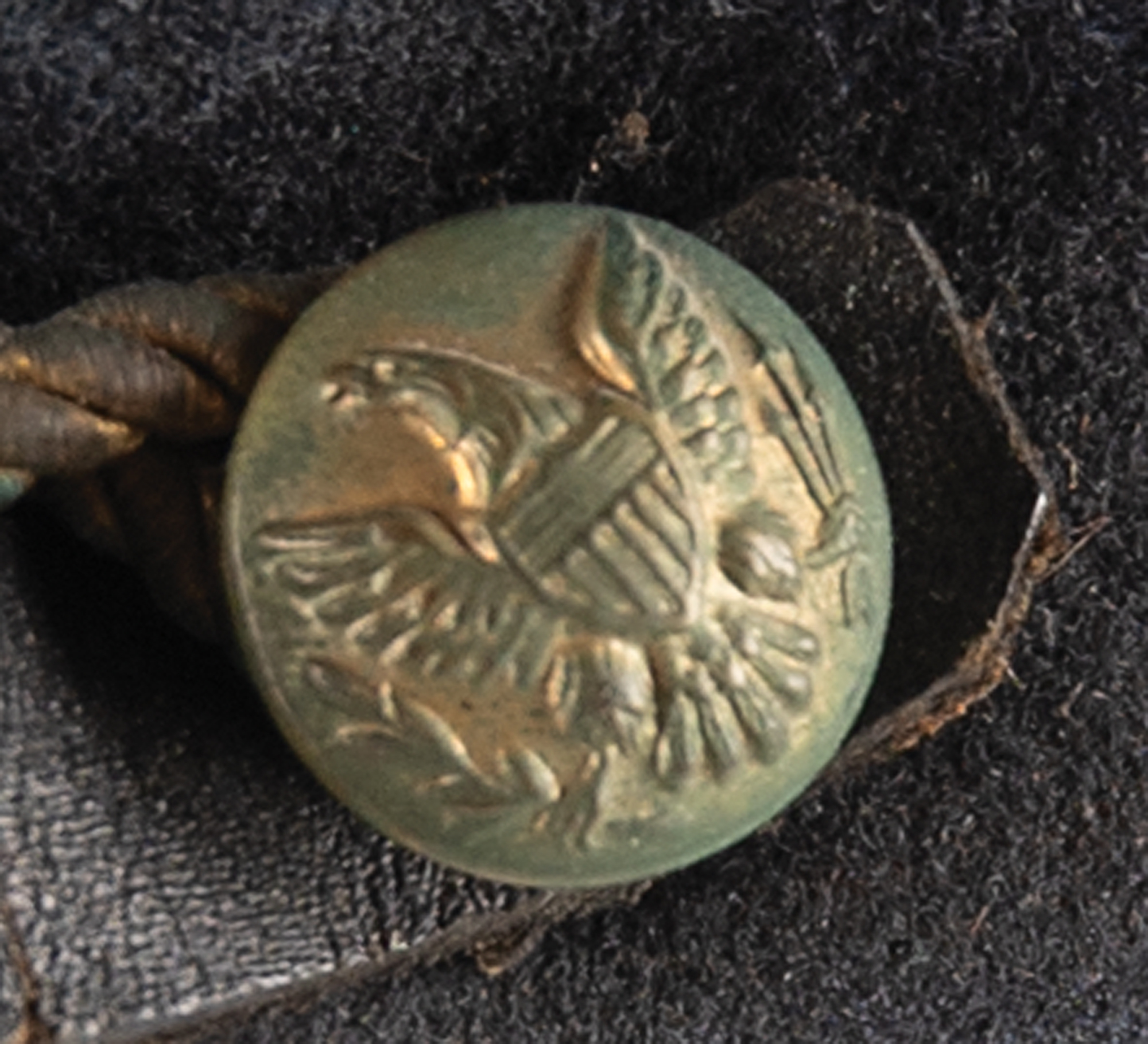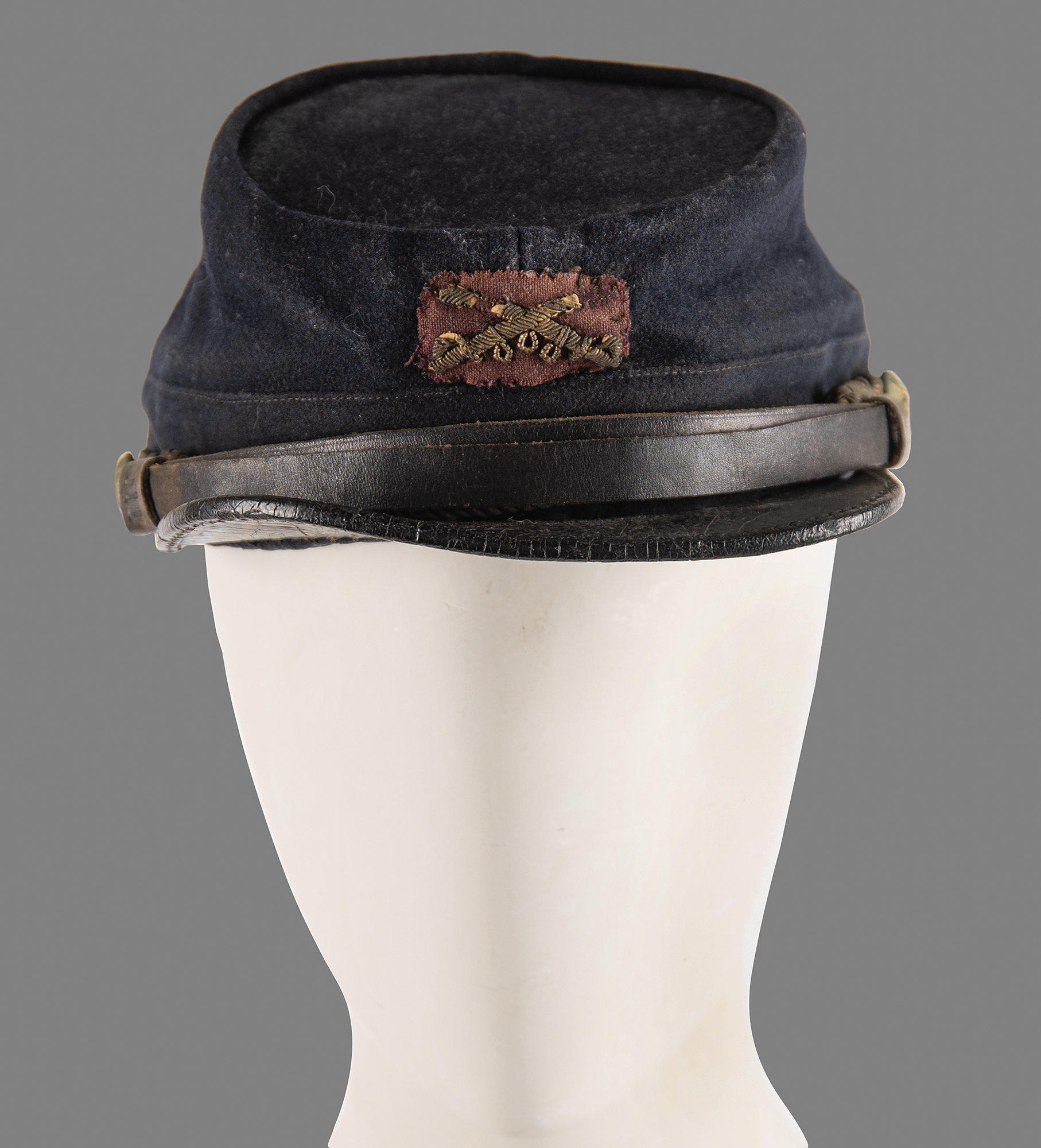 Indian Wars–era cavalry officer's kepi, handsomely constructed of navy blue wool with a worn bullion officer's cavalry hat badge on the crown; brass eagle side buttons hold a gold twisted wire officer's hat cord and leather chinstrap, evidently added to secure the hat while riding on horseback. The leather sweatband has wrapped with cloth for comfort in warm climates and shows service wear; also exhibits some scattered creasing to the brim.
