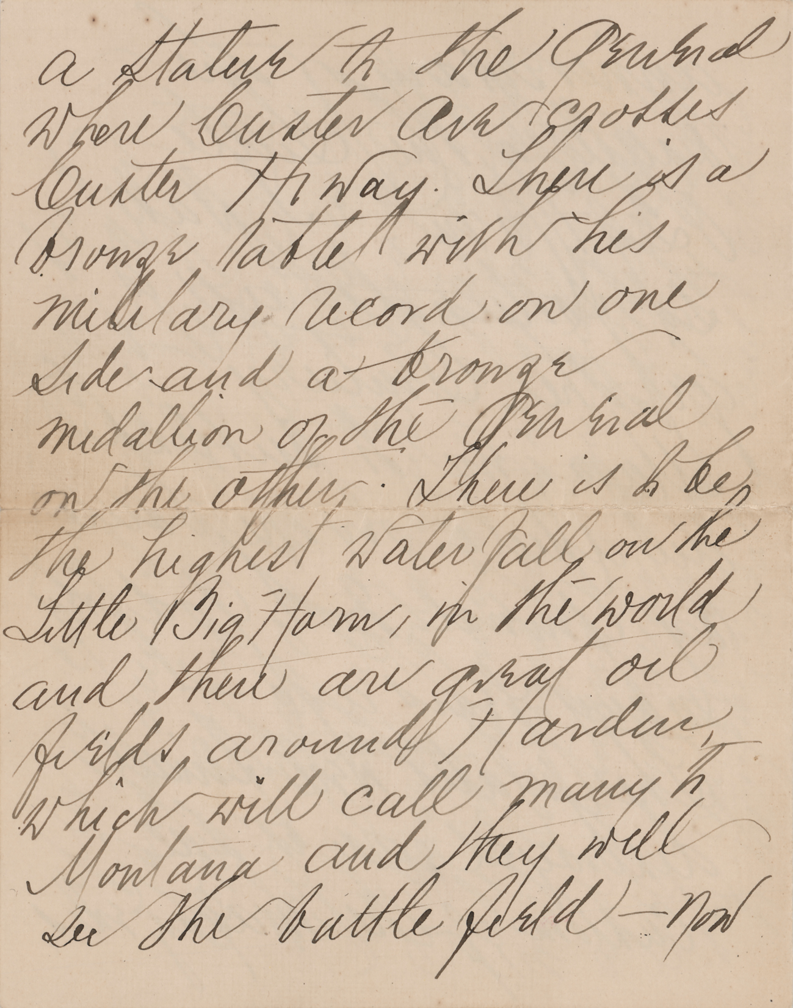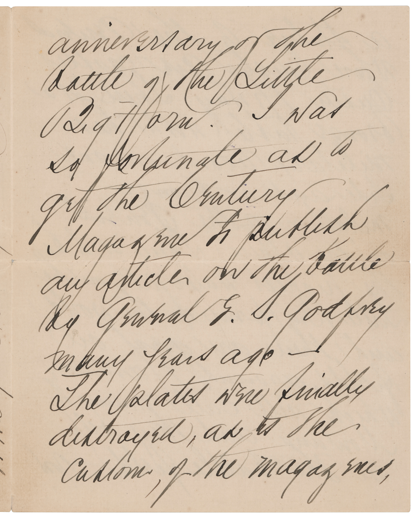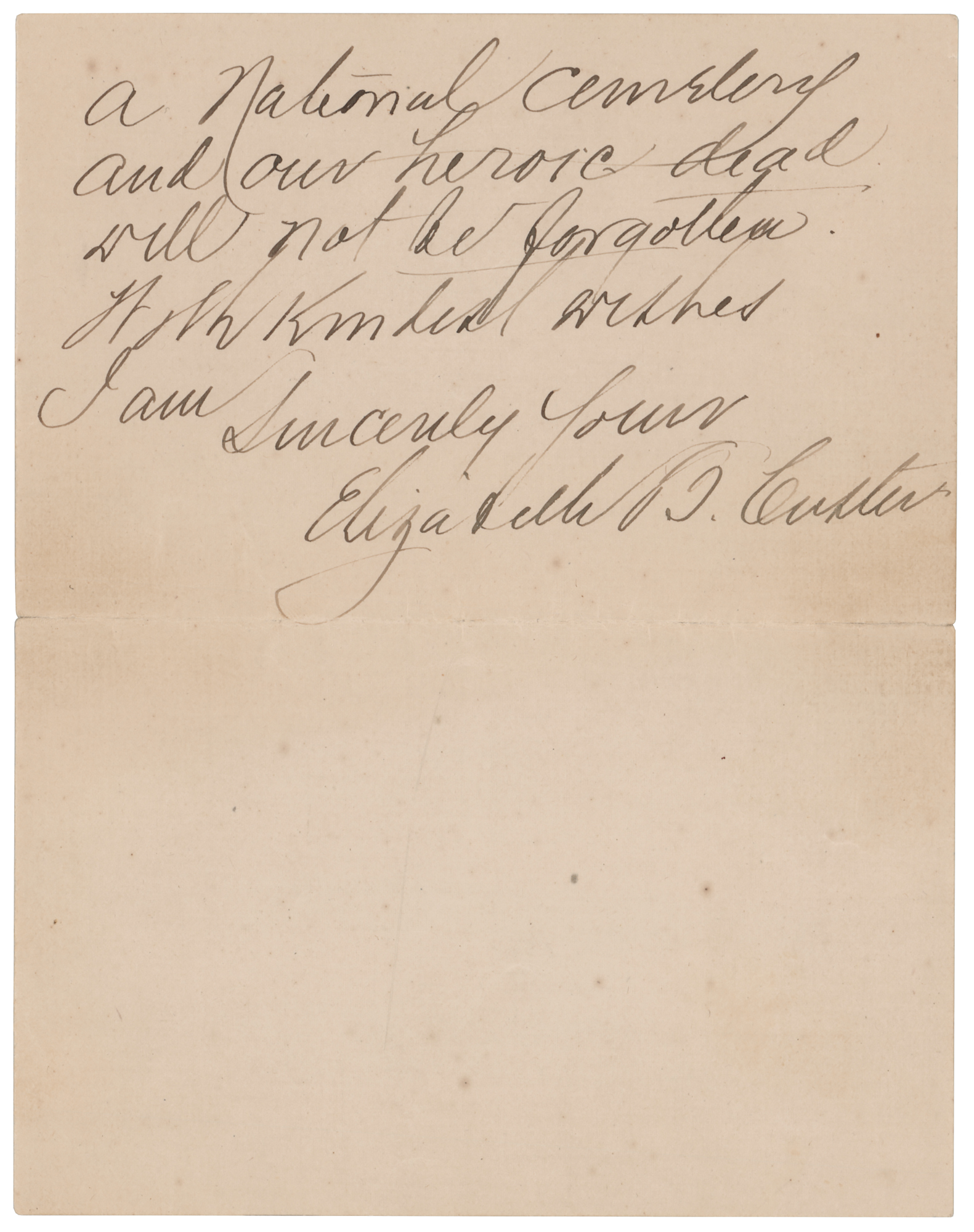 Wife and biographer (1842–1933) of ill-fated General George Armstrong Custer. ALS signed “Elizabeth B. Custer,” five pages on three sheets, 5 x 6.5, March 30, 1922. Significant handwritten letter to Sgt. Thomas Norwood, a veteran who fought with Custer in Company M of the 7th Cavalry, concerning memorials at the Little Bighorn battlefield. In full: "I have heard from Sergeant Ryan that you are a loyal friend of my husband and I am sending you a pamphlet that I prepared last summer for the forty fifth anniversary of the Battle of the Little Big Horn. I was so fortunate as to get the Century Magazine to publish an article on the battle by General E. S. Godfrey many years ago—The plates were finally destroyed, as is the custom of the magazines, after a certain number of years and I ordered new ones, copying the text of the magazine article—The illustrations had not been destroyed fortunately. They are by Frederick Remington who was in the west for years and who knew horses and hunting & camping. The little town near the battlefield of the Little Big Horn is very loyal to the 7th Cavalry and erected a statue of the General where Custer Ave crosses Custer Hiway. There is a bronze tablet with his military record on one side and a bronze medallion of the General on the other. There is to be the highest waterfall on the Little Big Horn, in the world and there are great oil fields around Harden which will call many in Montana and they will see the battle field—now a national cemetery and our heroic dead will not be forgotten." In fine condition. Accompanied by the original mailing envelope, addressed in Custer's own hand.