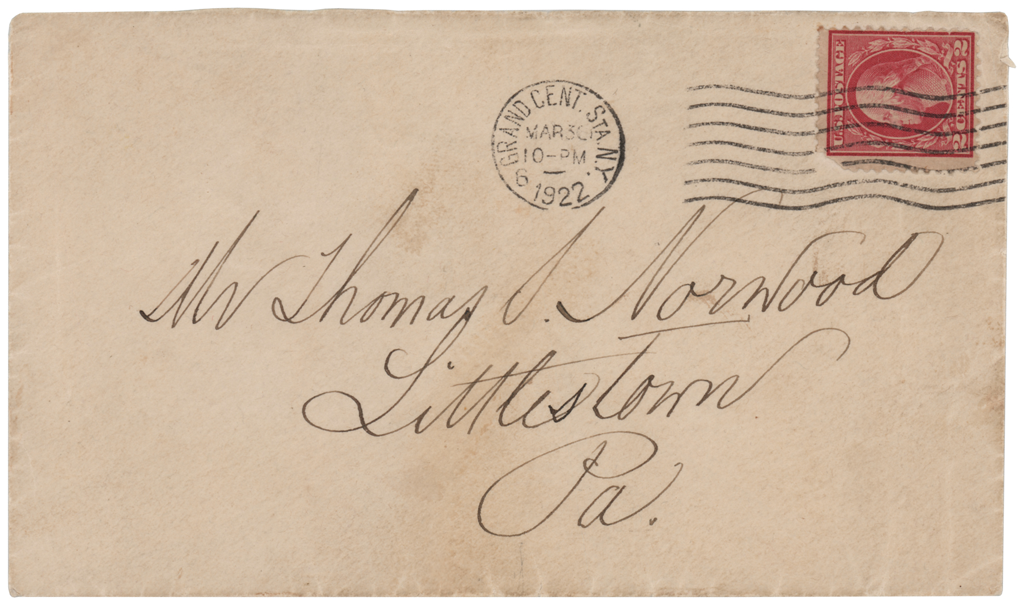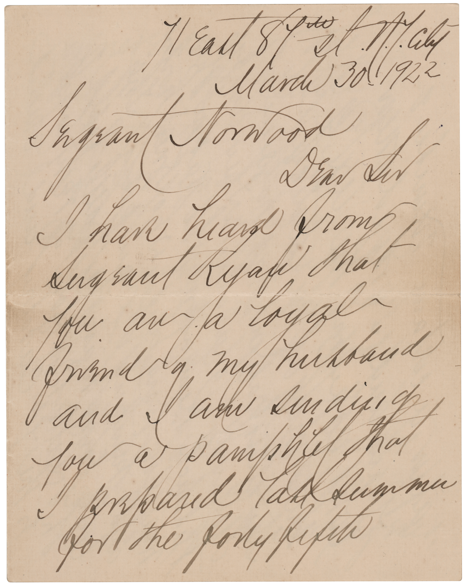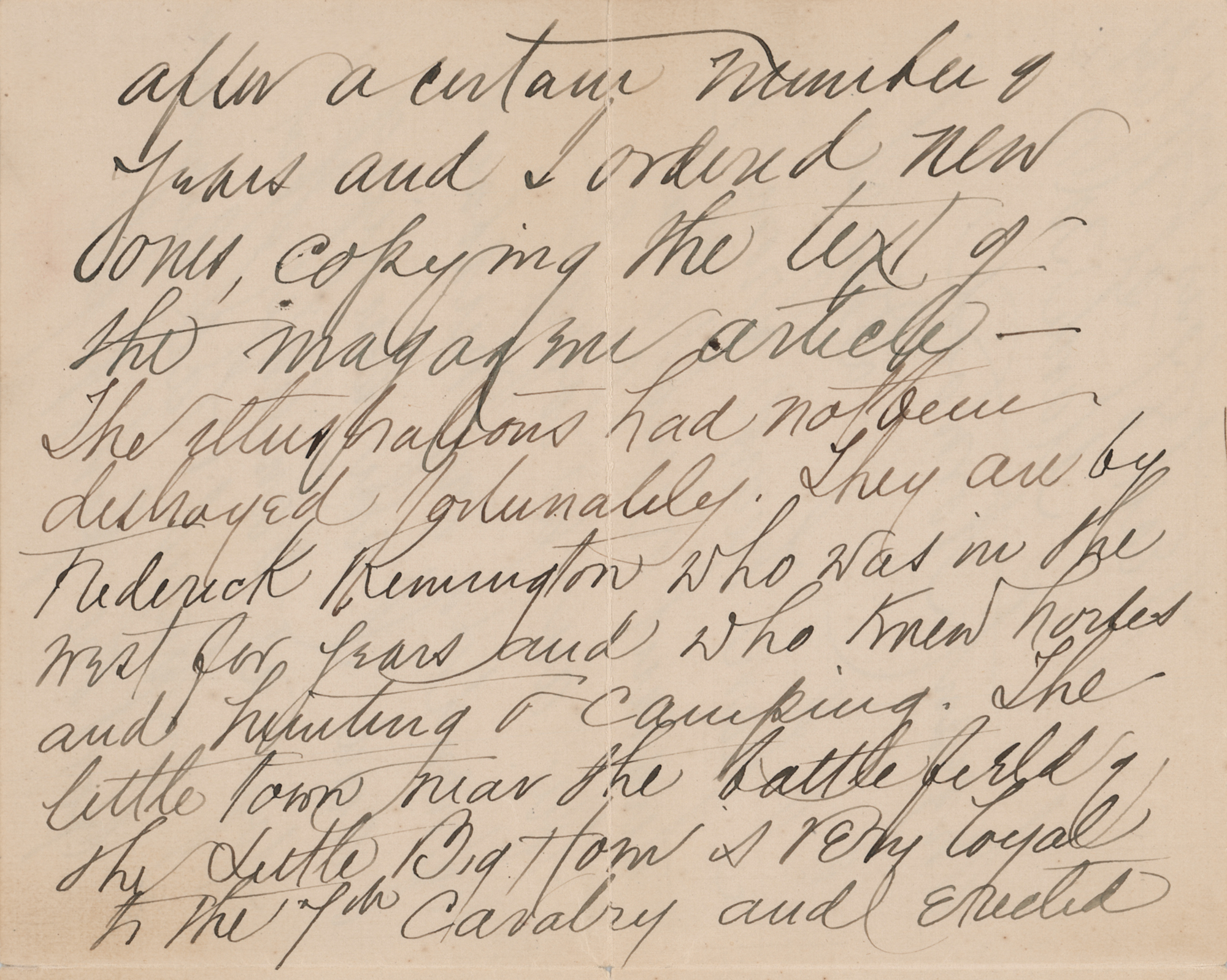 Wife and biographer (1842–1933) of ill-fated General George Armstrong Custer. ALS signed “Elizabeth B. Custer,” five pages on three sheets, 5 x 6.5, March 30, 1922. Significant handwritten letter to Sgt. Thomas Norwood, a veteran who fought with Custer in Company M of the 7th Cavalry, concerning memorials at the Little Bighorn battlefield. In full: "I have heard from Sergeant Ryan that you are a loyal friend of my husband and I am sending you a pamphlet that I prepared last summer for the forty fifth anniversary of the Battle of the Little Big Horn. I was so fortunate as to get the Century Magazine to publish an article on the battle by General E. S. Godfrey many years ago—The plates were finally destroyed, as is the custom of the magazines, after a certain number of years and I ordered new ones, copying the text of the magazine article—The illustrations had not been destroyed fortunately. They are by Frederick Remington who was in the west for years and who knew horses and hunting & camping. The little town near the battlefield of the Little Big Horn is very loyal to the 7th Cavalry and erected a statue of the General where Custer Ave crosses Custer Hiway. There is a bronze tablet with his military record on one side and a bronze medallion of the General on the other. There is to be the highest waterfall on the Little Big Horn, in the world and there are great oil fields around Harden which will call many in Montana and they will see the battle field—now a national cemetery and our heroic dead will not be forgotten." In fine condition. Accompanied by the original mailing envelope, addressed in Custer's own hand.