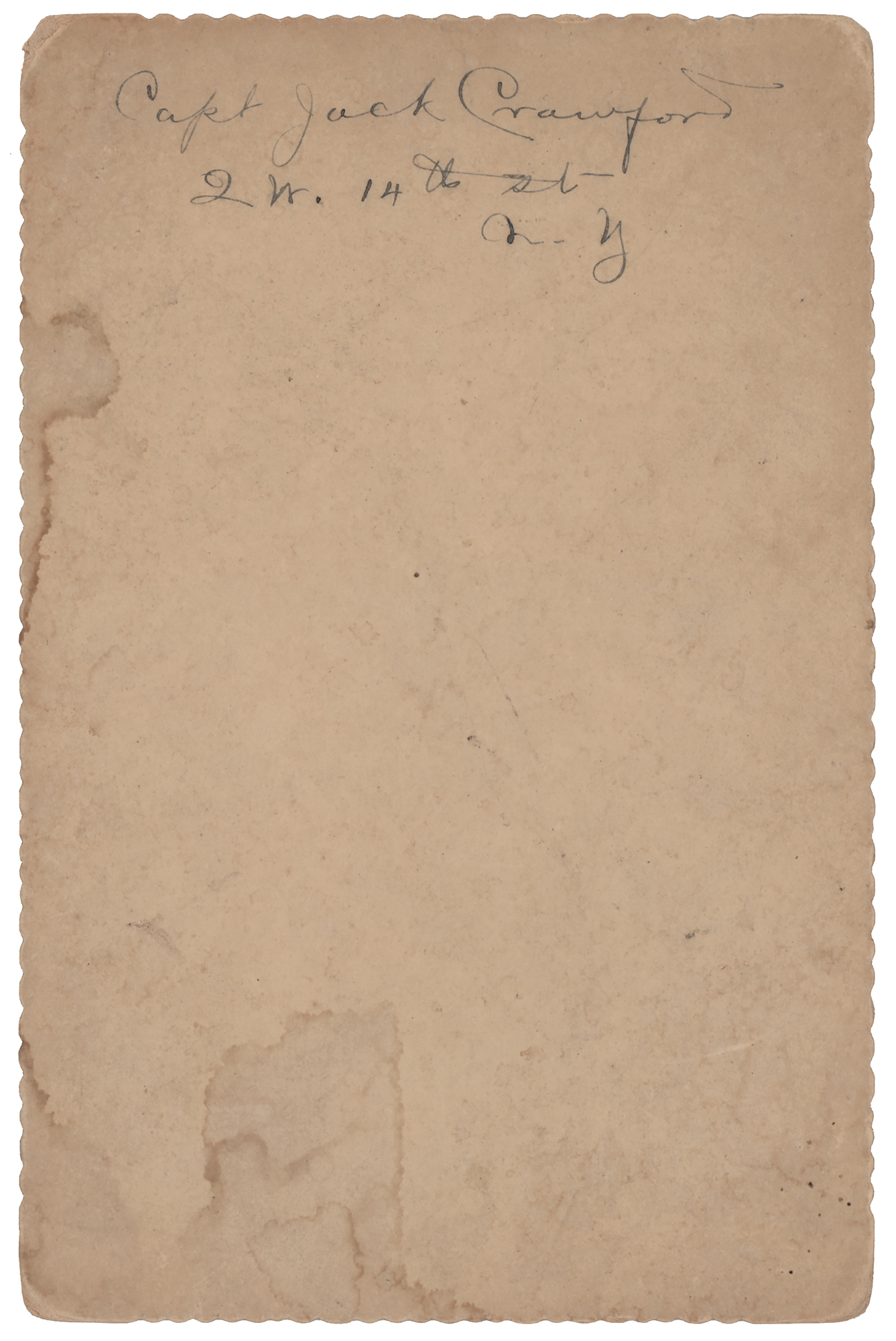 Important chief (1822–1909) of the Oglala Lakota, famous for opposing U.S. Army forces during ‘Red Cloud’s War’ from 1866–1868, when he conducted raids against troops and outposts along the Bozeman Trail. The conflict came to an end with the 1868 Treaty of Fort Laramie, which established the Great Sioux Reservation and ceded the Black Hills to their control; this treaty made Red Cloud the only chief to get the US to sign a surrender document. The treaty would be violated just seven years later after the Black Hills Gold Rush and Custer’s expeditions into the territory, prompting the Great Sioux War of 1876–1877, led by Crazy Horse and Sitting Bull. Red Cloud did not take part, instead hoping to find a peaceful solution, and he became a crucial leader of the Lakota as they transitioned from the freedom of the plains to the confinement of the reservation system. In 1877, the Red Cloud Agency moved to the upper Missouri River. The following year it was moved to the forks of the White River, in present-day South Dakota, where it was renamed the Pine Ridge Indian Reservation. Never wavering from his steadfast devotion to his people, Red Cloud would die there in 1909. Scarce 4.25 x 6.5 cabinet card photograph of Sioux warrior chief Red Cloud by William R. Cross of Hot Springs, South Dakota, showing the legendary chief seated with a peace pip across his lap. Captioned along the bottom of the image: "Red Cloud, Chief of Pine Ridge Agency, S. D." Curiously annotated on the reverse in an unknown hand with the New York address of Captain Jack Crawford, a Wild West adventurer and storyteller known as 'The Poet Scout.'. In very good to fine condition, with light edgewear and soiling.