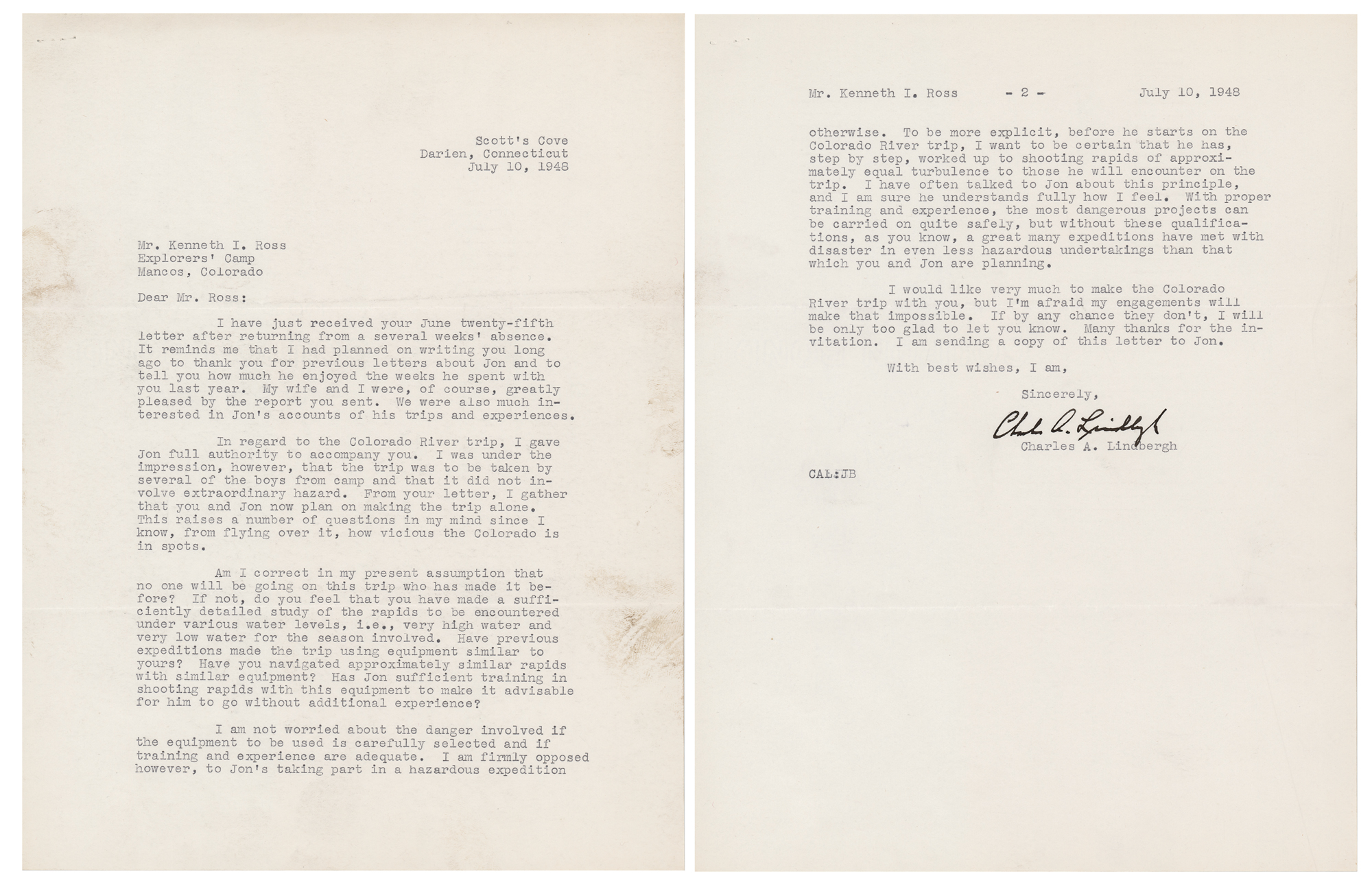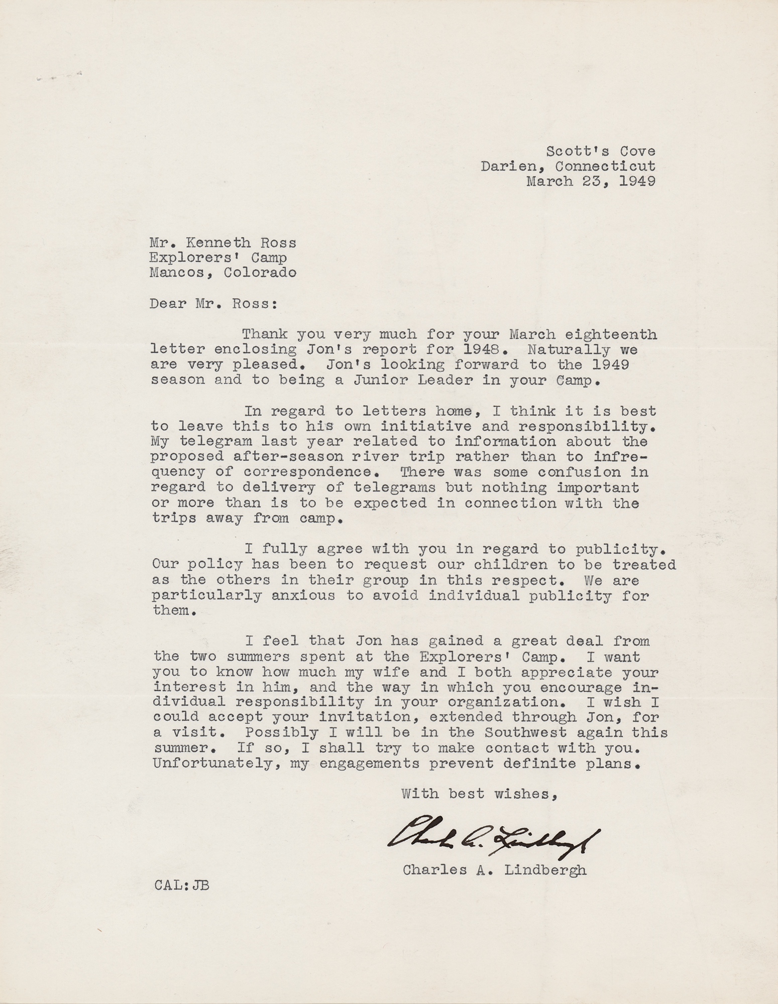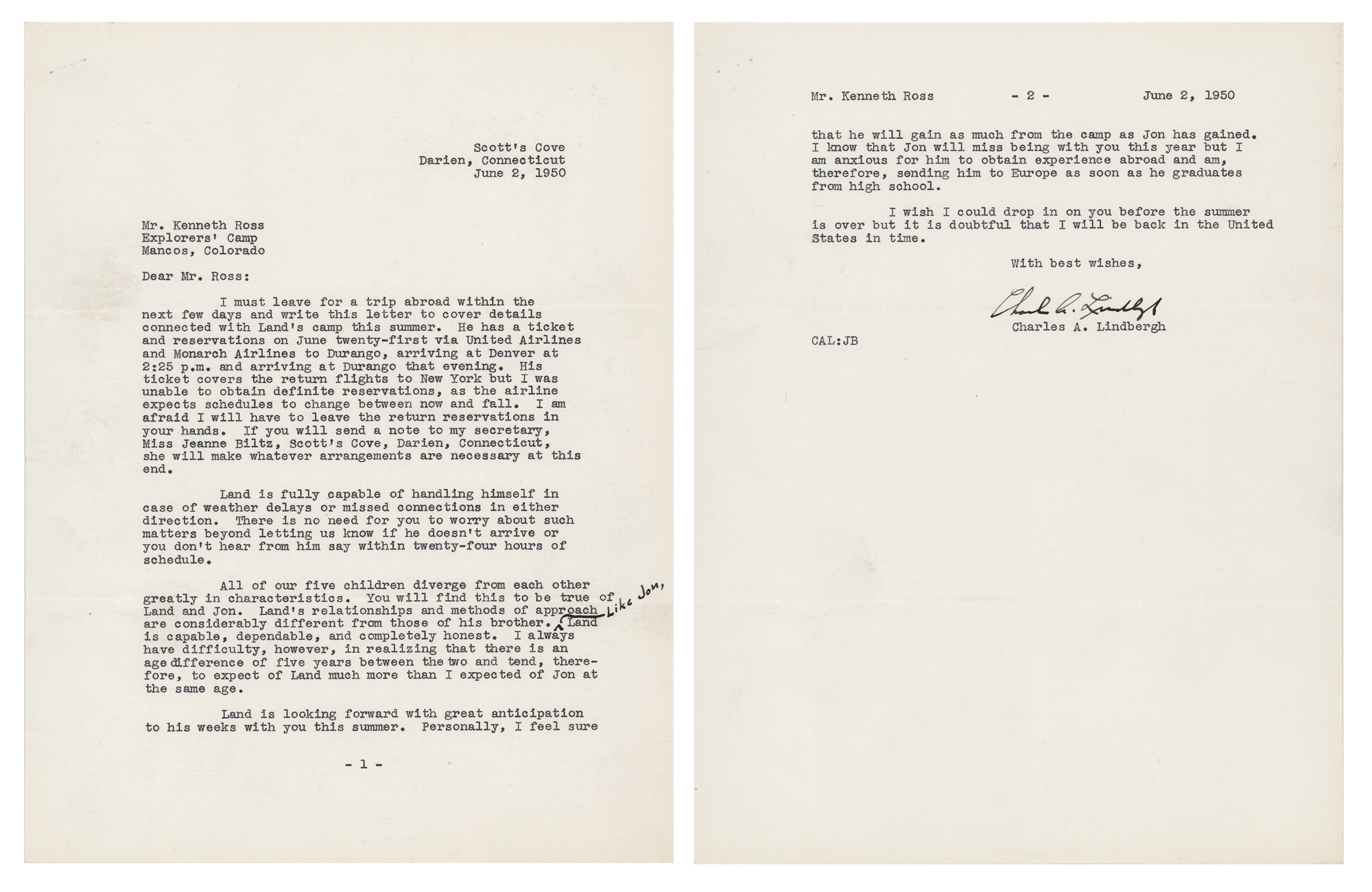 Archive of six TLSs signed "Charles A. Lindbergh," totaling eight pages, 8.5 x 11, dated from 1946 to 1952. Lindbergh writes to Kenneth Ross to the "Explorers' Camp, Mancos, Colorado," regarding his the attendance of his sons Jon and Land. The letters reflect his deep concern for his sons' safety and privacy during their time at the "Explorers' Camp," especially regarding risky river expeditions and public attention due to the family name. While expressing strong parental oversight, Lindbergh also consistently praises the camp’s impact on his sons' growth, independence, and character.