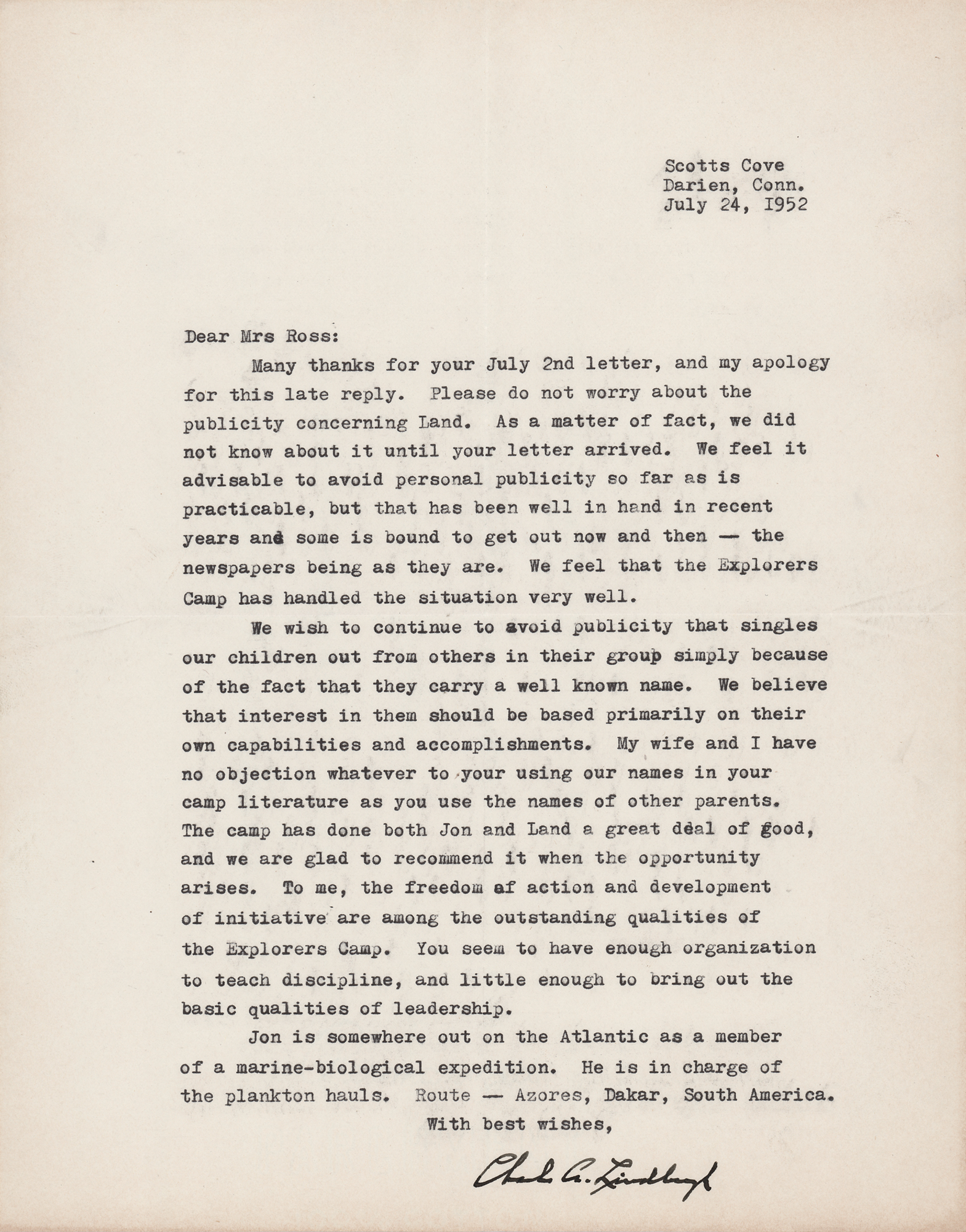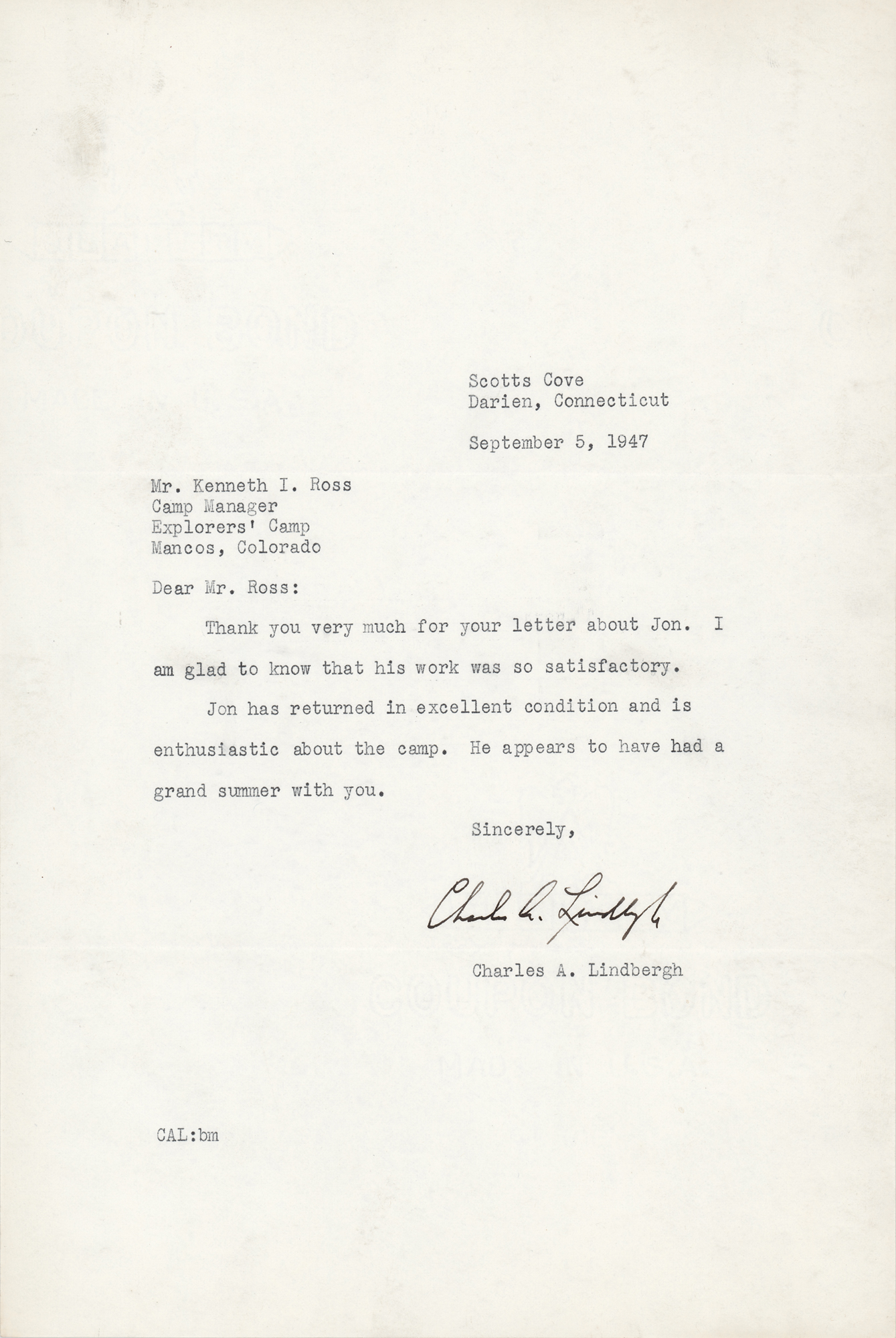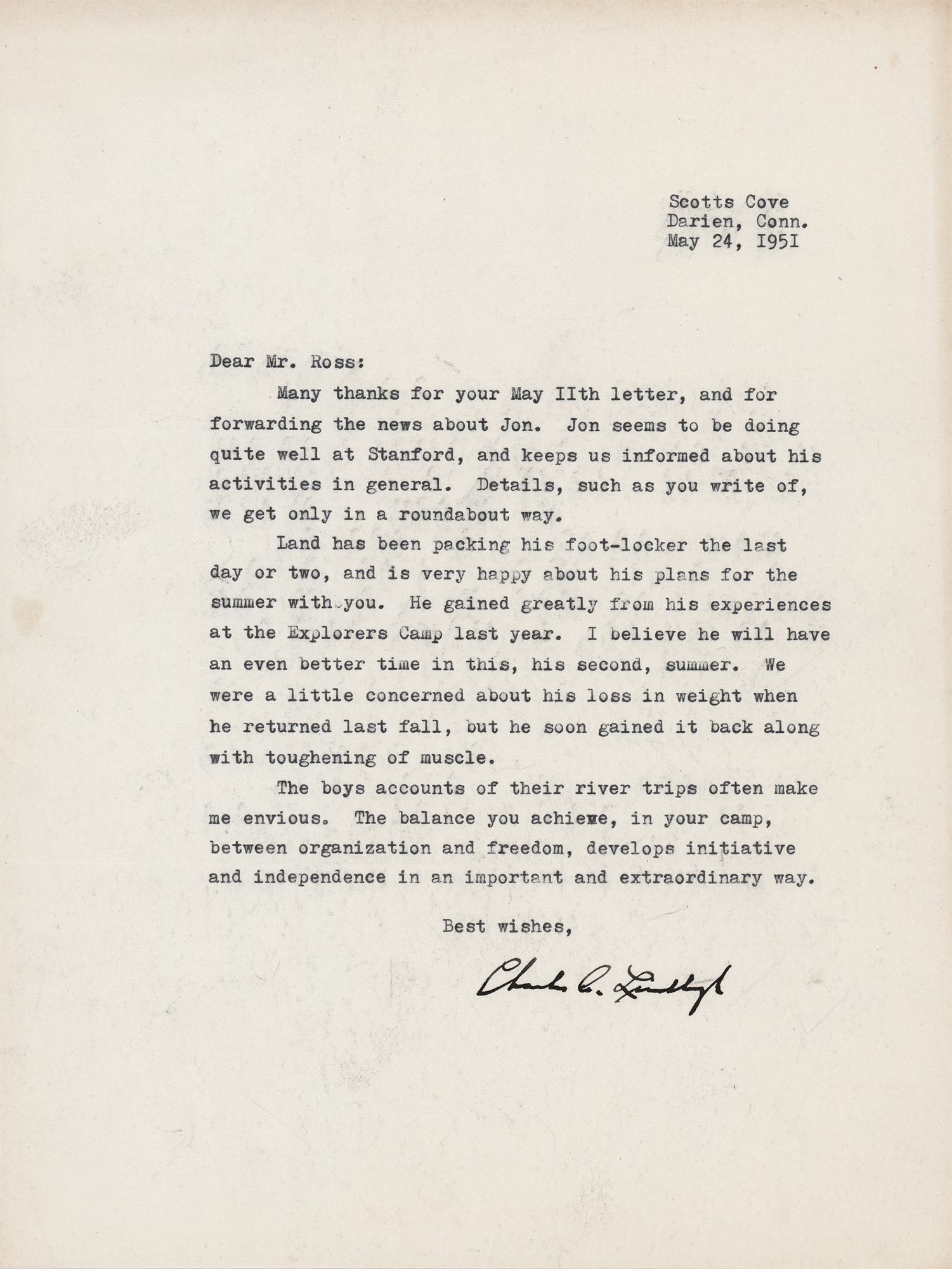 Archive of six TLSs signed "Charles A. Lindbergh," totaling eight pages, 8.5 x 11, dated from 1946 to 1952. Lindbergh writes to Kenneth Ross to the "Explorers' Camp, Mancos, Colorado," regarding his the attendance of his sons Jon and Land. The letters reflect his deep concern for his sons' safety and privacy during their time at the "Explorers' Camp," especially regarding risky river expeditions and public attention due to the family name. While expressing strong parental oversight, Lindbergh also consistently praises the camp’s impact on his sons' growth, independence, and character.