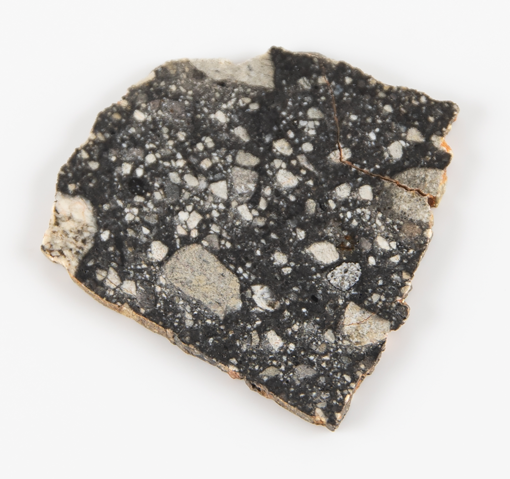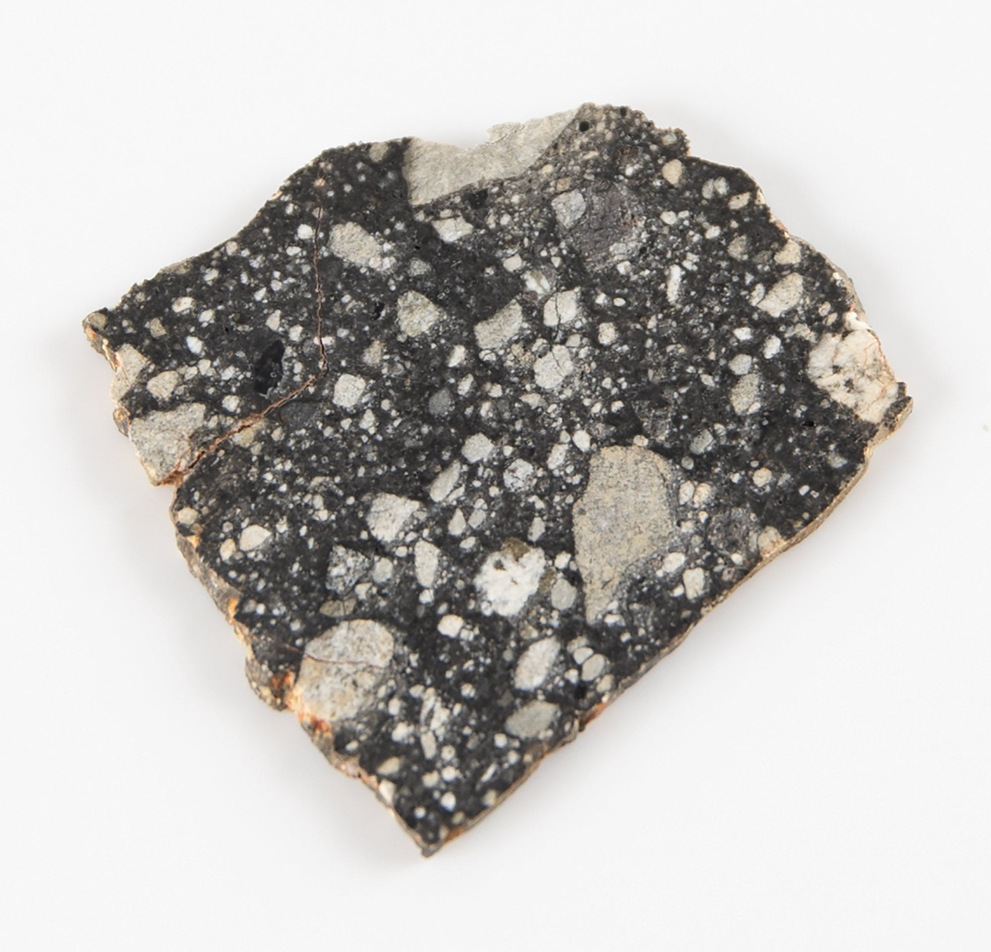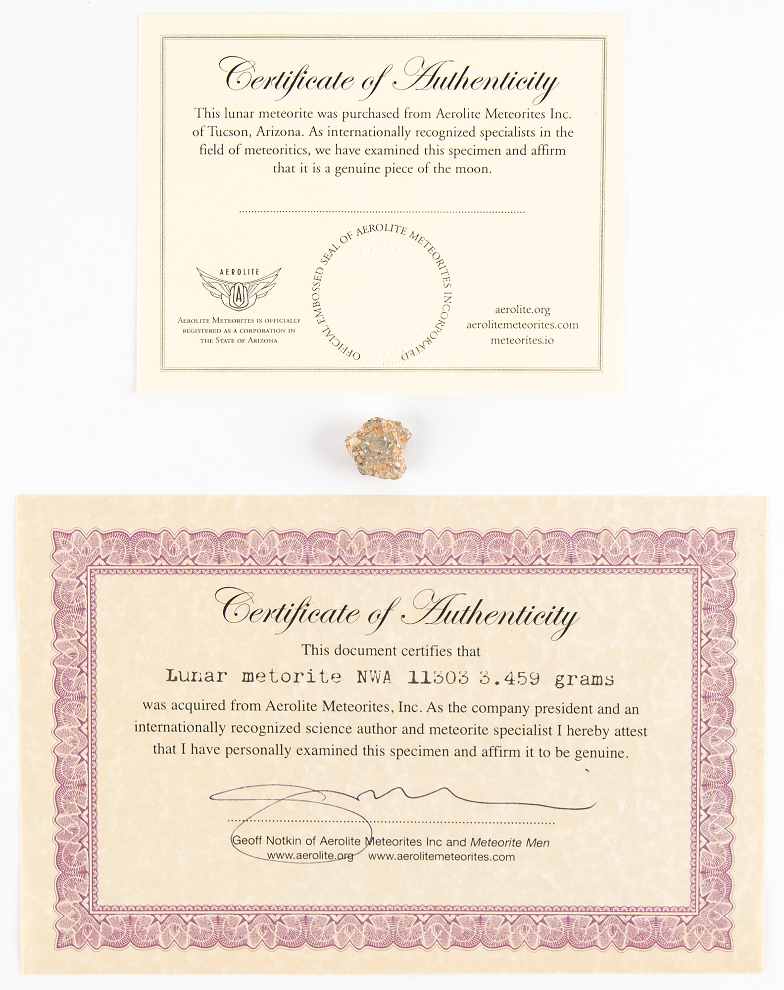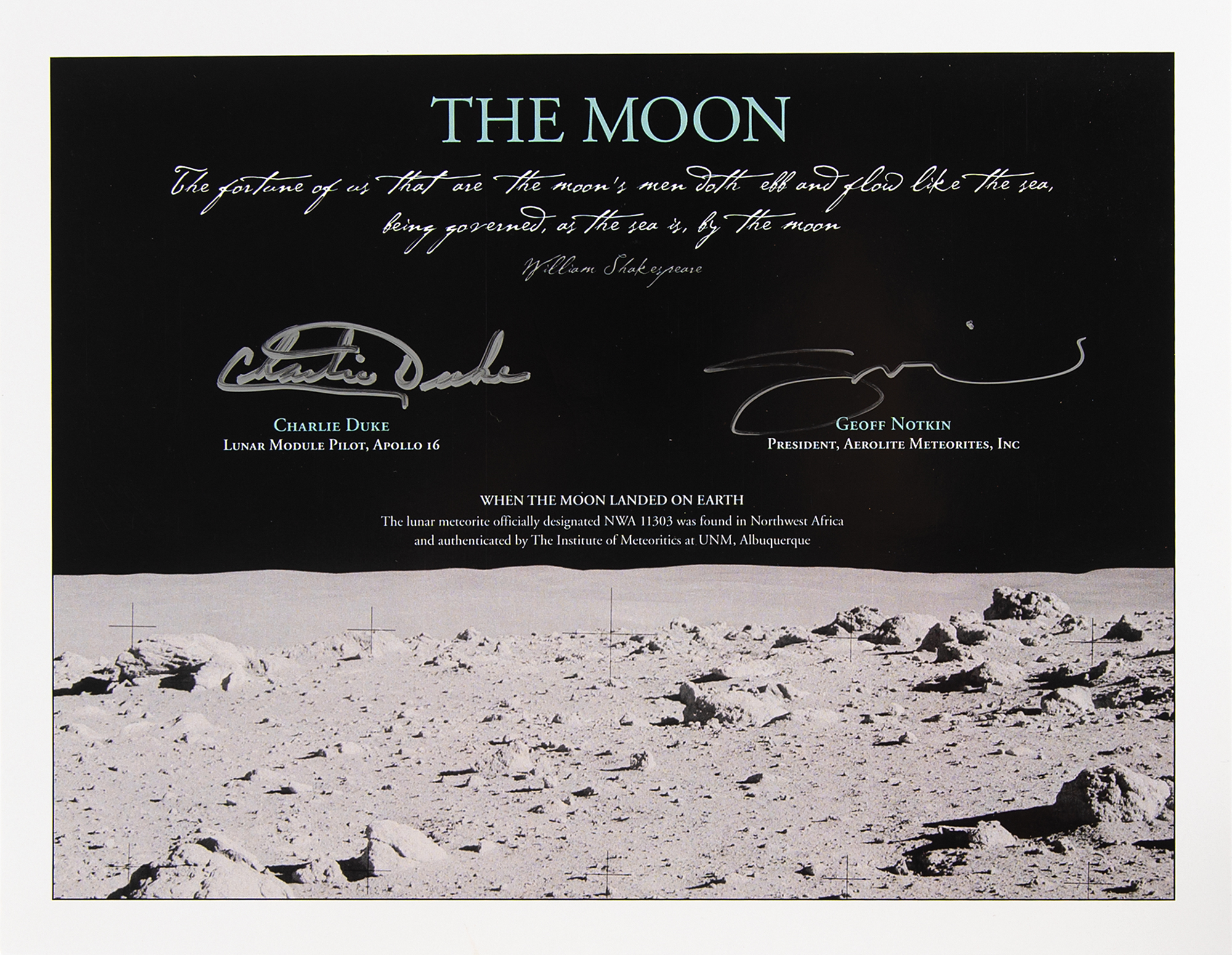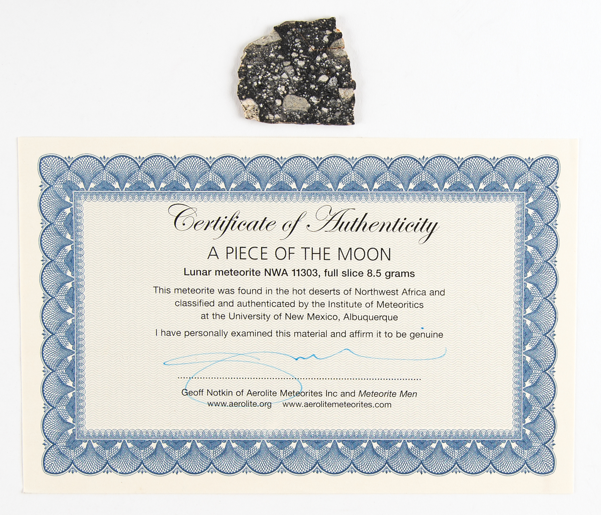 An extraordinary grouping of items: a full polished slice of the NWA 11303 lunar meteorite, weighing 8.546 grams and measuring approximately 45 mm x 40 mm x 2 mm; a 3.459-gram fragment of the same lunar meteorite, measuring approximately 20 mm x 16 mm x 8 mm; and an 11 x 8.5 color certificate of authenticity signed in silver ink by Apollo 16 moonwalker Charlie Duke and Geoff Notkin, the star of TV’s Meteorite Men. Includes two additional certificates of authenticity from Notkin's company, Aerolite Meteorites Inc.