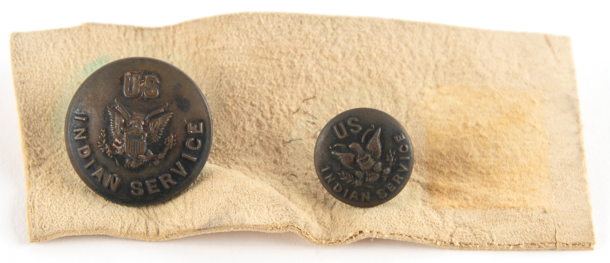 Pair of military uniform buttons attributed to Indian Scout Mitch Bouyer, an interpreter and guide affiliated with George A. Custer's 7th U.S. Cavalry who was killed at the Battle of the Little Bighorn. Includes a coat button (7/8˝) and cuff button (5.8˝), both marked "U.S. Indian Service," with American eagle device at center and "Waterbury Button Co." maker's marks on the reverse. Displayed on a piece of calfskin and housed in a small Riker box with typed attribution caption: "These Indian Service buttons were taken from the jacket of Mitch Boyer [sic] an Indian agent who was killed in the Battle of the Big Horn. He was a Custer scout. Cat. #OOD-416." In fine condition, with heavy toning and small losses to the caption, which has been laminated with adhesive tape.