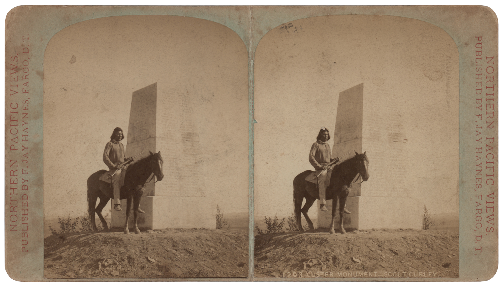 Ashishishe, known as Curly, (1856–1923), was a Crow scout in the United States Army during the Sioux Wars. He was one of the few survivors on the United States side at the Battle of Little Bighorn, and was the first to report the defeat of the 7th Cavalry Regiment. Outstanding 7 x 4 cabinet photo of the Crow scout on horseback at the Custer Monument, taken years after the Battle of the Little Bighorn, published by F. Jay Haynes of Fargo, Dakota Territory, as part of a "Northern Pacific Views" series. In very good condition, with a central vertical crease and light foxing and toning.