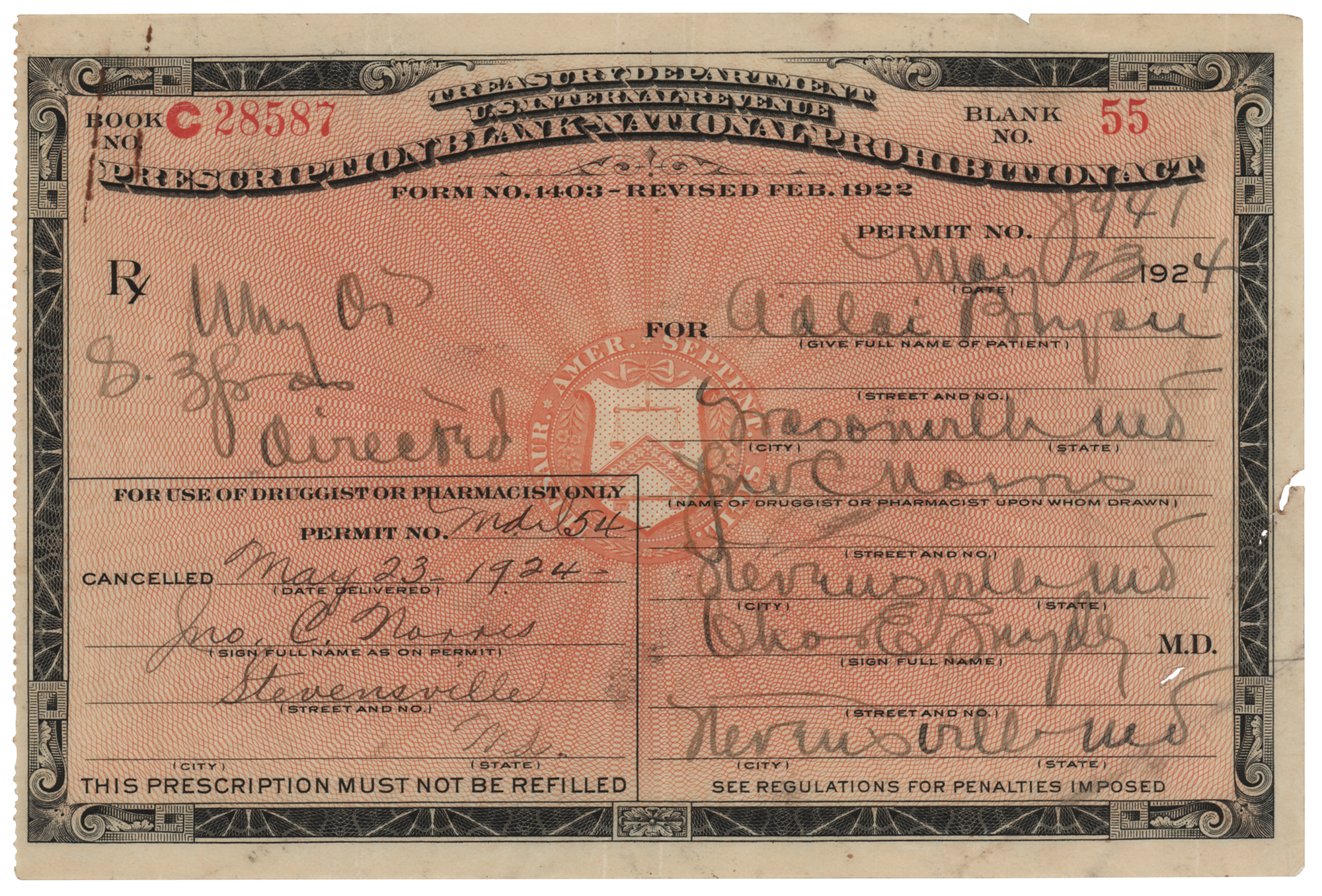 Partly-printed form headed "Prescription Blank - National Prohibition Act," one page, 6.5 x 4.5, May 23, 1924. Issued under the authority of the National Prohibition Act, a medicinal liquor prescription listing the "Rx" as "Why [Whiskey]," filled by a pharmacist in Stevensville, Maryland. Text printed in the lower left notes: "This prescription must not be refilled." In fine condition, with vertical folds.