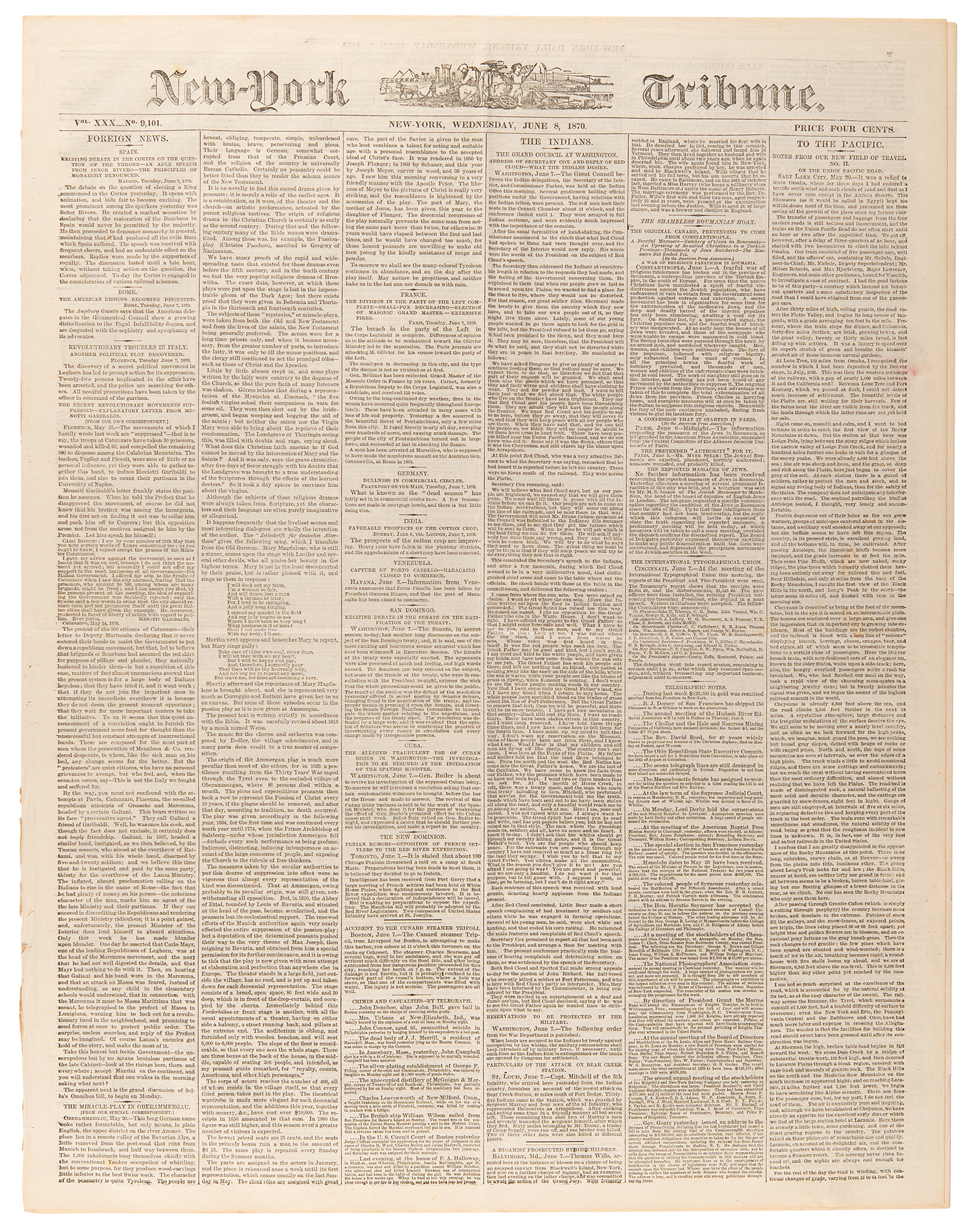 Complete issue of the New-York Tribune from June 8, 1870, 18 x 23.25, eight pages, with coverage of Red Cloud's visit to Washington, D.C., to speak with President Ulysses S. Grant. The fourth columns, headed, "The Indians," details "The Grand Council at Washington, Address of Secretary Cox and Reply of Red Cloud—What the Indians Desire." It includes the text of Red Cloud's famous speech, beginning: "I came from where the sun sets. You were raised on chairs; I want to sit where the sun sets. [Here the Indian warrior sat upon the floor in Indian fashion and proceeded.] The Great Spirit has raised me in this way. He raised me naked. I run no opposition to the Great Father who sits in the White House. I don’t want to fight." In fine condition, with central vertical and horizontal folds.