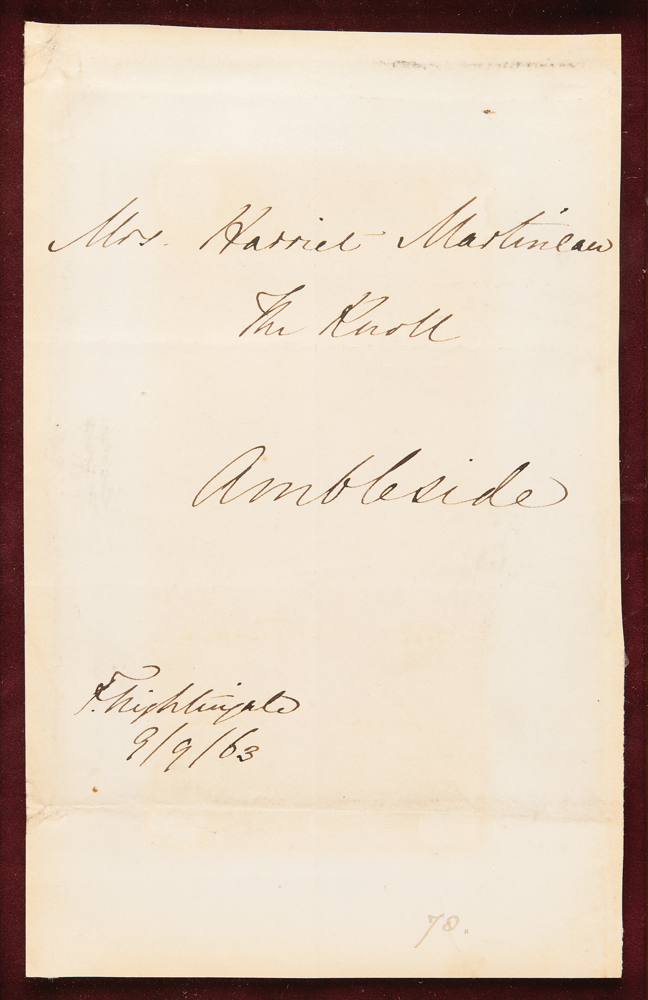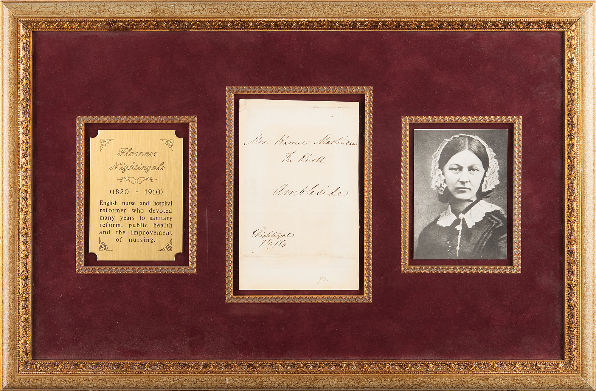 Hand-addressed and signed mailing panel, 4.5 x 7.25, addressed in Nightingale's hand to "Mrs. Harriet Martineau, The Knoll, Ambleside,” and signed below, "F. Nightingale, 9/9/63." Archivally mounted, suede-matted, and framed with a plaque and portrait to an overall size of 22.5 x 15. In fine condition.