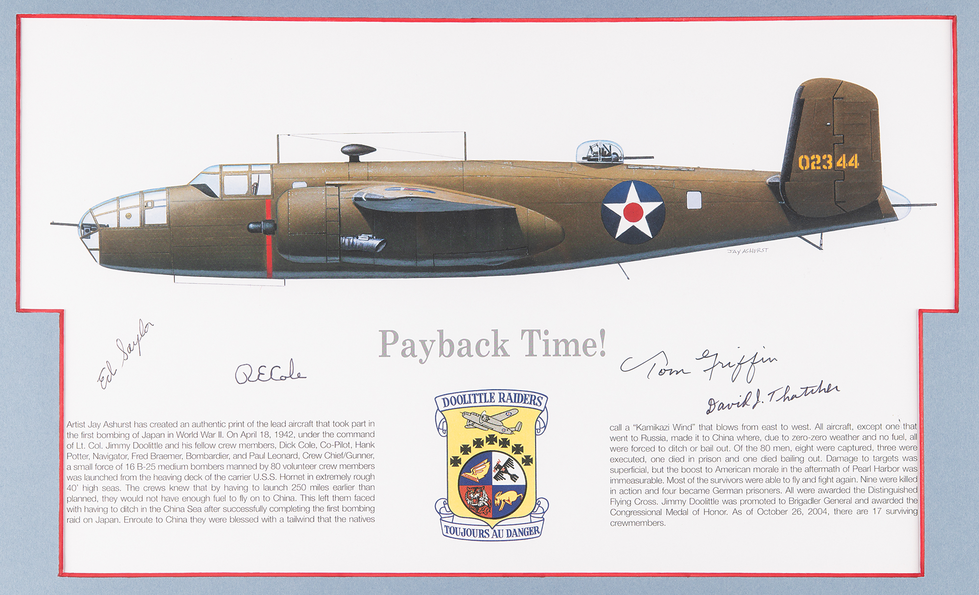 Color 16 x 9.25 print entitled 'Payback Time!,' signed in black felt tip by Ed Saylor, R. E. Cole, Tom Griffin, and David J. Thatcher; and felt tip signatures of Ed Horton, William L. Birch, and Frank A. Kappeler on individual off-white 3.5 x 2 custom-made collector's cards. Matted together with photos of the latter three to an overall size of 19 x 21. In overall fine condition.