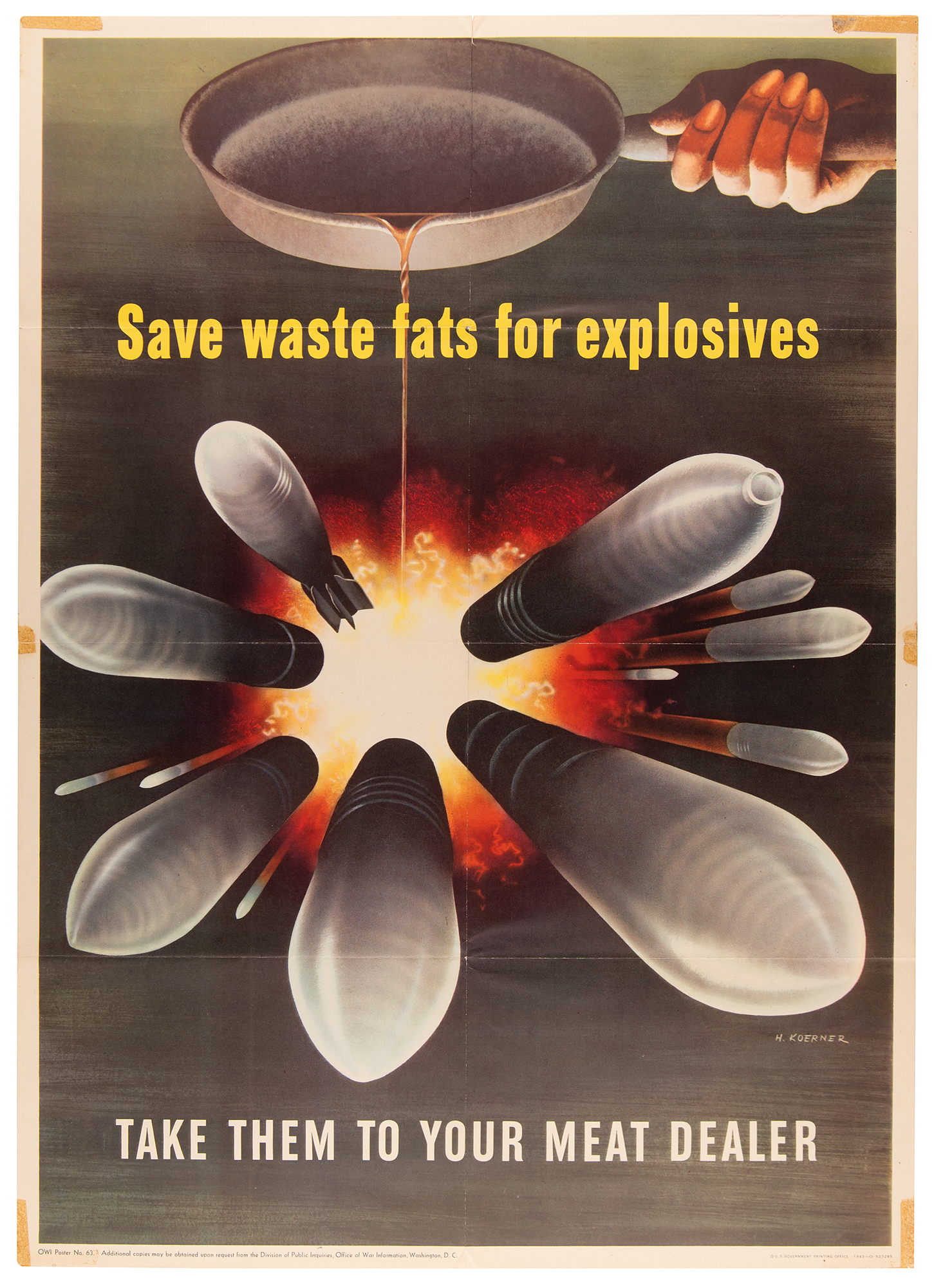 Original World War II-era color 20 x 28 poster featuring dramatic artwork by Henry Koerner showing a frying pan pouring grease over a dozen American munitions, reading: "Save waste fats for explosives, take them to your meat dealer." Published in 1943 by the Office of War Information (OWI Poster No. 63). In very good to fine condition, with standard folds and some adhesive staining to the borders. An unusual poster encouraging conservation and recycling as part of the homefront's war effort.