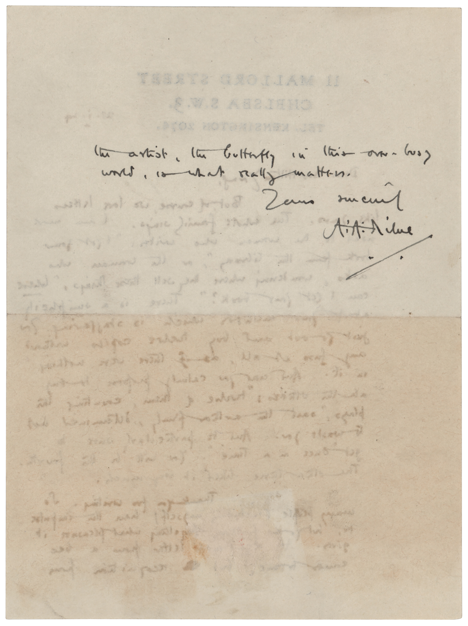 ALS, one page both sides, 4.5 x 6, 11 Mallord Street letterhead, January 28, 1924. Handwritten letter to Mrs. Hilton Young, regarding the sale of his works: "But, of course, we love letters like yours. The whole family sings. I am more used to the woman who writes: 'I got your book from the library,' or the woman who asks, wondering where they sell these things, 'Where can I get your book?' There is a simplicity about your method which is staggering: You just go out and buy twelve copies without any fuss at all, as if there were nothing in it. And now you calmly propose to buy all the others: 'twelve of them, counting the plays,' said the author firmly, determined not to waste you. And be particularly sure to get 'One on a Time.' You will be the fourth. The other three liked it very much." In fine condition, with light toning over the blank lower half of the second page.