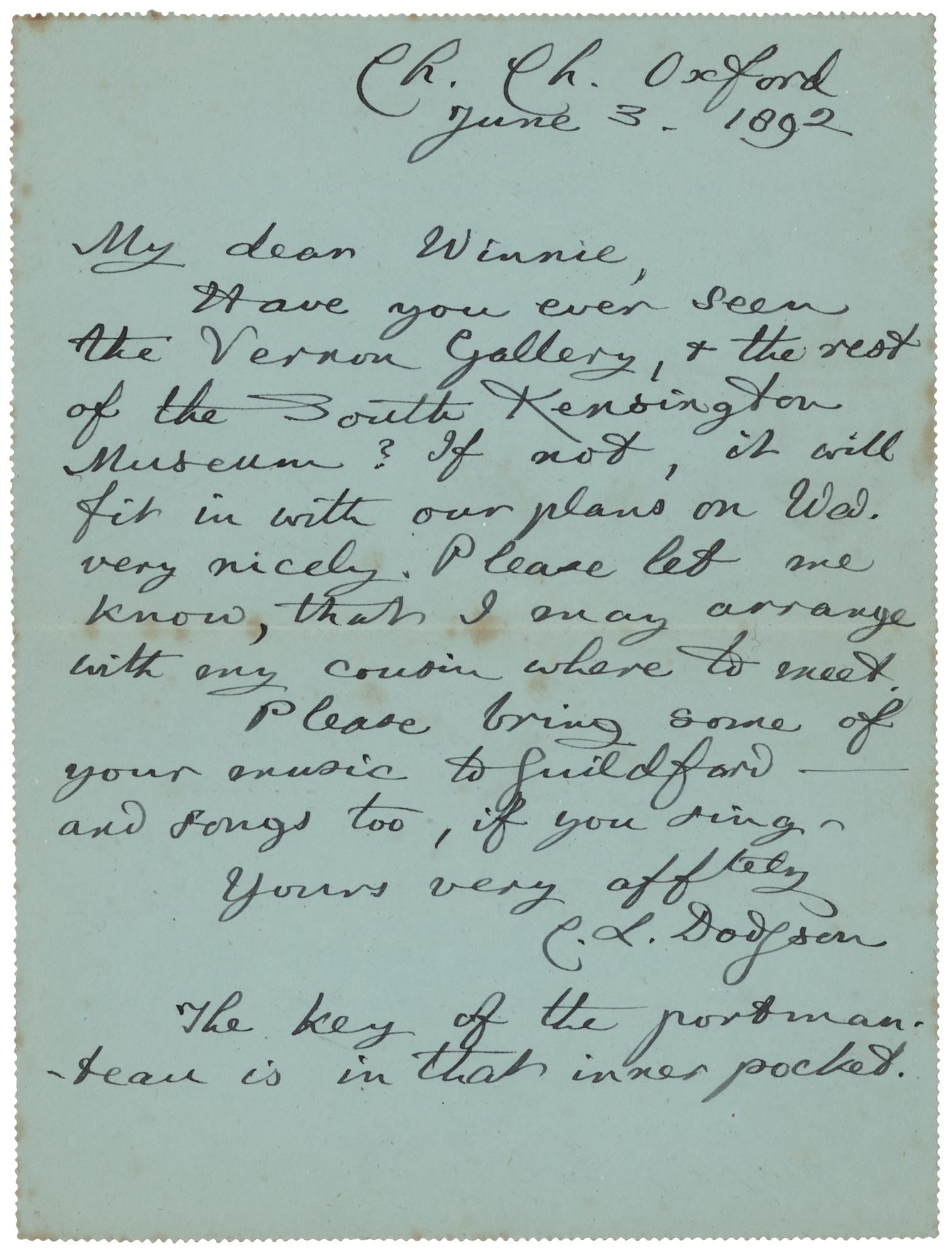 ALS signed “C. L. Dodgson,” one page, 4.75 x 6.25, June 3, 1892. Handwritten letter to Winnie Stevens, in full: "Have you ever seen the Vernon Gallery, & the rest of the South Kensington Museum? If not, it will fit in with your plans on Wed. very nicely. Please let me know, that I may arrange with my cousin where to meet. Please bring some of your music to Guildford—and songs too, if you sing." He adds a mysterious postscript: "The key of the portmanteau is in that inner pocket." Addressed on the reverse in Dodgson's own hand. In fine condition, with a few tiny stains.