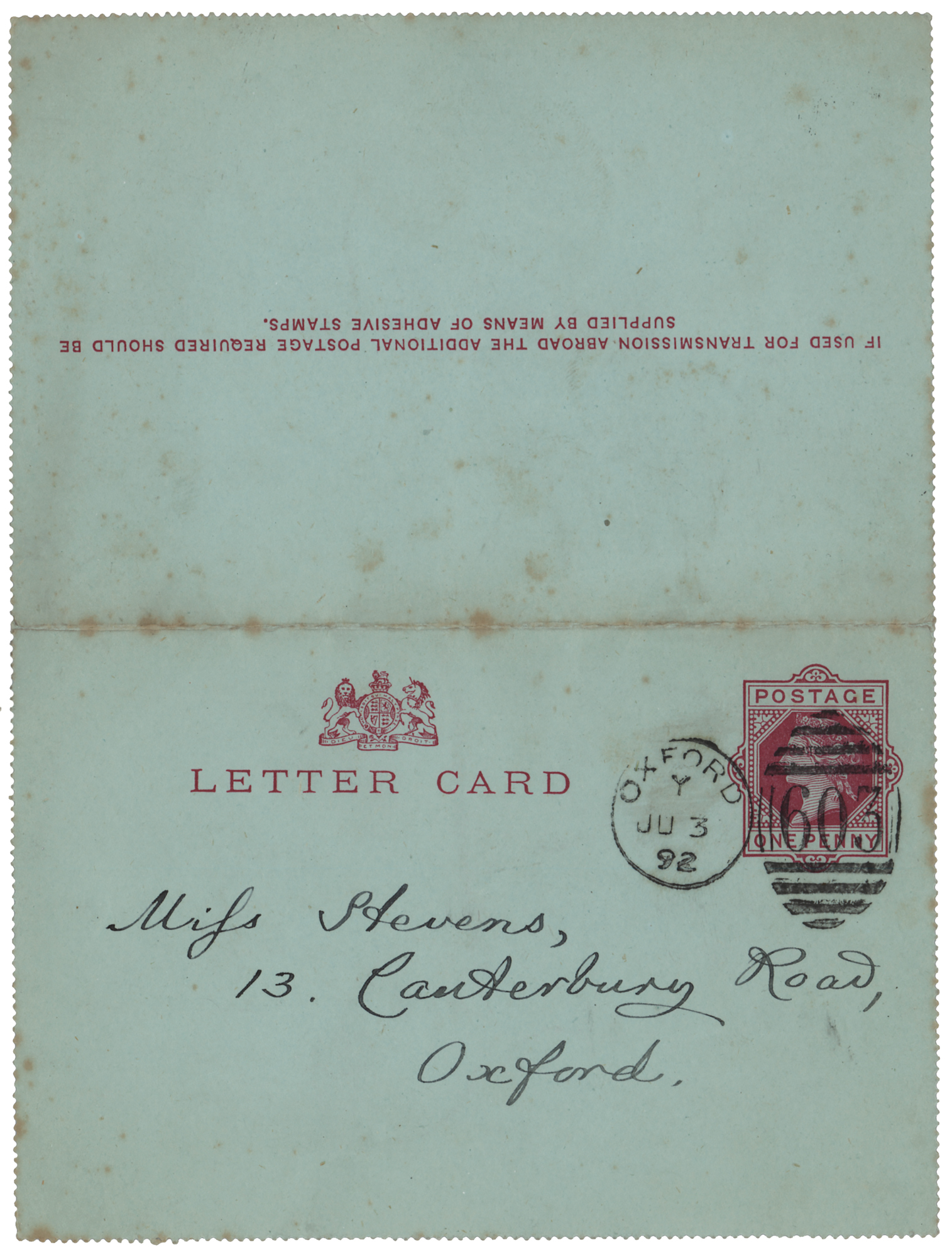 Winifred Stevens (later Lady Hawke, 1872–1958) enjoyed a friendship with Lewis Carroll that spanned more than a decade. On June 8, 1892, the two spent the day in London visiting the South Kensington Museum and attending a performance of Richelieu starring Henry Irving and Ellen Terry, before traveling to Guildford for a two-night stay. At the time, Carroll was 50 and Winifred was 20.