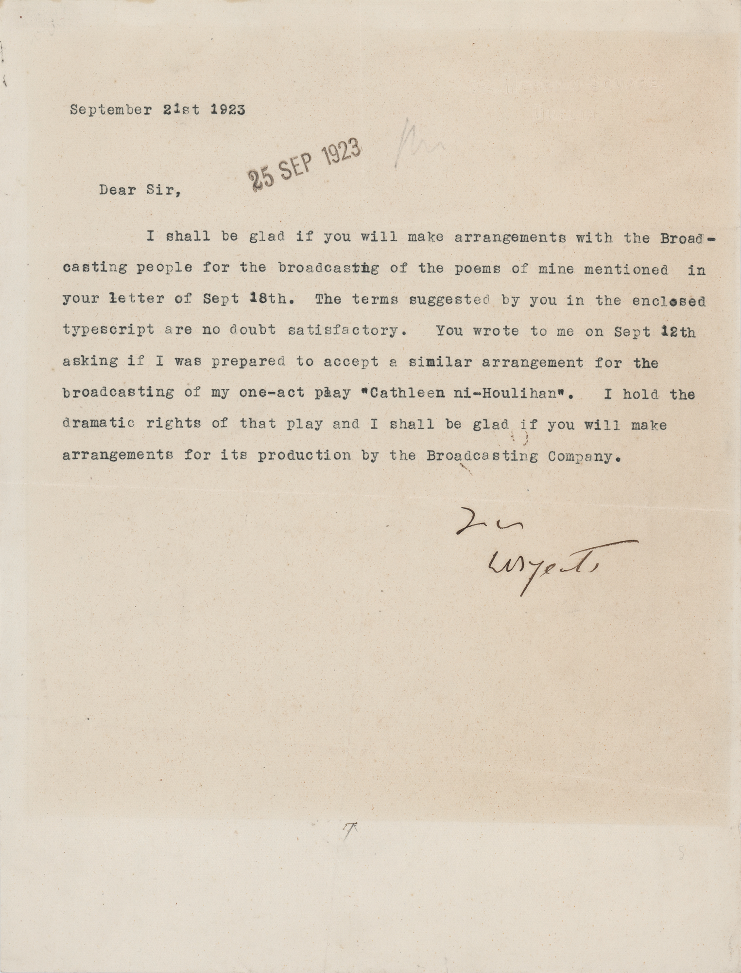 TLS, one page, 8 x 10.5, blindstamped 82 Merrion Square letterhead, September 21, 1923. Letter arranging publicly broadcast readings of his works, in part: "I shall be glad if you will make arrangements with the Broadcasting people for the broadcasting of the poems of mine mentioned in your letter…The terms suggested by you in the enclosed typescript are no doubt satisfactory. You wrote to me on Sept. 12th asking if I was prepared to accept a similar arrangement for the broadcasting of my one-act play 'Cathleen ni-Houlihan.' I hold the dramatic rights of that play and I shall be glad if you will make arrangements for its production." In fine condition, with a couple of light creases, and toning from prior display.