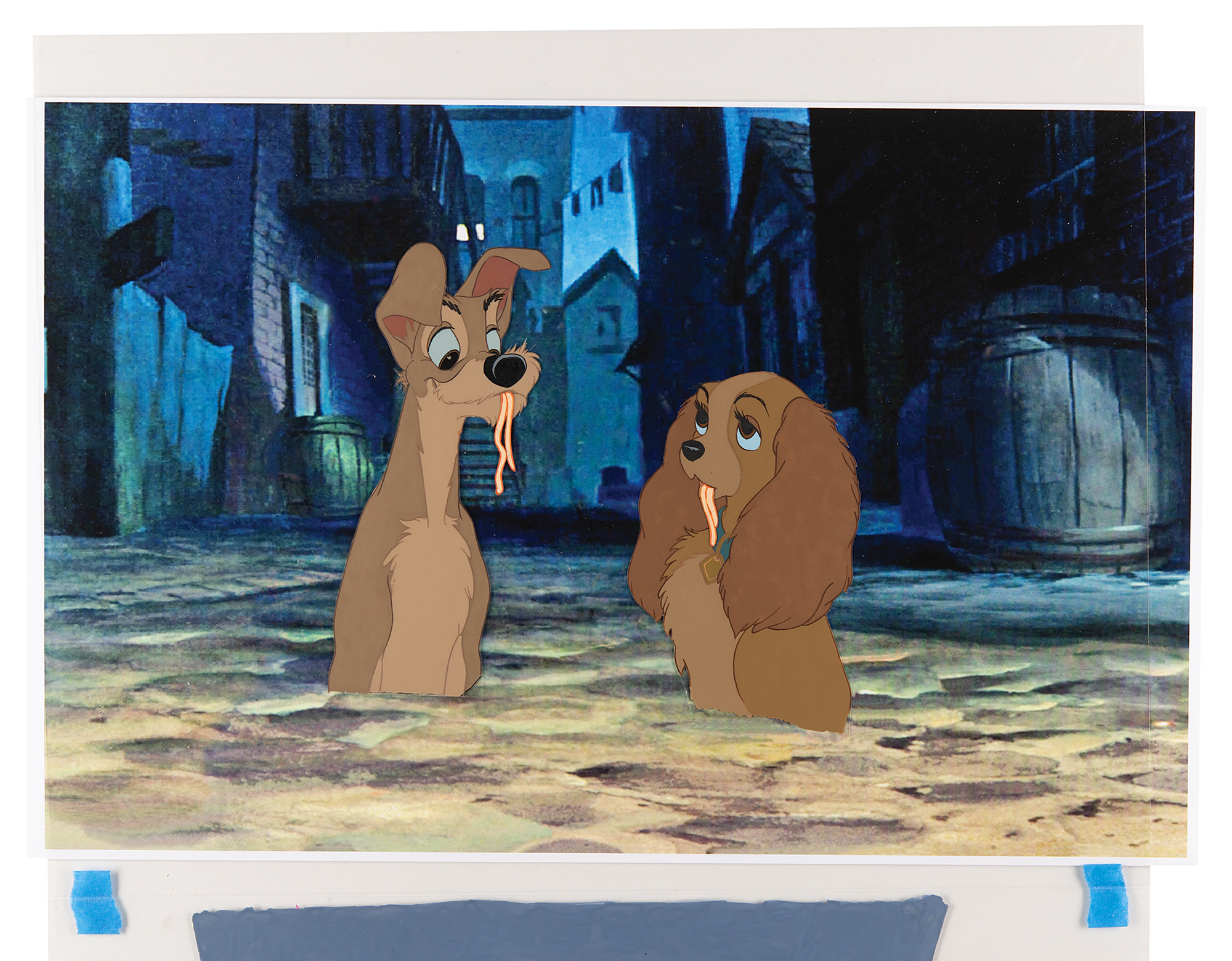 (Walt Disney Studios, 1955) Original production cel set-up of the two title characters from Lady and Tramp, showing the canine couple eating spaghetti in an alleyway behind Tony's Restaurant during the film’s memorable 'Bella Notte' sequence. Deriving from the personal collection of a Disney animator who added a hand-painted foreground cel that is nearly identical to the film’s original; the foreground features a linen-draped table, a lit candle, breadsticks, and a plate of spaghetti. The cels of Lady and Tramp were trimmed to image, as were the strands of spaghetti hanging from their mouths, and applied to a larger cel, which is placed on a matching color laser background. Character images measure 3 x 6.5 (Tramp), 3.25 x 5.25 (Lady), and 11 x 8 (table with candle), with overall dimensions of 17 x 12.5. The animator created this set-up circa 2000-2003 in the same manner as the classic ‘Art Props’ set-ups matted and signed by Walt Disney for studio VIPs. In fine condition. This rare and beautiful setup brings to life the memorable ‘Bella Notte’ scene that climaxes in the 'spaghetti kiss,' an iconic moment in American cinema.