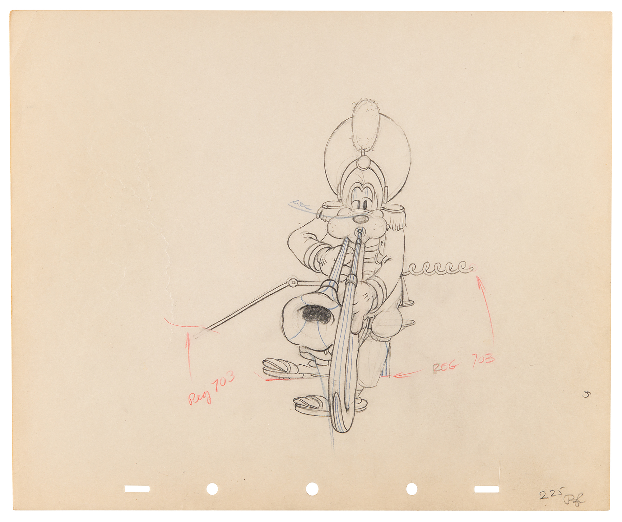 (Walt Disney Studios, 1937) Original production drawing of Goofy from Mickey's Amateurs, showing the musical pooch in full band leader attire while he attempts to play his ‘50-piece band,’ a multi-instrumental device on wheels. Accomplished in graphite and colored pencil on untrimmed 12 x 10 animation paper marked "225" in the lower right corner. Image measures 5.5 x 6.75. In fine condition, with some crinkling to the left side.