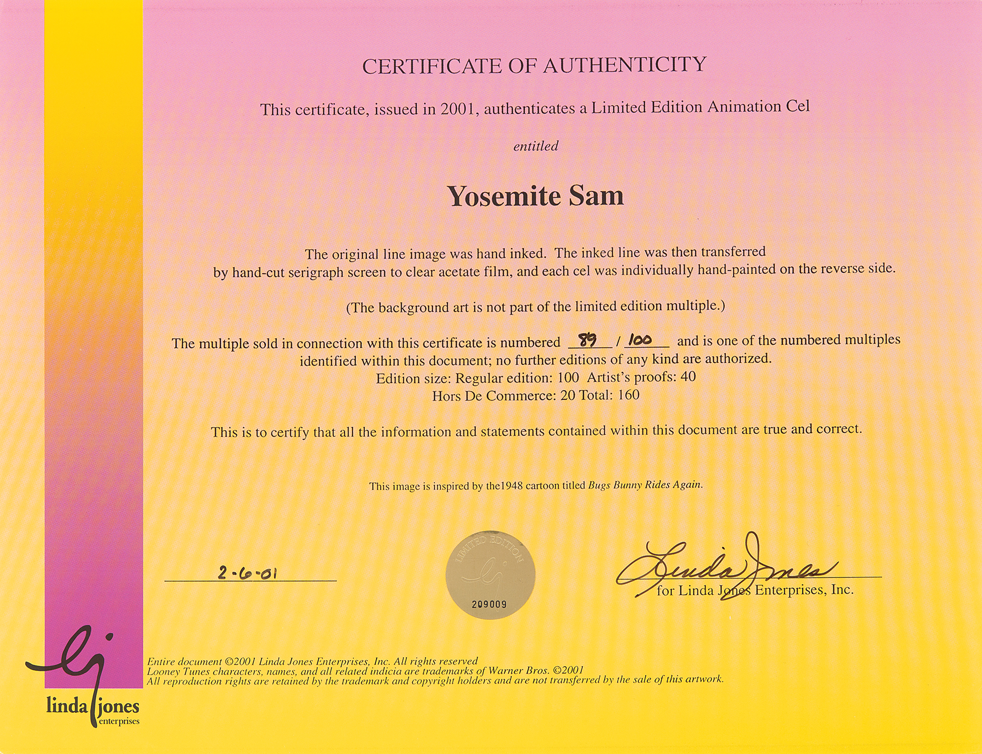 (Warner Brothers Studios, 2001) Original limited edition cel entitled 'Yosemite Sam,' numbered 89/100, released as part of the Termite Terrace II Portfolio, which shows Yosemite Sam with pistols drawn having walked under the swinging doors of an Old West saloon, a scene inspired by the 1948 cartoon Bugs Bunny Rides Again. The cel bears a 2001 Warner Bros. copyright mark and is signed in black felt tip by voice actor Noel Blanc, son of the late cartoon voice actor Mel Blanc. The cel is placed on a matching studio copy background. Image measures 5.5 x 4.75, with overall dimensions of 12.5 x 10.5. The lower left corner bears a Linda Jones Enterprises label. In fine condition. Accompanied by a certificate of authenticity from Linda Jones Enterprises.