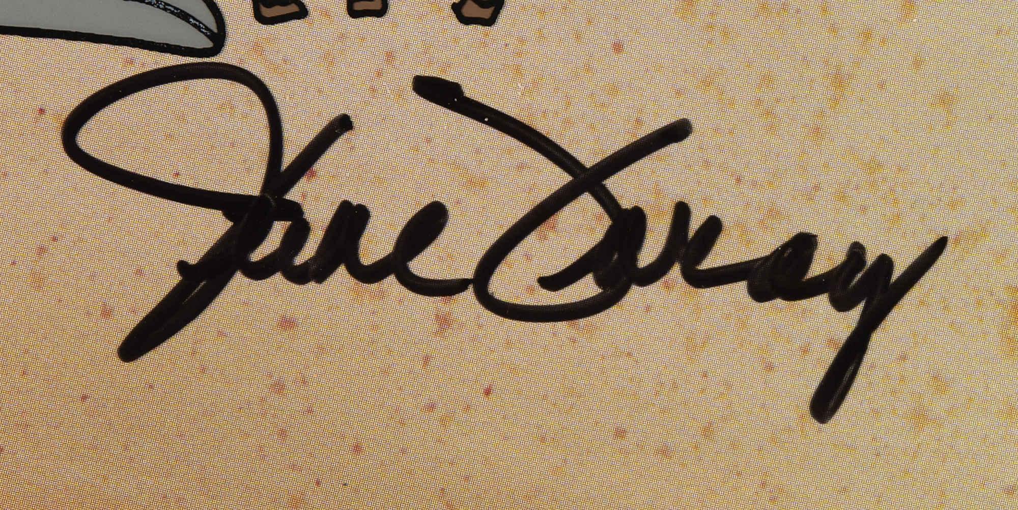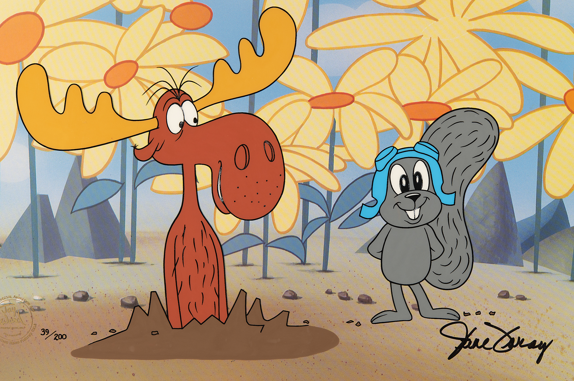 (Jay Ward Productions, 1994) Original limited edition cel featuring Rocky and Bullwinkle of the famed The Adventures of Rocky and Bullwinkle and Friends television show, numbered 39/200, signed in black felt tip by June Foray, who provided the voice for Rocky, Natasha Fatale, and Nell Fenwick. The cel is placed on a matching studio copy background. Character images measure 3.25 x 5 (Rocky) and 7.5 x 8 (Bullwinkle and ground), with overall dimensions of 16.5 x 13.5. The lower left corner bears a golden Jay Ward Production seal. In fine condition.