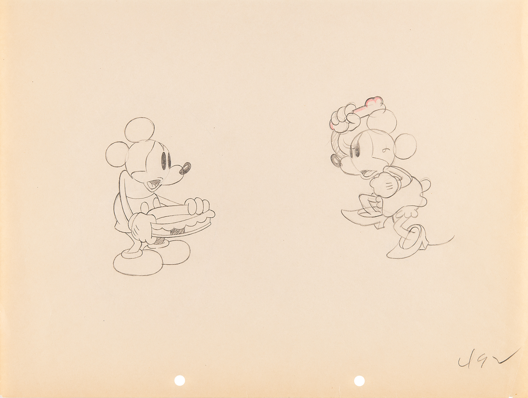 (Walt Disney Studios, 1933) Original production drawing of Mickey and Minnie Mouse from Puppy Love, which shows the quarreling mice in full-figure poses, with Mickey holding an empty heart-shaped box and Minnie holding a dog bone above her head. Accomplished in graphite and colored pencil on slightly trimmed 11.75 x 9.5 animation paper, marked "492" in the lower right corner. Both images approximately measure 2.5 x 3.5. In fine condition, with a crease to the lower right corner.