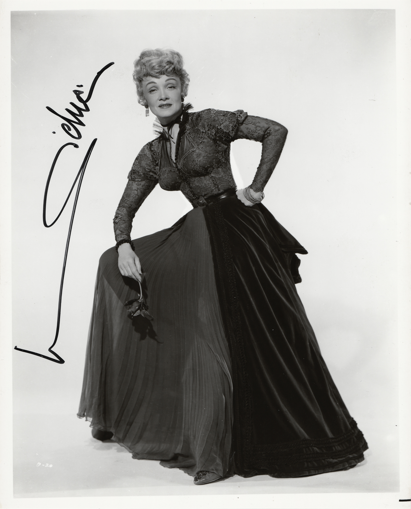 Glossy 8 x 10 full-length photo of Marlene Dietrich posing as Altar Keane in a publicity shoot for the 1952 Western film Rancho Notorious, signed in black felt tip. In fine condition.