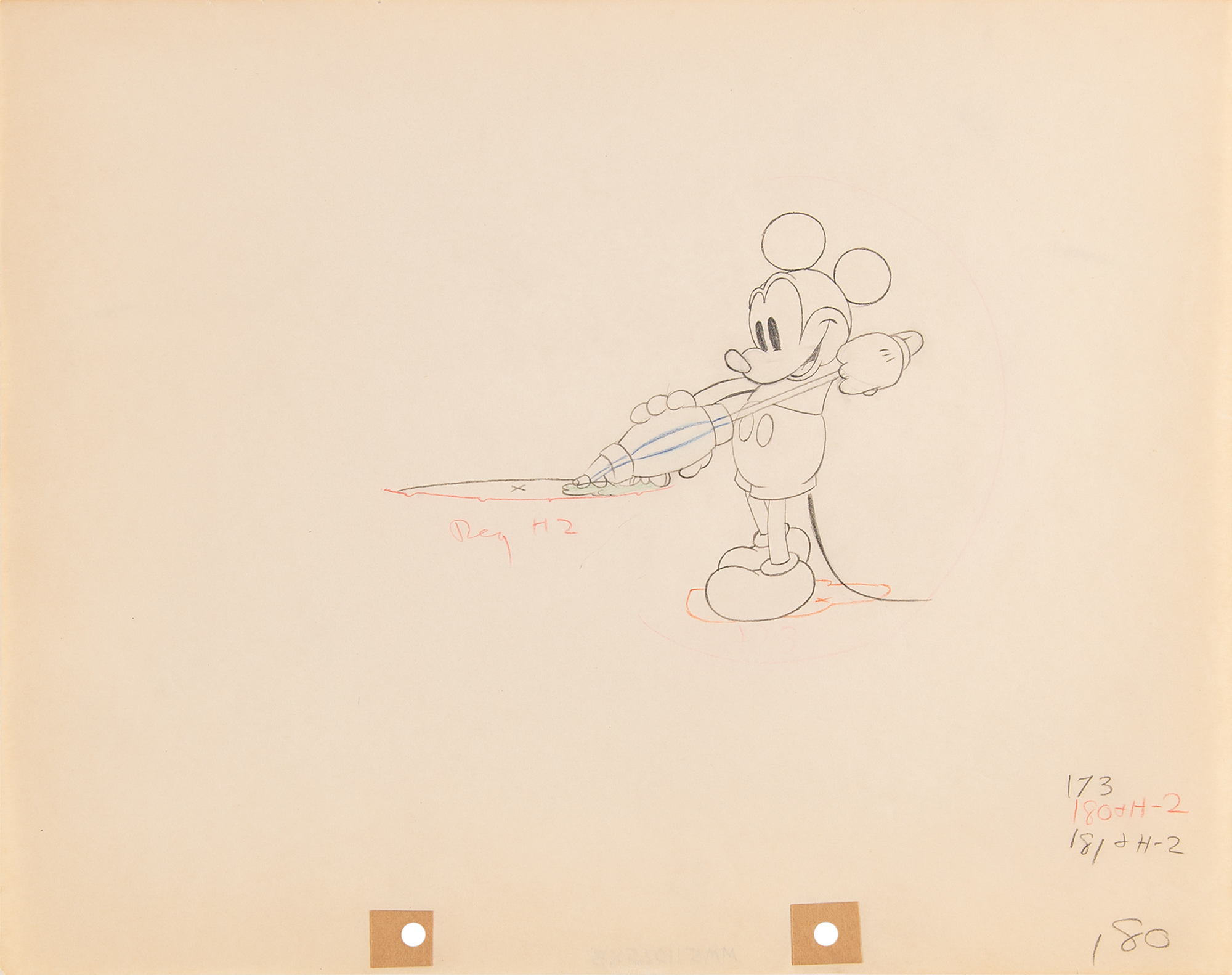 (Walt Disney Studios, 1935) Original production drawing featuring Mickey Mouse from Mickey's Garden, showing him refilling his bug sprayer. Accomplished in graphite and colored pencil on untrimmed 12 x 9.5 animation paper marked "180" in the lower right corner. Image measures 3.5 x 4. In fine condition. Mickey’s Garden holds a pair of notable firsts in the vast Mickey Mouse filmography: it marked the first color appearance of Pluto, and it was the first color cartoon where Mickey speaks, though he only does so at the end when Pluto starts licking him.