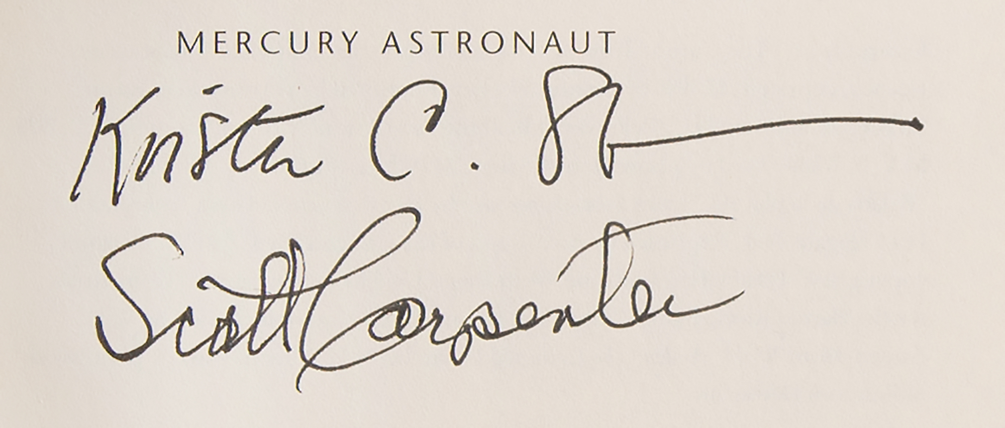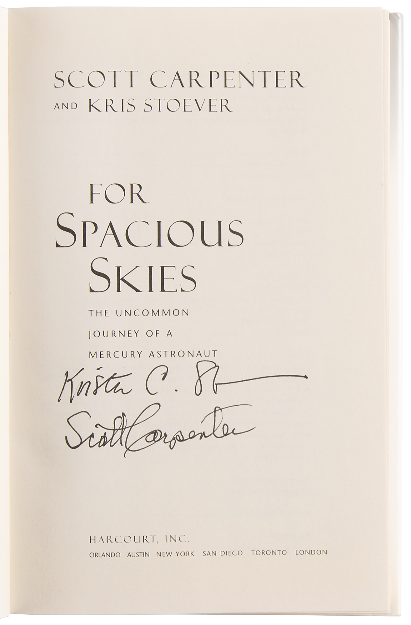 Signed book: For Spacious Skies. First edition. Orlando: Harcourt, Inc., 2002. Hardcover with dust jacket, 6.25 x 9.25, 370 pages. Signed on the title page in black felt tip by Scott Carpenter and co-author Kris Stoever. In fine condition.