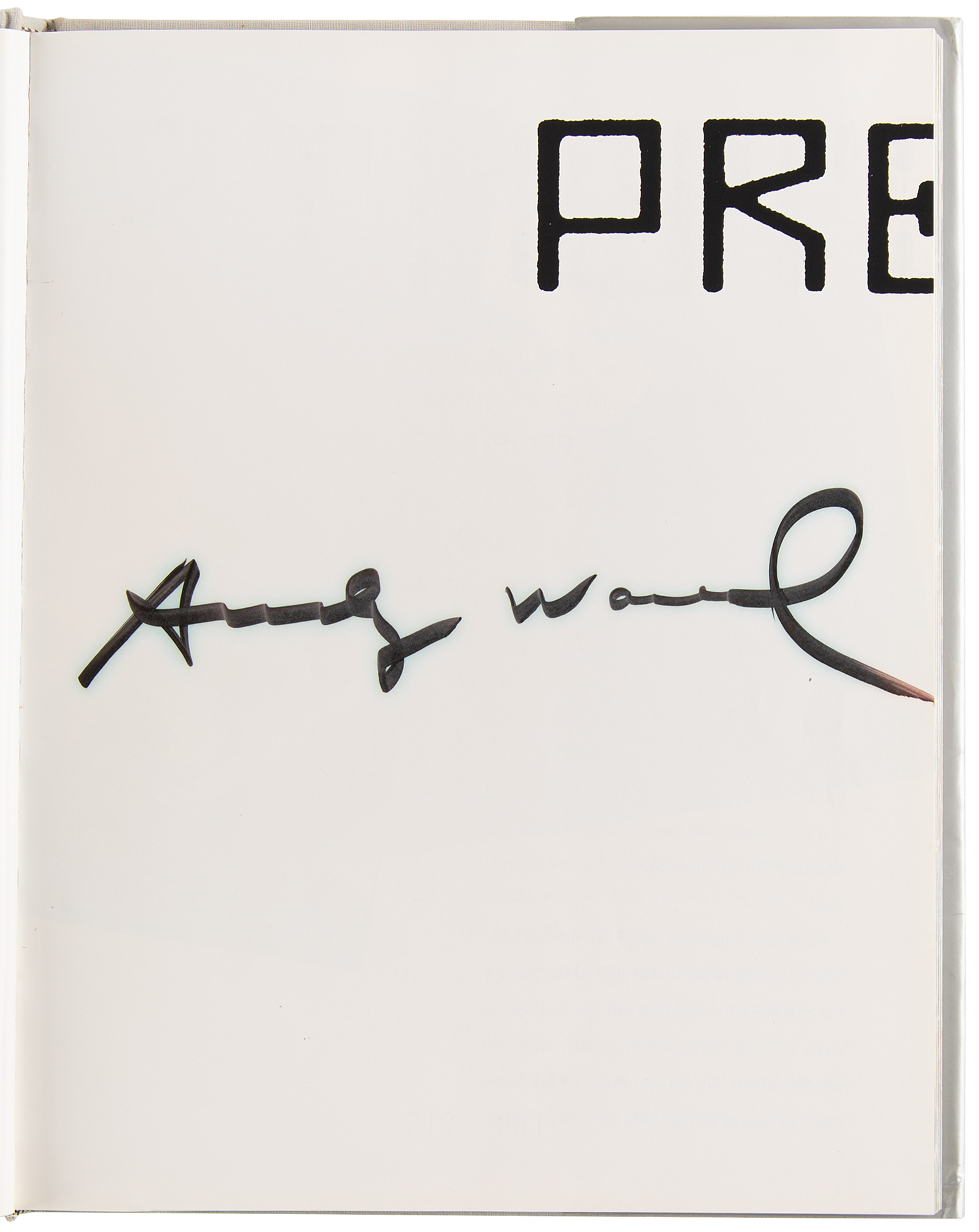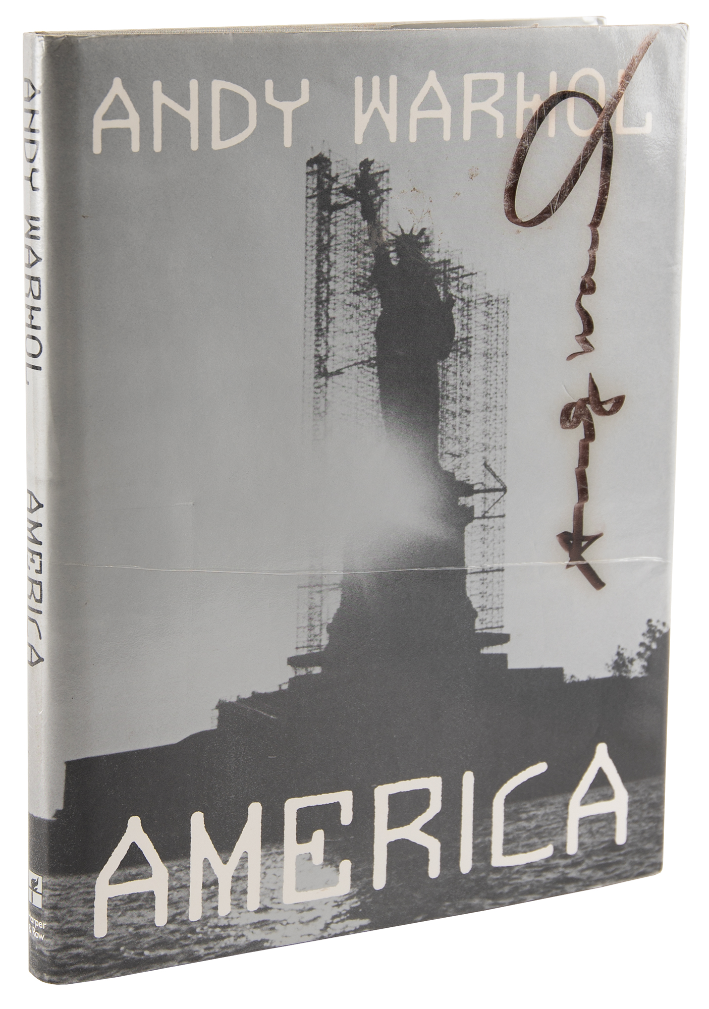 Signed book: America. First edition. NY: Harper & Row, 1985. Hardcover with dust jacket, 9 x 11.25, 224 pages. Signed on the front of the jacket in black felt tip, "Andy Warhol," and signed inside opposite the table of contents in the same manner. In fine condition, with his usual light haloing to the ink.
