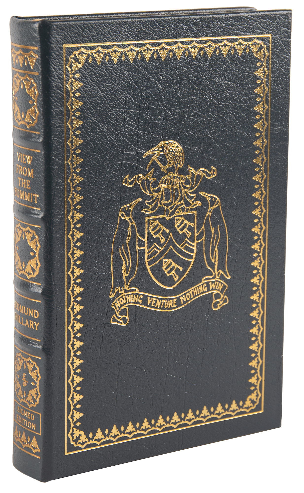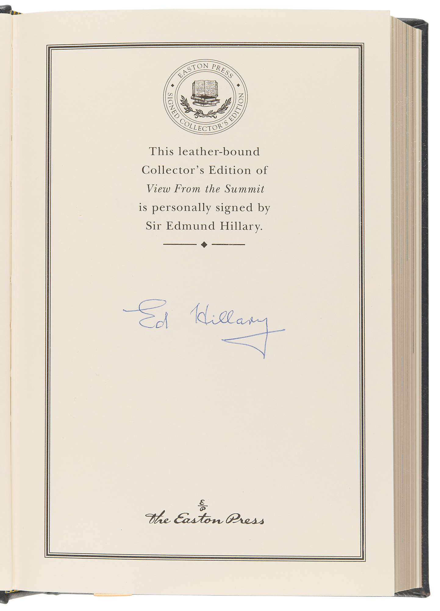 Signed book: View from the Summit. Collector's edition. Norwalk, CT: Easton Press, 1999. Leatherbound hardcover, 6.5 x 9.5, 310 pages. Signed on the colophon in blue ballpoint, "Ed Hillary." In very fine condition. Accompanied by the publisher’s certificate of authenticity.