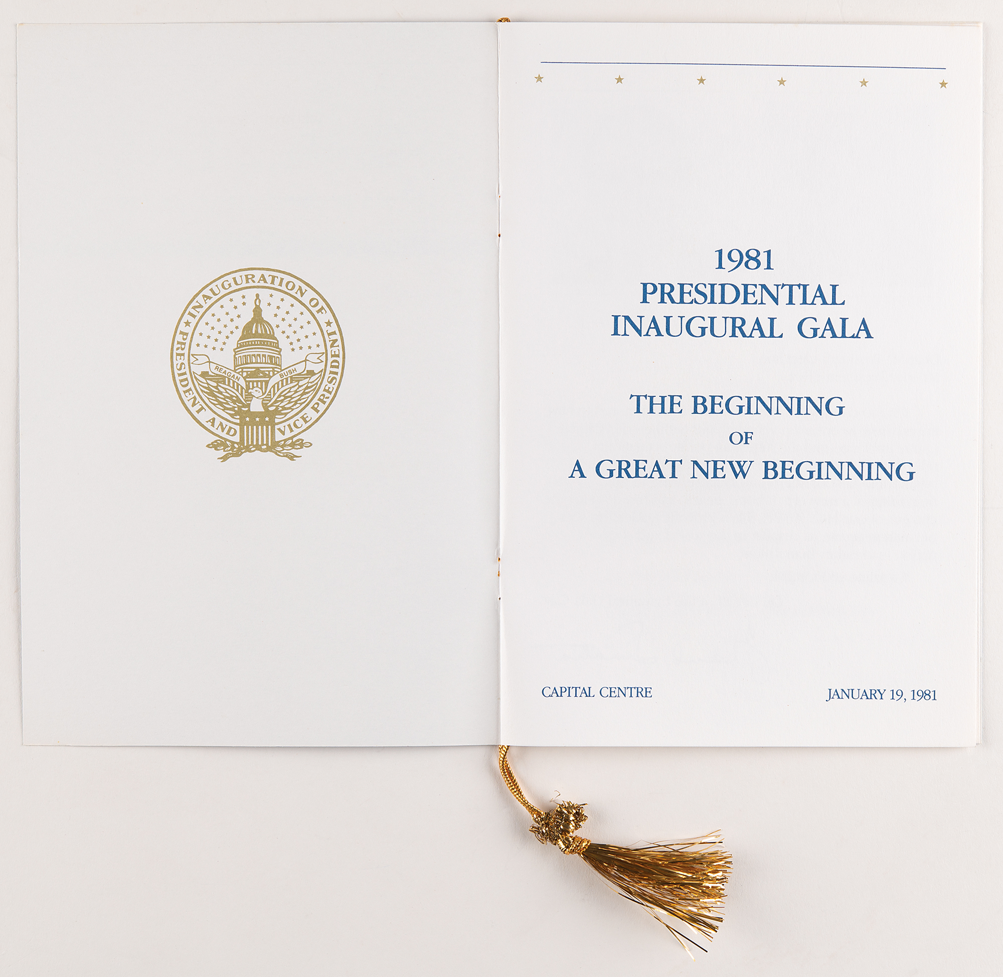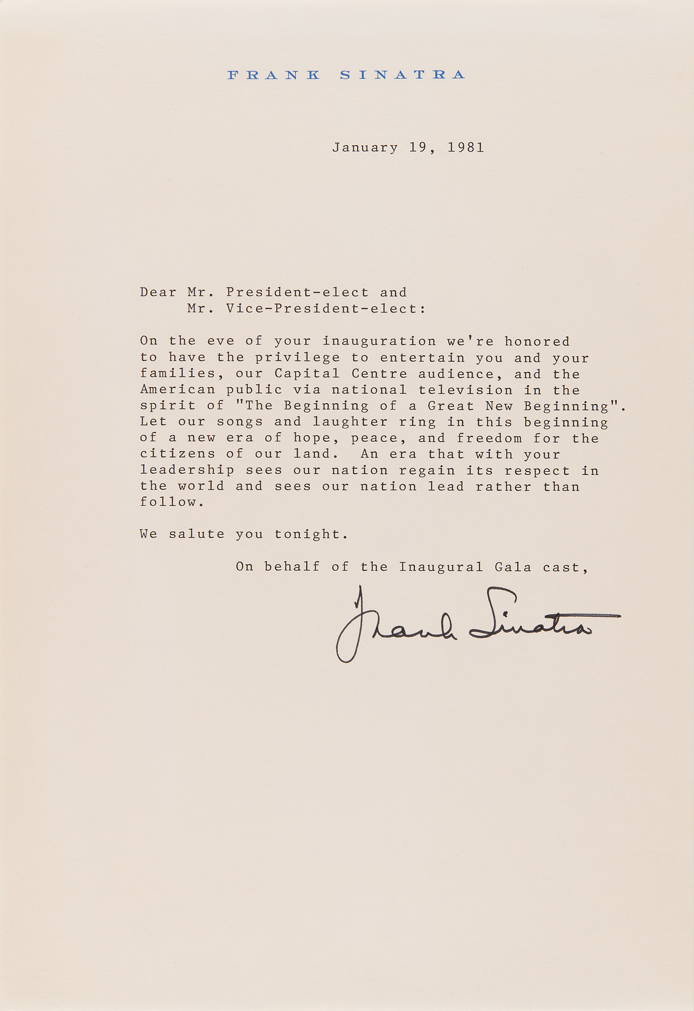 TLS from Frank Sinatra that was printed in the official program for the 1981 Presidential Inaugural Gala of Ronald Reagan. The letter, one page, 7.25 x 10.5, personal letterhead, January 19, 1981, addressed to “Mr. President-elect and Mr. Vice-President elect,” Ronald Reagan and George Bush, in full: “On the eve of your inauguration we're honored to have the privilege to entertain you and your families, our Capital Centre audience, and the American public via national television in the spirit of ‘The Beginning of a Great New Beginning.’ Let our songs and laughter ring in this beginning of a new era of hope, peace, and freedom for the citizens of our land. An era that with your leadership sees our nation regain its respect in the world and sees our nation lead rather than follow. We salute you tonight. On behalf of the Inaugural Gala cast.” In very fine condition.