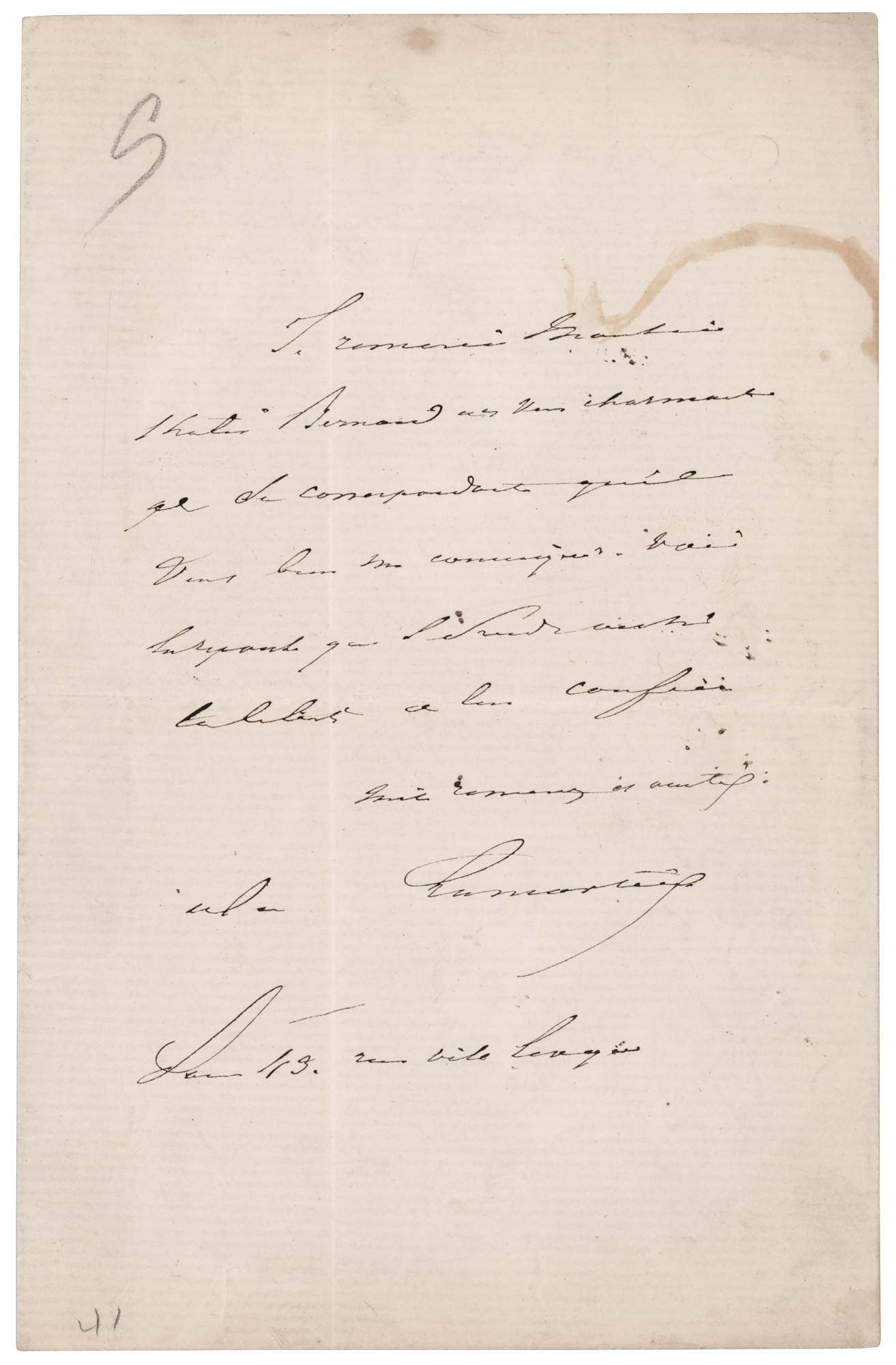French writer (1790–1869) best known for his autobiographical poem 'The Lake,' who also worked as a diplomat and politician in the Second Republic. ALS in French, signed “Lamartine,” one page, 5 x 8, no date. Untranslated handwritten letter by Alphonse de Lamartine. In fine condition, with a couple of stains at the top.
