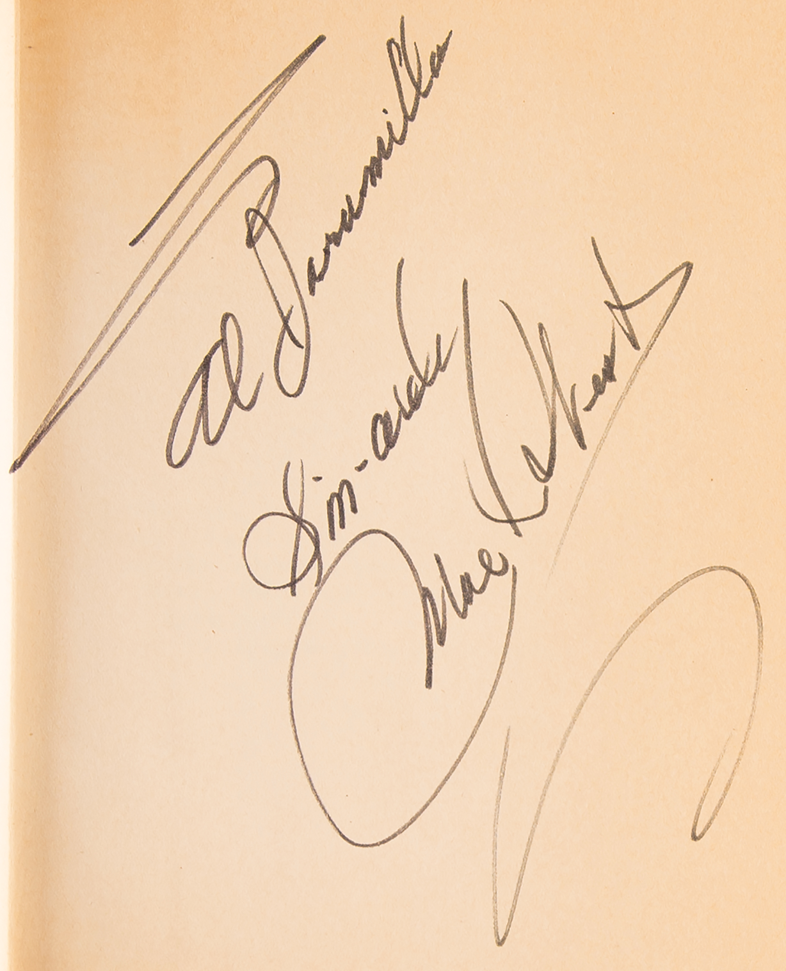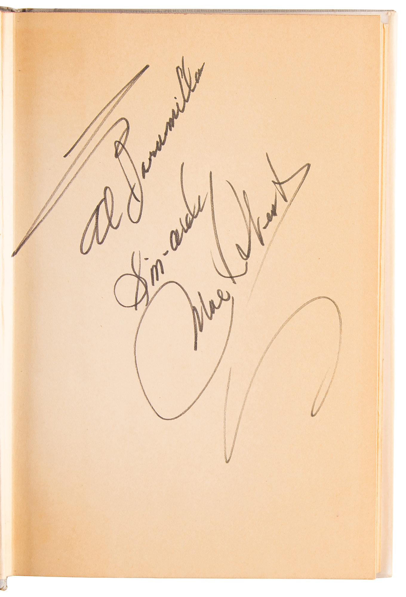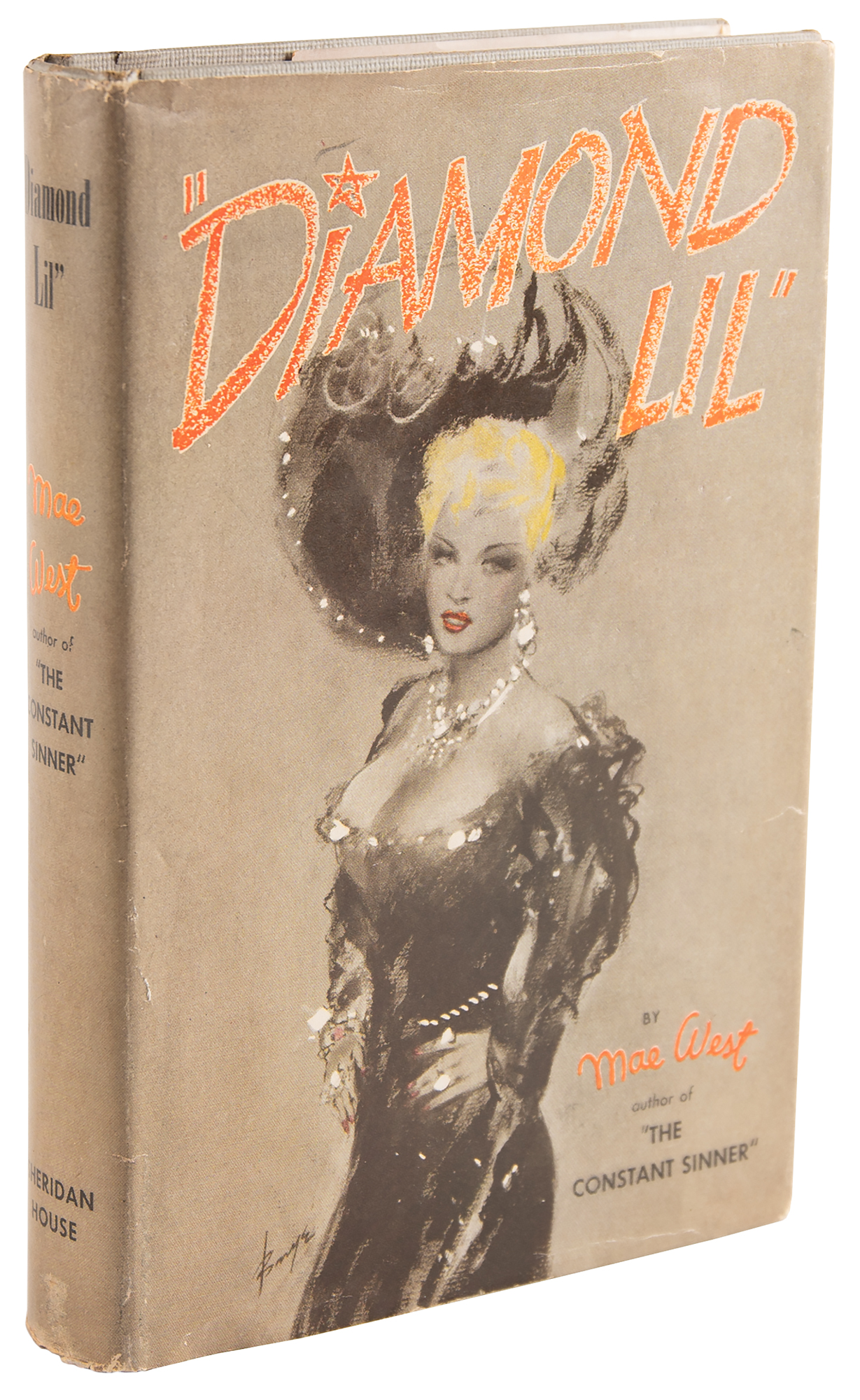 Signed book: Diamond Lil. Later printing. NY: Sheridan House, 1949. Hardcover with dust jacket, 5.5 x 8.25, 256 pages. Signed and inscribed on the first free end page in black felt tip by Mae West. In fine condition, with toning to the page edges.