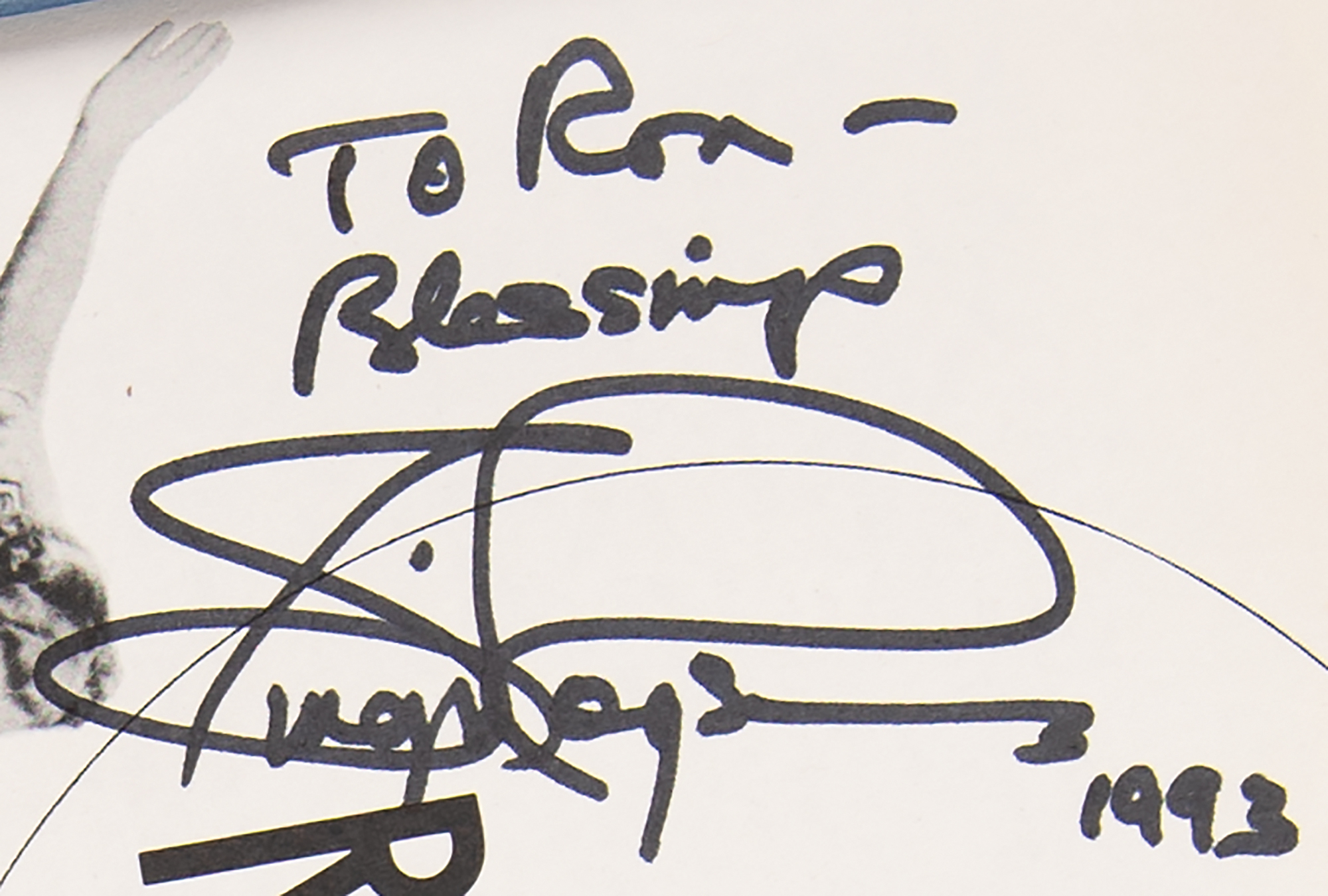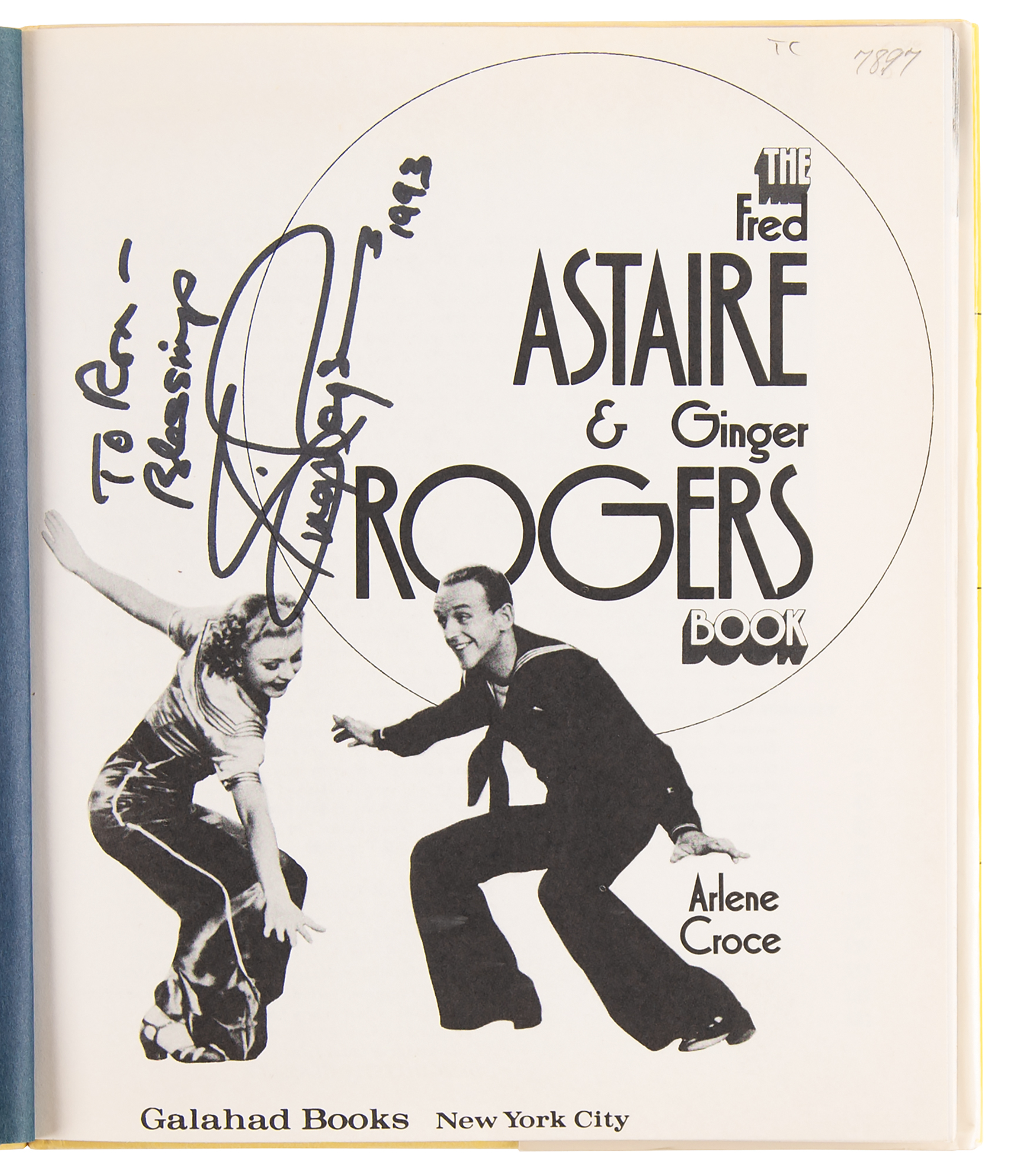 Signed book: The Fred Astaire & Ginger Rogers Book. First edition. NY: Galahad Books, 1972. Hardcover with dust jacket, 7.5 x 8.5, 191 pages. Signed and inscribed on the title page in black felt tip, "To Ron—Blessings, Ginger Rogers." In fine condition.