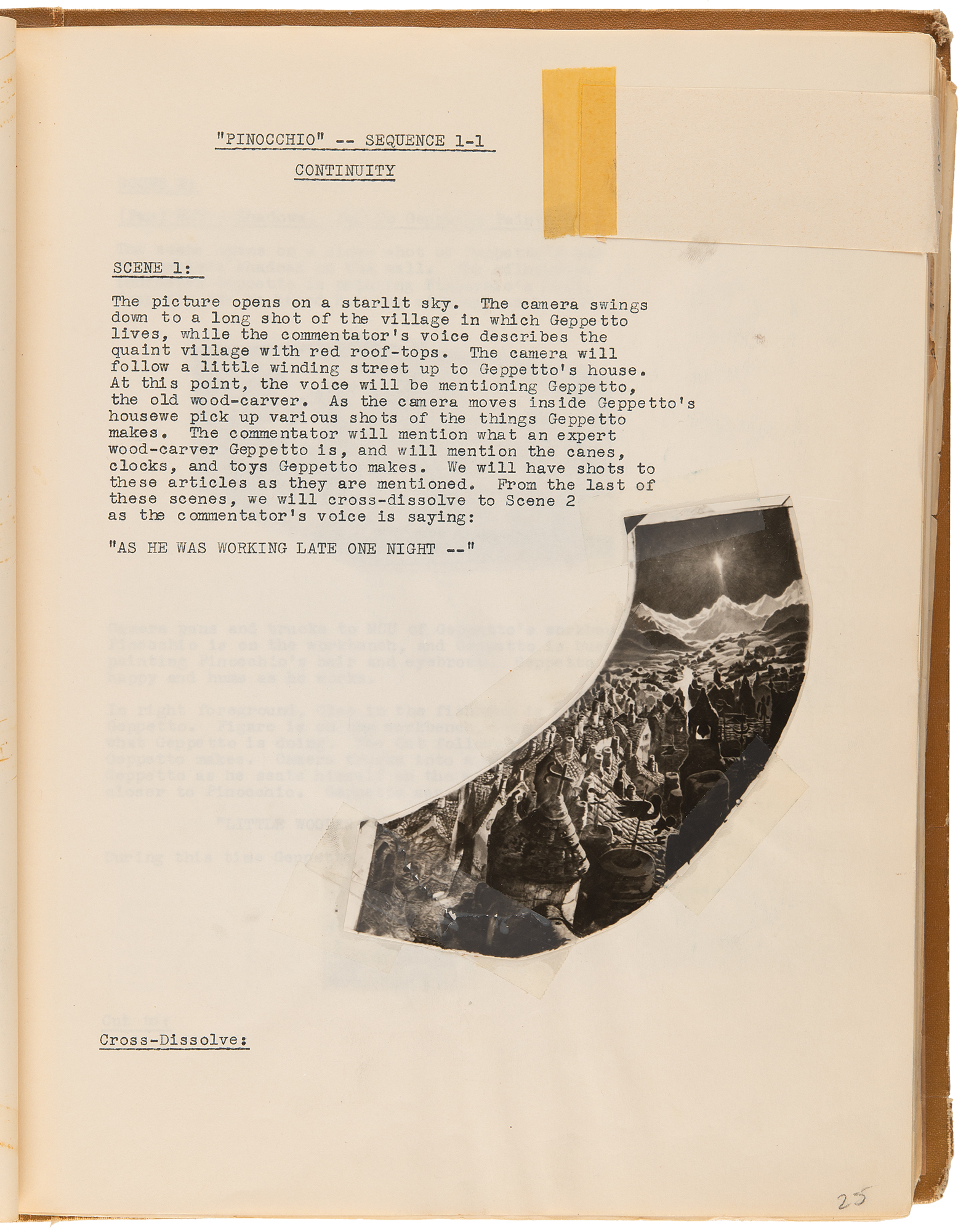 The majority of the pages contain typed captions (some affixed with tape) that feature dialogue or scene descriptions, including several moments forever ingrained in cinematic history. Highlighted captions include: Scene 1, page 1 (“Long shot – Pinocchio book set-up – Cricket is singing the ‘Wishing’ song”); Scene 83, page 68 (“Scene starts on extreme close-up of wishing star in sky. We hear Geppetto, offstage, as he says: ‘Starlight, starbright, first star I see tonight, I wish I may –, I wish I might…have the wish I make tonight”); Scenes 84 and 85, page 69 (“Geppetto and Figaro are both looking at the star at the beginning of the scene. Then Geppetto turns toward Figaro and says: ‘You know what I wished, Figaro?’… ‘I wished –’…‘That my little Pinocchio might be a real boy.’”); and Scene 29, page 103 (“C.U. Pinocchio; ‘Am I a real boy?’”). In fine condition, with some wear to binder boards, and several of the tape-affixed captions are becoming loose; the book is missing pages 10, 11, 12, 23, 76, 77, 82, 86, 89, 90, 102, 106, 110, and 117, and page 62 is missing its three photo storyboard images (scenes 68-70). Accompanied by numerous certificates of authenticity from Choice Collectibles ASG.