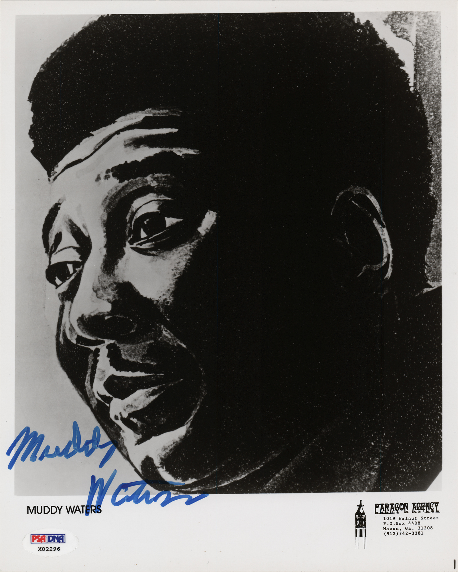 Glossy 8 x 10 Paragon Agency promo photo featuring an artist's portrait of Muddy Waters, signed in blue felt tip by the legendary bluesman. In fine condition, with a PSA/DNA label affixed to the lower corner. Accompanied by a full letter of authenticity from PSA/DNA.