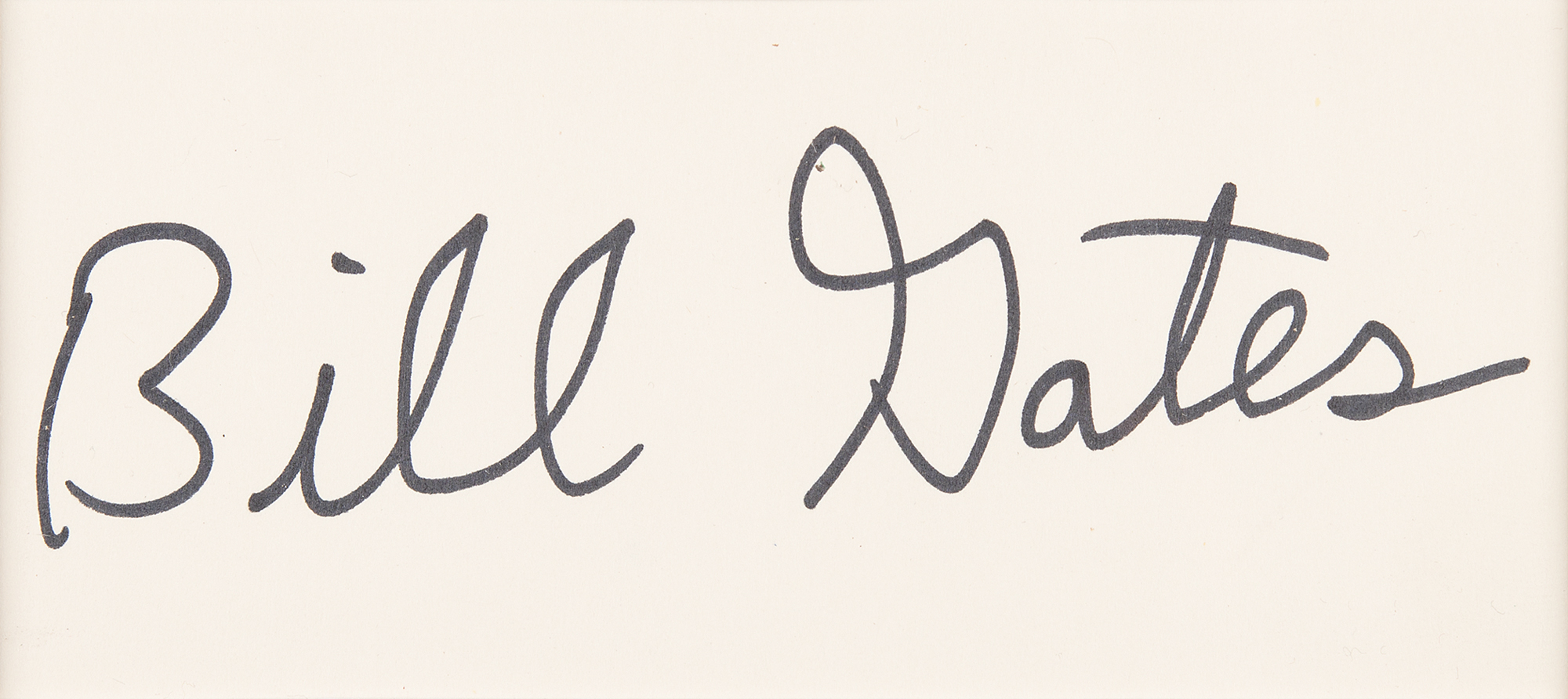 Large felt tip signature, "Bill Gates,” on an off-white 5 x 2.25 sheet. Double-matted and framed with a color portrait of the Microsoft co-founder to an overall size of 14 x 19. In fine condition. Accompanied by a full letter of authenticity from JSA.