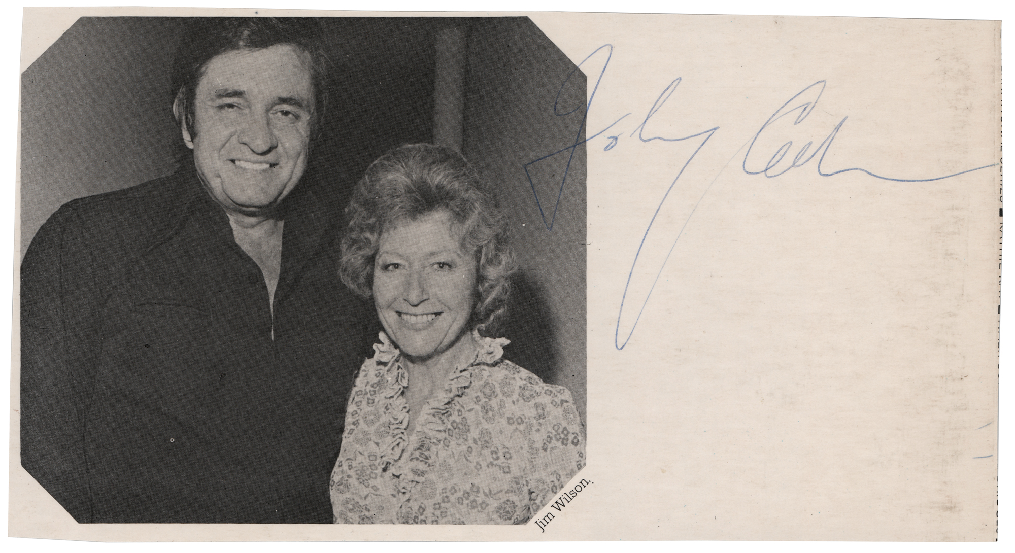 Vintage glossy 8.25 x 4.5 cardstock photo of Johnny Cash posing with an unidentified woman, which has been clipped from the back cover of an album sleeve, signed in blue ballpoint by Cash. In fine condition, with some light scuffing.