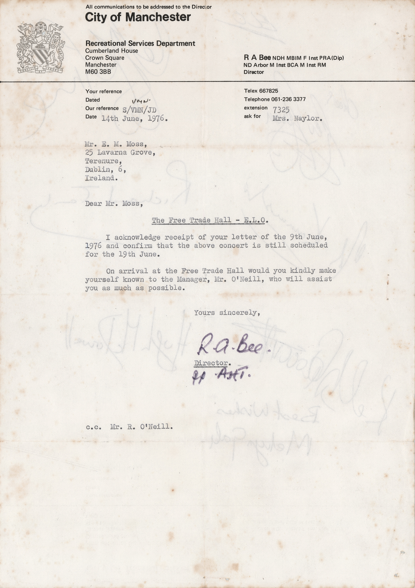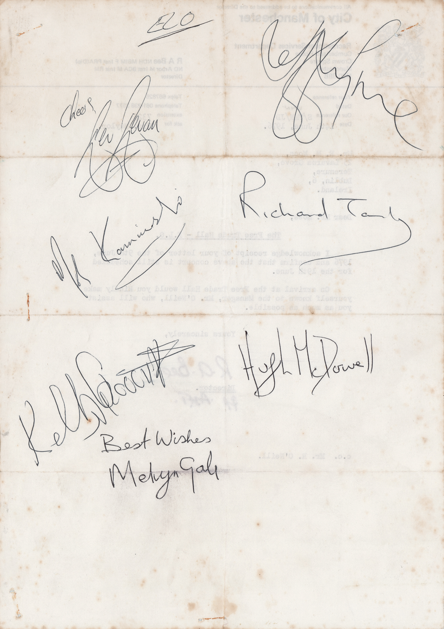 Vintage 1975 ballpoint signatures of Electric Light Orchestra on the reverse of an off-white 8.25 x 11.75 typed letter from the director of the Recreational Services Department of Manchester, England, dated June 14, 1976, affirming that an ELO concert at Free Trade Hall is still scheduled for June 19th. The signatures on the reverse include Jeff Lynne, Bev Bevan, Richard Tandy, Kelly Groucutt, Mik Kaminski, Hugh McDowell, and Melvyn Gale. In very good to fine condition, with scattered light stains, and toning along the intersecting folds.